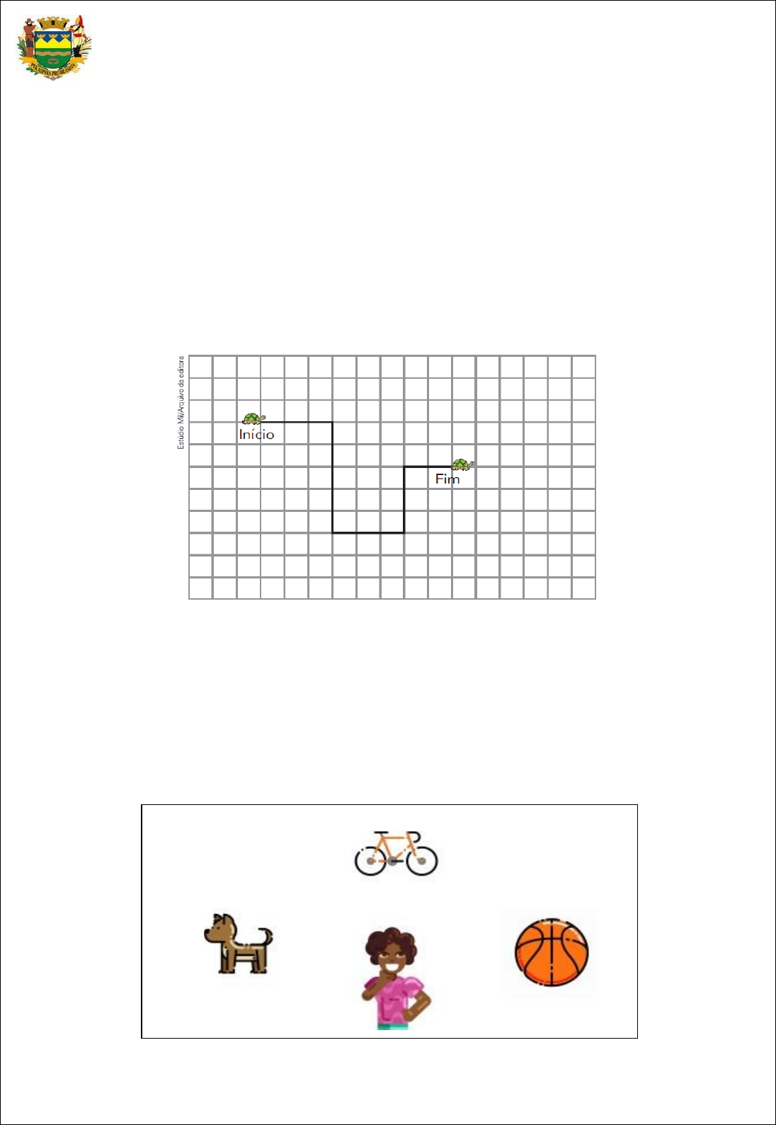 1 PREFEITURA MUNICIPAL DE TAUBATÉ SECRETARIA DE EDUCAÇÃO # ESCOLA SEM MUROS: EM CASA TAMBÉM SE APRENDE! MATEMÁTICA 4º ano Atividade com a habilidade (EF04MA16) Descrever deslocamentos e localização de pessoas e de objetos no espaço, por meio de malhas quadriculadas e representações como desenhos, mapas, planta baixa e croquis, empregando termos como direita e esquerda, mudanças de direção e sentido, intersecção, transversais, paralelas e perpendiculares. 1. OBSERVE O CAMINHO DA TARTARUGA. DEPOIS ASSINALE A ALTERNATIVA QUE CORRESPONDE A ESSE CAMINHO. (a) 2→ 5↓ 2→ 3↑ 2→ (b) 3→ 5↓ 3→ 3↑ 2→ (c) 2→ 5↓ 3→ 2↑ 2→ (d) 3→ 5↓ 2→ 2↑ 2→ 2. ANALISE A IMAGEM ABAIXO E, NA PROXIMA PÁGINA, MARQUE A RESPOSTA CORRETA: 2 Com relação à posição da menina, os objetos estão: (a) A bicicleta está acima da menina; a bola à sua direita e o cachorro à sua esquerda. (b) A bicicleta está em frente a menina; a bola à sua direita e o cachorro à sua esquerda. (c) A bicicleta está acima da menina; a bola à sua esquerda e o cachorro à sua direita. (d) A bicicleta está atrás da menina; a bola à direita e o cachorro à esquerda. 3. OBSERVE A LOCALIZAÇÃO DO CARRO E RESPONDA. - Para chegar ao museu, o carro terá que virar à direita ou à esquerda na rua Acre? - A entrada do museu fica na rua Goiás. Para o carro estacionar na frente do museu, deve virar à direita ou à esquerda? - A resposta correta para o carro chegar ao museu seguindo a mesma direção que está, é: (a) Primeiro virar à direita e depois à esquerda. (b) Primeiro virar à esquerda e depois à direita. (c) Virar duas vezes para a direita. (d) Virar duas vezes para a esquerda. 3 4. OBSERVE A FIGURA ABAIXO. EM QUAL POSIÇÃO ESTÁ A RODA DE TRÁS DO CARRO? A) D3 B) C3 C) B3 D) A3 5. HORA DE JOGAR!! SISTEMA DE NUMERAÇÃO DECIMAL JOGO: 1 A MAIS OU 1 A MENOS, 10 A MAIS OU 10 A MENOS Atividade com a habilidade (EF04MA01) ler, escrever e ordenar números naturais até a ordem de dezenas de milhar. 4 1 2 3 4 5 6 7 8 9 10 11 12 13 14 15 16 17 18 19 20 21 22 23 24 25 26 27 28 29 30 31 32 33 34 35 36 37 38 39 40 41 42 43 44 45 46 47 48 49 50 51 52 53 54 55 56 57 58 59 60 61 62 63 64 65 66 67 68 69 70 71 72 73 74 75 76 77 78 79 80 81 82 83 84 85 86 87 88 89 90 91 92 93 94 95 96 97 98 99 100 5 Número de jogadores: mínimo 2 Recortar cada quadrinho da cartela de números. Serão as fichas numeradas. REGRAS: