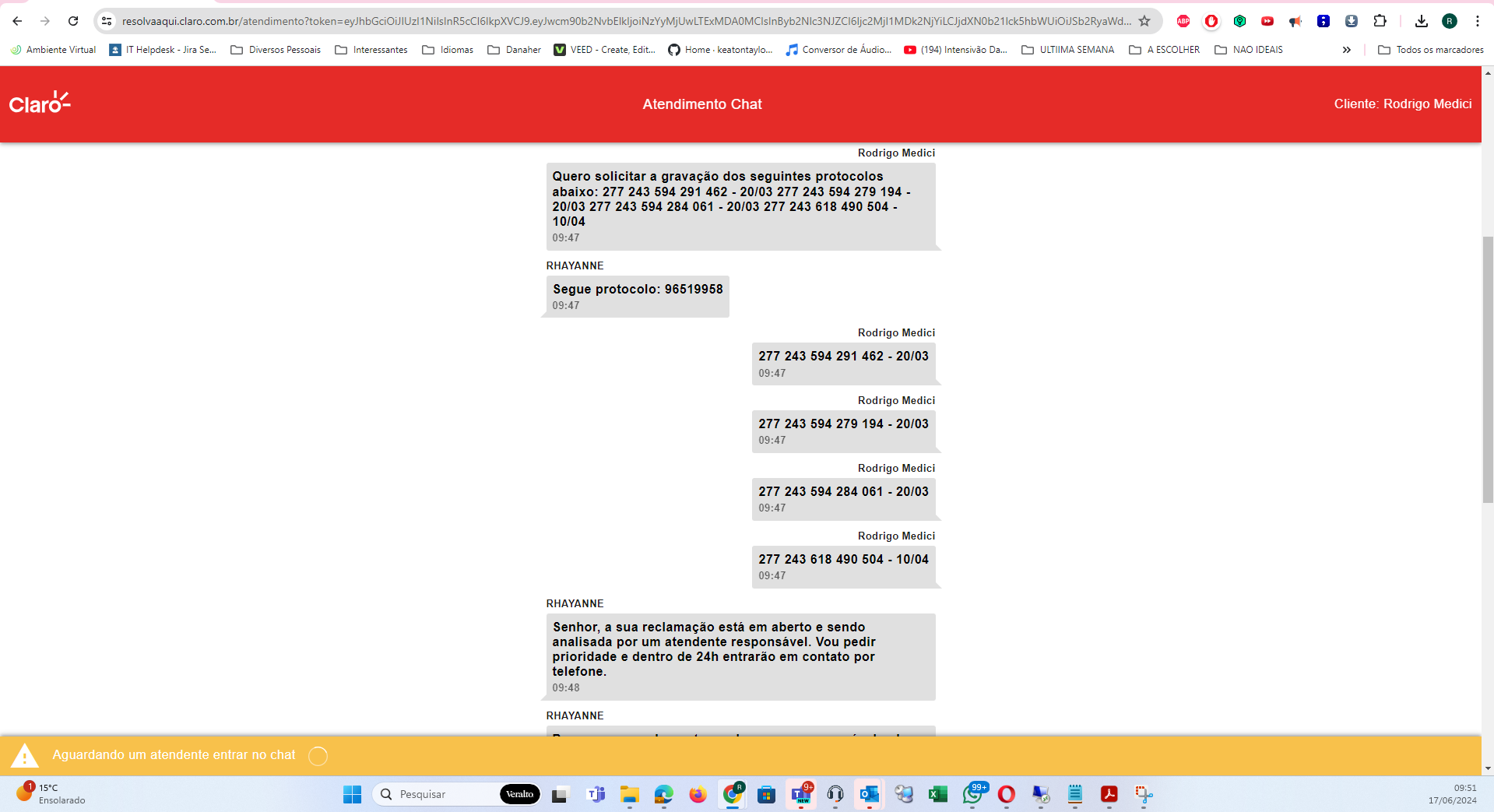 R : Ambiente Virtual IT Helpdesk Jira Se.. Diversos Pessoais Interessantes Idiomas Danaher VEED Create Edit... Home keatontaylo.. Conversor de Áudio.. (194) Intensivão Da... SEMANA A ESCOLHER NAO IDEAIS Todos os marcadores Claro- Atendimento Chat Cliente: Rodrigo Medici Rodrigo Medici Quero solicitar a gravação dos seguintes protocolos abaixo: 277 243 594 291 462 - 20/03 277 243 594 279 194 - - 20/03 277 243 618 490 504 - 10/04 09:47 RHAYANNE Segue protocolo: 96519958 09:47 Rodrigo Medici - 20/03 09:47 Rodrigo Medici 277 243 594 279 194 - 20/03 09:47 Rodrigo Medici 277 243 594 284 061 - 20/03 09:47 Rodrigo Medici 277 243 618 490 504 - 10/04 09:47 RHAYANNE Senhor, a sua reclamação está em aberto e sendo analisada por um atendente responsável. Vou pedir prioridade e dentro de 24h entrarão em contato por telefone. 09:48 RHAYANNE Aguardando um atendente entrar no chat 15°C Q Pesquisar Veralto T Ensolarado 09:51 17/06/2024