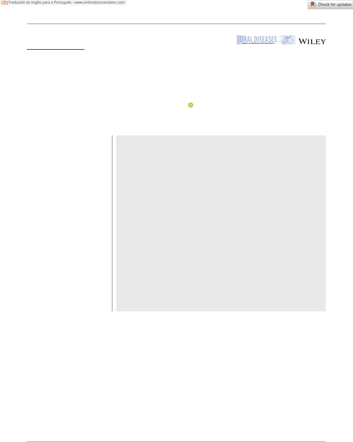 Recebido: 29 de janeiro de 2022|Revisado: 15 de fevereiro de 2022|Aceito: 19 de fevereiro de 2022 DOI: 10.1111/odi.14172 ARTIGO DE REVISÃO Etiologia e associações da halitose: uma revisão sistemática Maaz Responder Memon1|Hifza Responder Memon2 | Shehzad Fahad1|Amna Siddiqui4|Ka Yiu Lee5 Zohaib Yousaf7 Faizan E Muhammad3| |Muhammad Junaid Tahir6| 1Khyber Medical University, Peshawar, Paquistão Abstrato 2Dow University of Health Sciences, Dr. Ishrat Ul Ebad Institute of Oral Health Sciences, Karachi, Paquistão Halitose é um termo que se refere a um odor desagradável ou fétido proveniente da cavidade oral que pode ser causado por fatores intra-orais ou extra-orais. Apesar de a halitose ter etiologia multifatorial, os fatores intra-orais desempenham um papel significativo na maioria dos casos. Esta revisão sistemática avalia as associações intra-orais e extra-orais da halitose. Uma busca eletrônica através do MEDLINE (PubMed), Google Scholar e Wiley Online Library foi realizada para identificar manuscritos relevantes. Foi realizada uma pesquisa baseada em palavras-chave, usando os termos 'halitose', 'mau hálito' e 'causas e etiologia do mau cheiro oral'. Foram incluídos artigos publicados de janeiro de 2014 a dezembro de 2020. Selecionamos estudos avaliando os fatores intra-orais e extra-orais que induzem o mau hálito, assim como os fatores associados a doenças sistêmicas. Oitenta a noventa por cento da halitose é causada por fatores intraorais, sendo a língua saburrosa, as doenças periodontais e as más práticas de higiene bucal os principais fatores. Dez a vinte por cento da halitose é induzida por fatores extra-orais associados a doenças sistêmicas. Múltiplos fatores podem causar halitose, mas a maior parte da etiologia é intra-oral. É necessária uma maior conscientização médica para determinar o processo fisiopatológico real do mau hálito em indivíduos saudáveis. Múltiplos fatores podem causar halitose, mas a maior parte da etiologia é intra-oral. É necessária uma maior conscientização médica para determinar o processo fisiopatológico real do mau hálito em indivíduos saudáveis. Múltiplos fatores podem causar halitose, mas a maior parte da etiologia é intra-oral. É necessária uma maior conscientização médica para determinar o processo fisiopatológico real do mau hálito em indivíduos saudáveis. 3Liaquat College of Medicine and Dentistry, Karachi, Paquistão 4Karachi Medical and Dental College, Karachi, Paquistão 5Centro Sueco de Pesquisa em Esportes de Inverno, Departamento de Ciências da Saúde, Mid Sweden University, Östersund, Suécia 6Lahore General Hospital, Lahore, Paquistão 7Hamad Medical Corporation, Doha, Catar Correspondência Ka Yiu Lee, Centro Sueco de Pesquisa em Esportes de Inverno, Departamento de Ciências da Saúde, Mid Sweden University, 83125 Östersund, Suécia. E-mail:kyle.lee@miun.se Informações de financiamento Nenhum a declarar PALAVRAS-CHAVE hálito, atendimento odontológico, halitose, mau cheiro, cavidade oral, respiração 1|INTRODUÇÃO a prevalência de halitose é entre 24 e 39 por cento. De acordo com a associação odontológica americana, 50% da população adulta já experimentou halitose episódica e 25% tem halitose persistente (Settineri et al.,2010). Vários métodos de detecção estão disponíveis para a halitose. A pontuação organoléptica é a abordagem de detecção padrão-ouro (Bollen & Beikler,2012). O método de pontuação organoléptica é baseado em uma escala que varia de 1 a 5. Uma pontuação de 1 indica que o mau cheiro oral é quase imperceptível, enquanto uma pontuação de 5 indica que o mau cheiro oral é visivelmente desagradável (Armstrong et al.,2010). Outras abordagens diagnósticas incluem cromatografia gasosa (GC) e Halímetro®. O GC é realizado na respiração, saliva e restos de língua (Bollen & Beikler, 2012), enquanto o Halímetro®é um equipamento portátil de detecção de gás que mede instantaneamente o número total de compostos voláteis de enxofre (VSCs), que são a principal fonte de mau hálito. O Halitose é um termo que se refere a um odor desagradável proveniente da cavidade oral (Bornstein et al.,2009; Chen e outros,2016). Yaegaki et ai. definiu a halitose como um odor perceptível com uma gravidade superior a um nível socialmente aceitável. A halitose é um problema de saúde da comunidade que causa constrangimento psicossocial grave (Yaegaki et al.,2014). Condições sistêmicas podem contribuir para a halitose. Alimentos e medicamentos específicos, incluindo o uso habitual de tabaco e álcool, também podem causar mau hálito na boca (Rösing & Loesche,2011; Zalewska et al.,2012 ). A halitose é a causa mais prevalente para os indivíduos que procuram atendimento odontológico, seguida pela cárie dentária e doenças periodontais (Guedes et al.,2019). Uma estimativa precisa da prevalência, no entanto, não está disponível. Estudos recentes estimam 1432|© 2022 Wiley Periodicals LLC wileyonlinelibrary.com/journal/odi Doenças Orais.2023;29:1432–1438. Traduzido do Inglês para o Português - www.onlinedoctranslator.com mailto: https://orcid.org/0000-0001-5577-0940 mailto:kyle.lee@miun.se http://crossmark.crossref.org/dialog/?doi=10.1111%2Fodi.14172&domain=pdf&date_stamp=2022-03-05 https://www.onlinedoctranslator.com/pt/?utm_source=onlinedoctranslator&utm_medium=pdf&utm_campaign=attribution MEMONe outros. |1433 o sentido do olfato pode distinguir várias moléculas orgânicas exaladas (Armstrong et al.,2010; Donaldson e outros,2005). Uma enzima diamina oxidase ligada a um biossensor eletroquímico foi desenvolvida para detectar aminas biogênicas na saliva (Armstrong et al.,2010; Bollen & Beikler,2012). A pseudo-halitose é uma parte da halitose psicogênica. É definido como um odor aparente que não é percebido por outras pessoas, apesar das queixas persistentes do paciente (Yaegaki & Coil,2000; Zaitsu et al.,2011). Doze