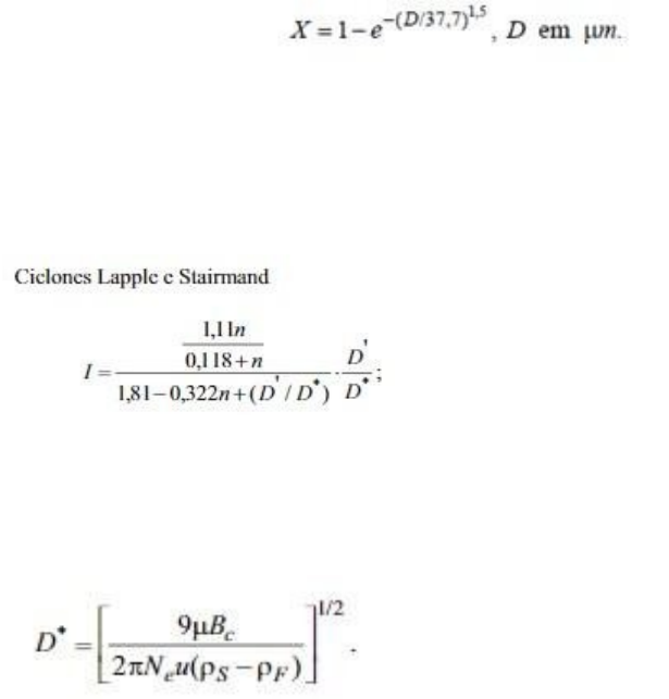 Escola de Química e Alimentos – EQA 02264 – Operações Unitárias I 1º Bimestre - 1º Semestre/2024 Professor: Luiz Antonio de Almeida Pinto GRUPO 5: Andressa Freitas (111680) e Marry Araujo (111612) Prova - Exercícios III - Ciclonagem GRUPO 5) 5- Deseja-se especificar uma bateria de ciclones Lapple para operar com 100 m3/min de gás carregado com cinzas de carvão. Densidade das partículas de carvão é 2,3 g/cm3. São as seguintes as propriedades do gás: massa específica de 4,43×10-1 g/cm3 e viscosidade de 0,035 cP (centipoise). A bateria deve funcionar com descarga de sólida intermitente e deseja-se uma eficiência global de coleta superior a 85%. Distribuição granulométrica das partículas: Cálculo do Diâmetro de Corte Este cálculo resulta da equação abaixo: Onde: I = 0,85; D’ = 37,7µm; n = 1,5 e D* = 6,0 µm Estimativa de Dc Utilizando u = 15,0 m/s como recomendado na tabela abaixo e sabendo que Bc x Hc = D2c / 8 e o diâmetro da parte cilíndrica do ciclone é Dc = 49,6cm Então: N = Q / Q1 = 3,6. Estimativa de Dc considerando 4 ciclones A vazão de cada ciclone é dada por Q1 = Q / 4 = 25m3/min Sabendo que através da equação que Dc = 48cm, levando a uma velocidade u = 14,5 m/s (valor dentro da faixa recomendada para operação de ciclone Lapple) Cálculo da Potência do Soprador Dados: P em cv Q em m³/s ∆p1 em mm E é a eficiência elétrica do motor Pelo resultado da equação, temos: E da equação: Com os dados da Tabela 1, chegamos em P = 2cv. Conclusões A partir desses resultados chega-se às especificações: Quatro unidades em paralelo com Diâmetro Dc = 0,48m ou Dc = 48cm; Velocidade do gás u = 14,5 m/s (dentro da faixa recomendada); Potência do soprador P = 2cv. image5.jpg image7.jpg image2.jpg image4.jpg image1.jpg image3.jpg image6.jpg