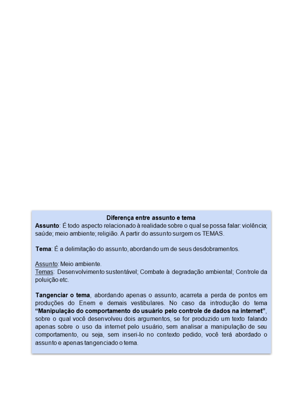Redação 3ª série Ensino Médio – Redação Paulista Atividade: copie no seu caderno Todo texto deve ser construído acerca de um tema específico, previamente estipulado, e precisa seguir a seguinte estrutura: ● Introdução: Apresentação da tese, a opinião resumida do autor sobre o tema. O que será defendido ao longo do texto. ● Desenvolvimento: É quando os argumentos são apresentados para a defesa da tese, a justificativa do ponto de vista do locutor. ● Conclusão: A finalização deve sintetizar o que foi defendido ao longo do texto, retomando a tese e, preferencialmente, propondo uma intervenção para o problema. Colocando em prática: desenvolvendo o texto dissertativo-argumentativo Após apresentar uma tese sobre determinado tema na introdução do texto e defendê-la com argumentos no desenvolvimento, é necessário fazer a conclusão do texto dissertativo-argumentativo. A finalização deve sintetizar o que foi defendido ao longo do texto, retomando a tese e, preferencialmente, propondo uma intervenção para o problema. Dicas para a produção de texto: Retome os dois argumentos já desenvolvidos nas aulas anteriores e redija a introdução (defendendo sua tese) e a conclusão de seu texto (preferencialmente com uma proposta de intervenção) sobre o tema “Manipulação do comportamento do usuário pelo controle de dados na internet”. Selecione, organize e relacione, de forma coerente e coesa, argumentos e fatos para defesa de seu ponto de vista. image1.png