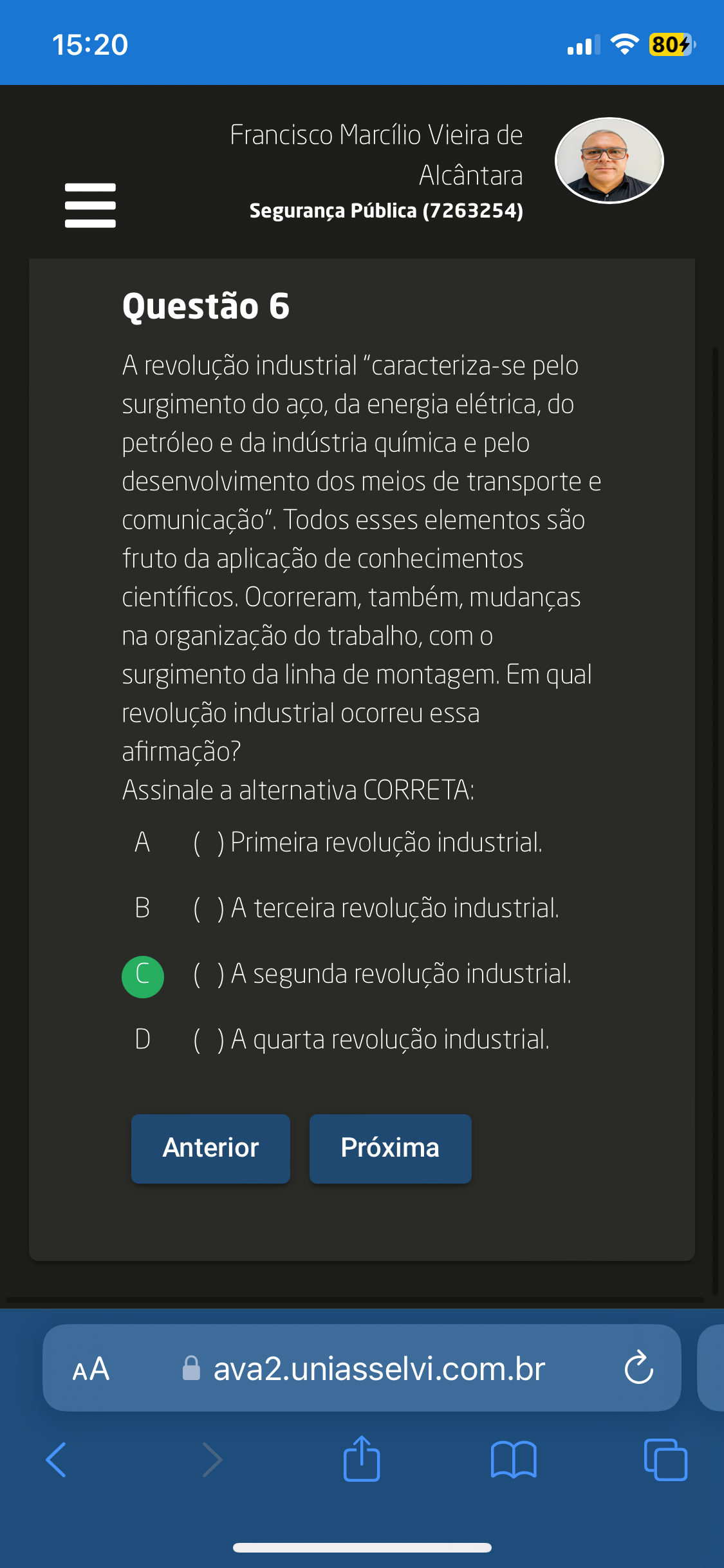 15:20 804 Francisco Marcílio Vieira de Alcântara Segurança Pública (7263254) Questão 6 A revolução industrial "caracteriza-se pelo surgimento do aço, da energia elétrica, do petróleo e da indústria química e pelo desenvolvimento dos meios de transporte e comunicação". Todos esses elementos são fruto da aplicação de conhecimentos científicos. Ocorreram, também, mudanças na organização do trabalho, com O surgimento da linha de montagem. Em qual revolução industrial ocorreu essa afirmação? Assinale a alternativa CORRETA: A ( ) Primeira revolução industrial. ( ) A terceira revolução industrial. C ( ) A segunda revolução industrial. D ( ) A quarta revolução industrial. Anterior Próxima AA ava2.uniasselvi.com.br