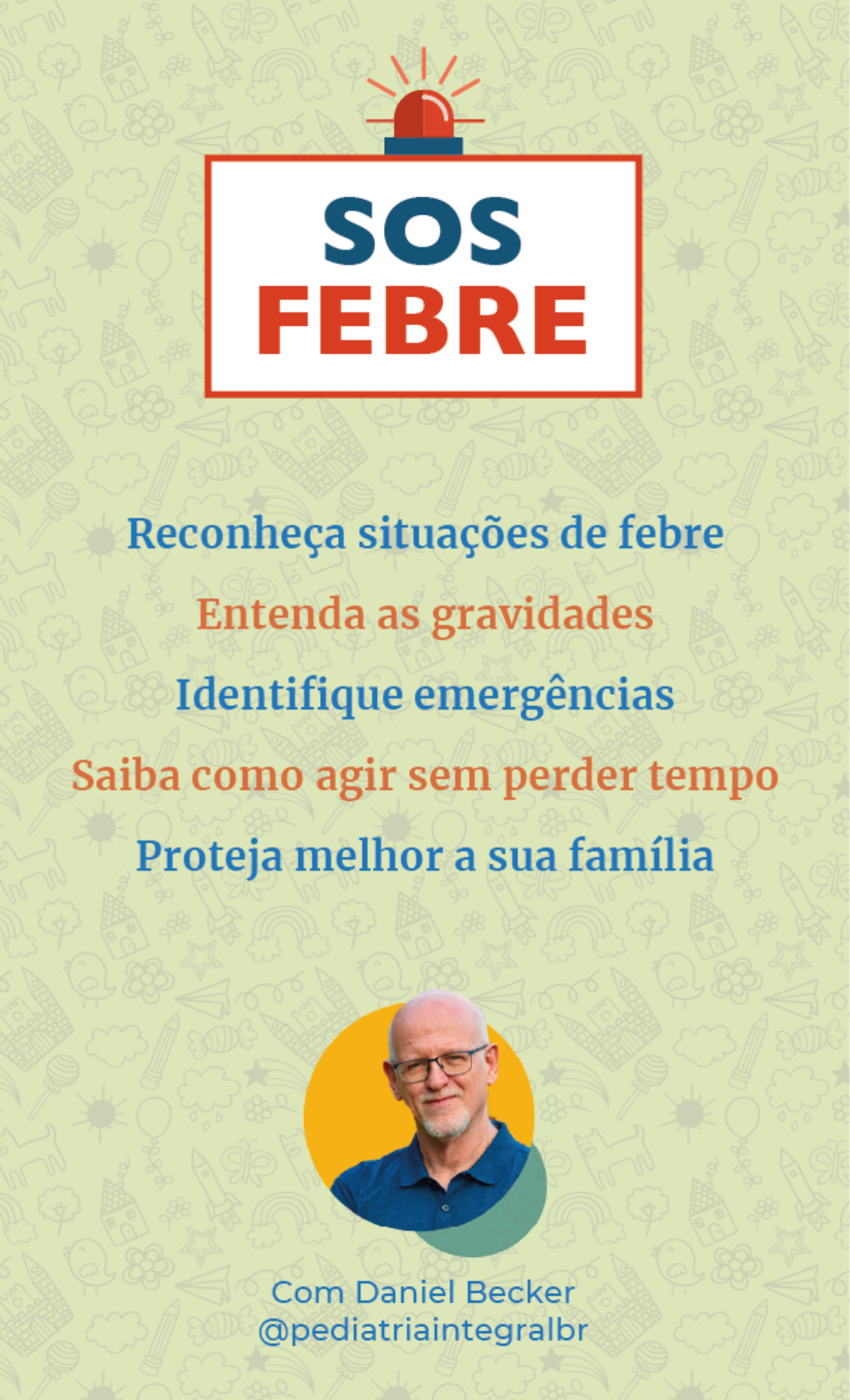 Olá! Este ebook é um presente para quem se inscreveu na minha Masterclass sobre a 1ª infância (0-6 anos), marcada para o dia 30/01/24, às 20h. Se você ainda não se inscreveu para receber o link do encontro, toque no botão abaixo e complete sua inscrição. Será AO VIVO, totalmente gratuito, para dialogar commães, pais, avós, familiares e quemmais desejar refletir sobre este período crucial da vida dos nossos filhos. https://danielbecker.com.br/tutoria-primeira-infancia/?utm_medium=whatsapp&utm_source=org Introdução Oi, tudo bem com você? Fico muito feliz por você ter se interessado, e confiado, neste material que organizei com os principais tópicos sobre a febre, uma das situações de emergência mais comuns no cotidiano de quem tem filho. Decidi preparar este e-book depois de presenciar a angústia de mães e pais nos meus muitos anos de consultório e atendimento hospitalar. A primeira febre do bebê, então, deixa os pais sem ação. Há muita informação não confiável e mesmo crenças sobre como lidar com a febre. Vou compartilhar com você nas próximas páginas o conhecimento que acumulei. Fiz de uma forma bem didática para que você se envolva e termine a leitura preparada para perceber quando a febre começa, como avaliar se é grave ou não, quais os passos seguintes e quando é o caso de pedir ajuda profissional. Agora, vamos ao nosso tema: febre. Tenho certeza que com este e-book você se sentirá mais preparada e segura para proteger a saúde e o bem-estar de toda a sua família. Muito obrigado pela confiança – depois me conta o que achou mandando uma mensagem pelo @pedriatriaintegralbr. Prometo tentar responder. Um abraço, Daniel "A febre pode ser nossa amiga." Daniel Becker O que causa a febre? Muitas condições podem gerar aumento de temperatura, mas a mais comum, de longe, são as infecções. Quando ummicróbio (vírus, bactérias, etc), penetra no nosso organismo, ou entra em desequilíbrio com nosso microbioma e cresce demais, vai provocar inflamação. Aí, o sistema imunológico aciona uma parte do cérebro chamada hipotálamo. Ele funciona como um termostato que regula a temperatura do corpo. Ao receber o sinal imunológico através de certas substâncias inflamatórias, ele aciona os mecanismos de elevação da temperatura, especialmente o aumento da atividade muscular. Ele provoca também uma vasoconstrição na pele para que o sangue chegue menos à superfície, evitando a perda de calor pela pele. Com isso, quando a febre sobe, as mãos e pés (em especial) podem ficar geladinhas e até levemente cianóticas (arroxeadas). Isso acontece junto com os calafrios que traduzem o tremor muscular. Nesse momento, você também vai notar uma aceleração da respiração e do coração pois o metabolismo aumenta muito. Uma criança que respira rápido, durante a subida da febre ou com febre alta, não significa que está com doença respiratória. Por isso tudo, a febre não deve ser combatida indiscriminadamente, mas apenas quando causar mais desconforto. Isso ocorre especialmente nas febre altas, de 38.5 para cima. Algumas crianças, no entanto, podem ser mais sensíveis. Outro mito muito comum que precisa ser desfeito: a febre não causa convulsão, ela é apenas um fator desencadeante em crianças que têm a predisposição. A primeira febre de um filho é sempre extremamente angustiante. Ela é o nosso primeiro contato com amortalidade de um ser humano. Todos temos a fantasia que nosso filho pode ser imortal, eterno. Ele pode ser o Super-homem, o Messias ou a Mulher Maravilha: até acontecer a primeira febre isso poderia ser verdade. A primeira febre torna nosso filho mortal. Isso gera um luto simbólico entre pais e mães, e uma grande angústia. Aliás, a primeira febre de um bebê muitas vezes é causada pelo exantema súbito ou roséola. O bebê fica três dias com febre, às vezes alta, mas mantendo um bom estado geral quase o tempo todo. No terceiro ou quarto dia surge uma erupção arroseada e leve na pele, como se fosse um sarampinho, e a febre some. Logo em seguida a erupção evanesce. Mais de 90% das febres em crianças resultam de infecção por vírus. Não é à toa que os pediatras levam a fama de “pra ele tudo é virose”. Geralmente é. O bom pediatra é aquele que sabe distinguir quando não é, e evitar medicar indevidamente quando é. As febres das infecções virais geralmente curam espontaneamente em 3 a 4 dias, e a criança não precisa de nenhumamedicação específica, nem antibióticos, nem cortisona. Além dos antitérmicos (usados com critério), apenas água e sintomáticos, como soro nasal nas gripes. VITAMINA C ARTIFICIAL NÃO ADIANTA! Use frutas. Como expliquei acima, é normal uma criança ter mãos frias e cabeça mais quente durante a febre. Não é sinal de meningite. A história natural de uma virose típica Os dois primeiros dias são mais angustiantes: a febre pode permanecer bastante alta, responder pouco ao antitérmico, e a criança fica bastante prostrada e sem apetite. Do terceiro para o quarto dia, ela geralmente começa a melhorar, a febre vai cedendo, vindo mais baixa e commenos frequência, o apetite e a energia vão voltando. Claro que isso é muito variável de acordo com o tipo de vírus, o estado prévio e a reação da criança e a evolução da doença. Por isso é sempre bommanter contato com o pediatra. Quando se preocupar? Na fase mais aguda, com a criança bem doentinha, como distinguir se precisamos ou não levar a emergência? Faça como os pediatras: observe o estado geral da criança. Se ela ficar razoavelmente bem quando a febre abaixar um pouco, se pede água - ou comida em especial -, se sorri e quer brincar um pouco, não há motivo para pânico. Agora se uma criança, mesmo com a febre baixa, permanece muito prostrada, sem comer nada, sem querer brincar e sem sorrir, apresenta comportamentos estranhos, como choro constante, irritabilidade intensa ou sonolência persistente