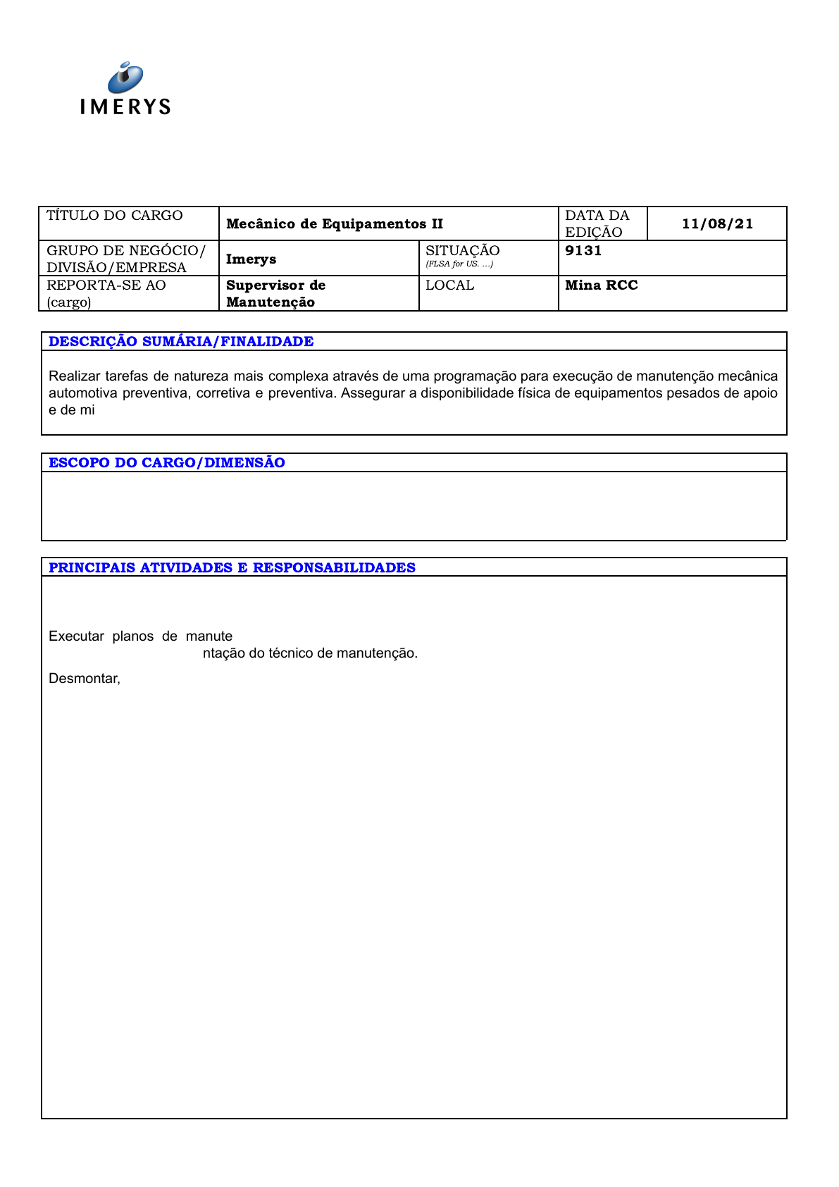 DESCRIÇÃO DE CARGOS TÍTULO DO CARGO Mecânico de Equipamentos II DATA DA EDIÇÃO 11/08/21 GRUPO DE NEGÓCIO/ DIVISÃO/EMPRESA Imerys SITUAÇÃO (FLSA for US. …) 9131 REPORTA-SE AO (cargo) Supervisor de Manutenção LOCAL Mina RCC DESCRIÇÃO SUMÁRIA/FINALIDADE Realizar tarefas de natureza mais complexa através de uma programação para execução de manutenção mecânica automotiva preventiva, corretiva e preventiva. Assegurar a disponibilidade física de equipamentos pesados de apoio e de mineração, visando continuidade operacional e segurança. ESCOPO DO CARGO/DIMENSÃO Manutenção de equipamentos móveis de superfície da mina RCC. Housekeeping na mina, oficina e planta. PRINCIPAIS ATIVIDADES E RESPONSABILIDADES Executar serviços de manutenção mecânica em equipamentos de frota, cumprindo a programação de manutenção preventiva e corretiva. Executar planos de manutenção preventiva e corretiva em equipamentos da mina conforme programação do planejamento, sob a orientação do técnico de manutenção. Desmontar, reparar e montar subconjuntos e componentes mecânicos, hidráulicos e pneumáticos. Diagnosticar falhas em peças e componentes. Utilização de instrumentos de medição de grandezas mecânicas. Acompanhar o desempenho de máquinas e equipamentos, realizando inspeções preventivas, identificando anomalias, solicitando manutenções. Trabalhar seguindo normas de segurança, higiene, qualidade e proteção ao meio ambiente. Realizar check-list de equipamentos detectando anomalias, registrando-as, e acompanhando os reparos de maior complexidade. Fazer a manutenção geral e calibração de conjunto rotativo de deslocamento de equipamentos. Fazer a lubrificação de equipamentos. Executar trabalhos de solda nos equipamentos, conchas e básculas. Efetuar testes em equipamentos reparados, liberando-os para utilização na operação. Orientar profissionais menos experientes, bem como acompanhar, instruir em campo e sanar todas as dúvidas pertinentes. Seguir todas as normas e procedimentos de segurança de modo a sensibilizar colaboradores e gestores. Manter limpa a área de trabalho e os equipamentos. Executar demais atividades que sejam inerentes ao seu cargo. Reportar ao superior imediato quaisquer irregularidades de segurança e operacionais. OUTRAS FUNÇÕES IMPORTANTES Apoiar a análise de falhas de equipamentos. Acompanhamento da disponibilidade física dos equipamentos de mina. Prever a substituição de ferramentas de penetração no solo e outros materiais de desgaste aplicados nos equipamentos. Housekeeping. ESPECIFICAÇÕES DO TRABALHO Educação e experiência requeridas Ensino médio completo. Curso profissionalizante em mecânica. Carteira de habilitação categoria “D”. Experiência em carteira de trabalho de 3 anos Conhecimentos, habilidades e outras características Conhecimentos: Manutenção mecânica, pneumática e hidráulica de equipamentos móveis de superfície. Soldagem com eletrodo, MIG e MAG. Conhecimento em sistemas de lubrificação. Habilidades: Ter total atenção e responsabilidade. Trabalhar sobre pressão. Aprender com rapidez. Sabe lidar com imprevistos. Ser flexível. Ter habilidade e atitudes para resolver eventuais problemas na operação. Adotar atitudes e valores essenciais. RESPONSABILIDADES DE EHS - Cumprir a legislação aplicável à sua atividade e as normas internas e recomendações da Imerys referentes a Meio Ambiente, Segurança do Trabalho e Saúde Ocupacional. Comply with the legislation applicable to your activity and with Imerys' internal standards and recommendations regarding the Environment, Labor Safety and Occupational Health. - Executar suas atividades conforme descrito nas Ordens de Serviço/ Procedimentos e Orientações diretas quanto às precauções a serem seguidas para evitar acidentes do trabalho ou doenças ocupacionais. Perform your activities as described in the Service Orders/Procedures and Direct Orientation as to the precautions to be followed to avoid work accidents or occupational diseases. - Cumprir os procedimentos de Segurança através da execução de Análises de Riscos, Liberação de Serviços, Take 5, LOTO , Proativos , Direito de Recusa e participação em DDS. Comply with Safety procedures by performing Risk Analysis, Service Release, Take 5, LOTO , Proactive , Right to Refuse and participating in DDS. - Executar com o apoio da Liderança pequenas melhorias em prol da Segurança, Meio Ambiente e Saúde Ocupacional. Execute with Leadership support minor improvements for Safety, Environment, and Occupational Health. - Atuar junto aos colegas orientando quanto à forma segura de desenvolver as atividades. Work closely with colleagues providing guidance on how to safely carry out the activities. - Interditar e bloquear as situações que caracterizem risco grave a pessoas, meio ambiente e saúde ocupacional. Interdict and block the situations that characterize serious risk to people, environment, and occupational health. APROVAÇÃO Presidência: Gerente DGP: