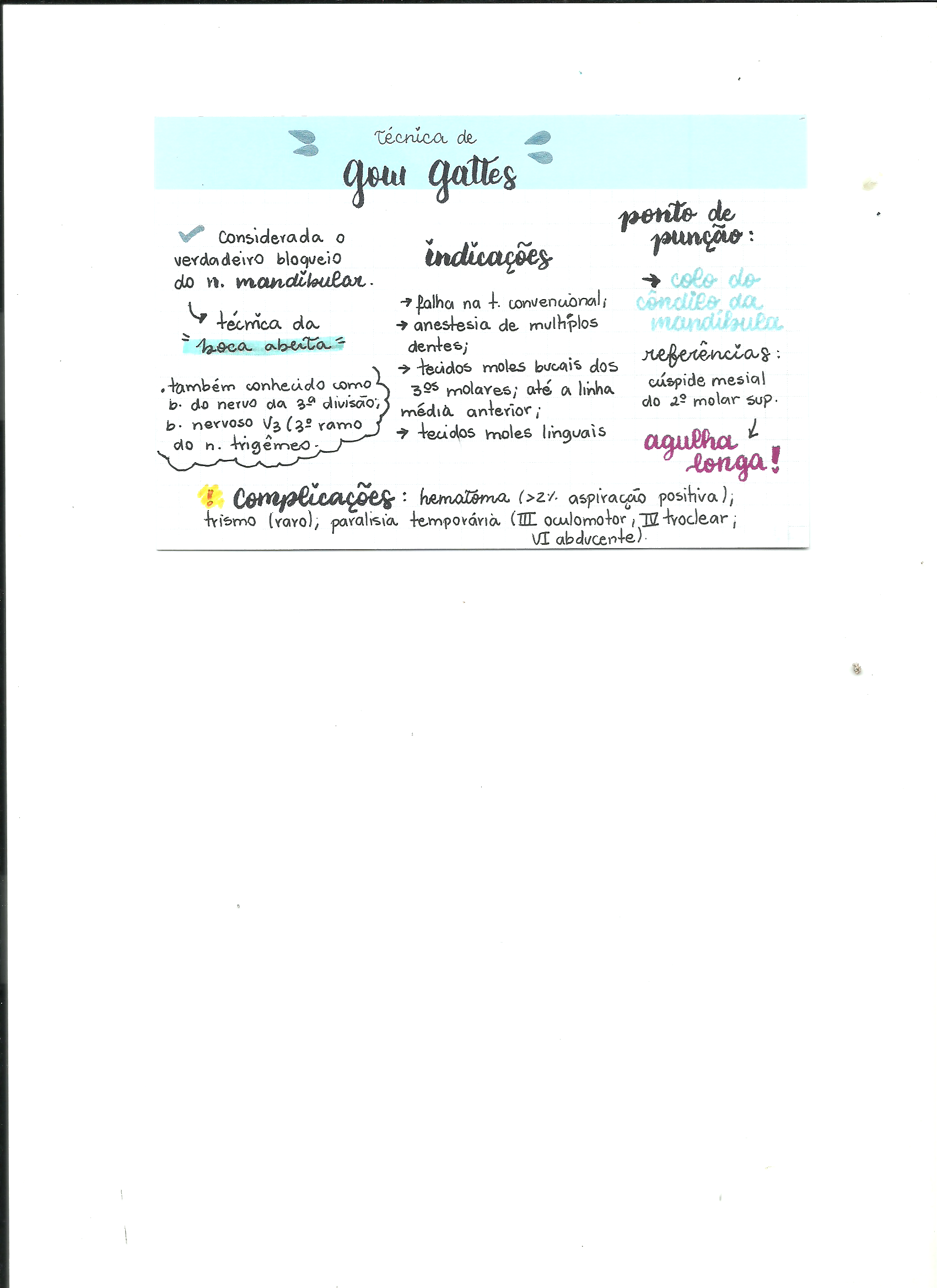 Técnica de gattes ponto de indicações verdadeiro bloqueio do n. mandibular. colo do falha na t. da tecmica da anestesia de multiplos mandibula boca aberta dentes; tecidos moles bucais dos também conhecido como molares; até a linha cuspide mesial b. do nervo da média do molar sup. b. nervoso V3 ramo do n. tecidos moles linguais agulha longa hematoma (>2% trismo paralisia temporaria (III IV VI abducente).