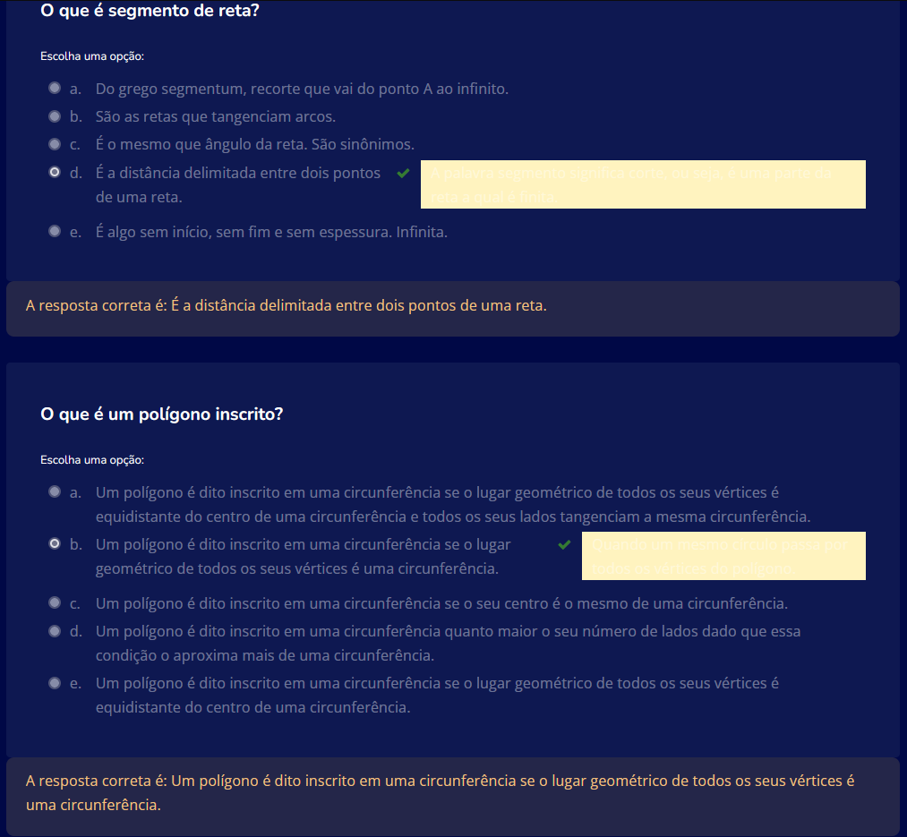 que é segmento de reta? Escolha uma opção: a. Do grego segmentum, recorte que vai do ponto A ao infinito. b. São as retas que tangenciam arcos. C. É mesmo que ângulo da reta. São sinônimos. d. É a distância delimitada entre dois pontos palavra segmento significa corte ou seja, uma parte de uma reta. e. É algo sem início, sem fim e sem espessura. Infinita. A resposta correta é: É a distância delimitada entre dois pontos de uma reta. que é um polígono inscrito? Escolha uma opção: a. Um polígono é dito inscrito em uma circunferência se lugar geométrico de todos os seus vértices é equidistante do centro de uma circunferência e todos os seus lados tangenciam a mesma circunferência. b. Um polígono é dito inscrito em uma circunferência se lugar Quando um mesmo circulo passa geométrico de todos os seus vértices é uma circunferência. todos os do poligono C. Um polígono é dito inscrito em uma circunferência se seu centro é mesmo de uma circunferência. d. Um polígono é dito inscrito em uma circunferência quanto maior seu número de lados dado que essa condição aproxima mais de uma circunferência. e. Um polígono é dito inscrito em uma circunferência se lugar geométrico de todos os seus vértices é equidistante do centro de uma circunferência. A resposta correta é: Um polígono é dito inscrito em uma circunferência se lugar geométrico de todos os seus vértices é uma circunferência.