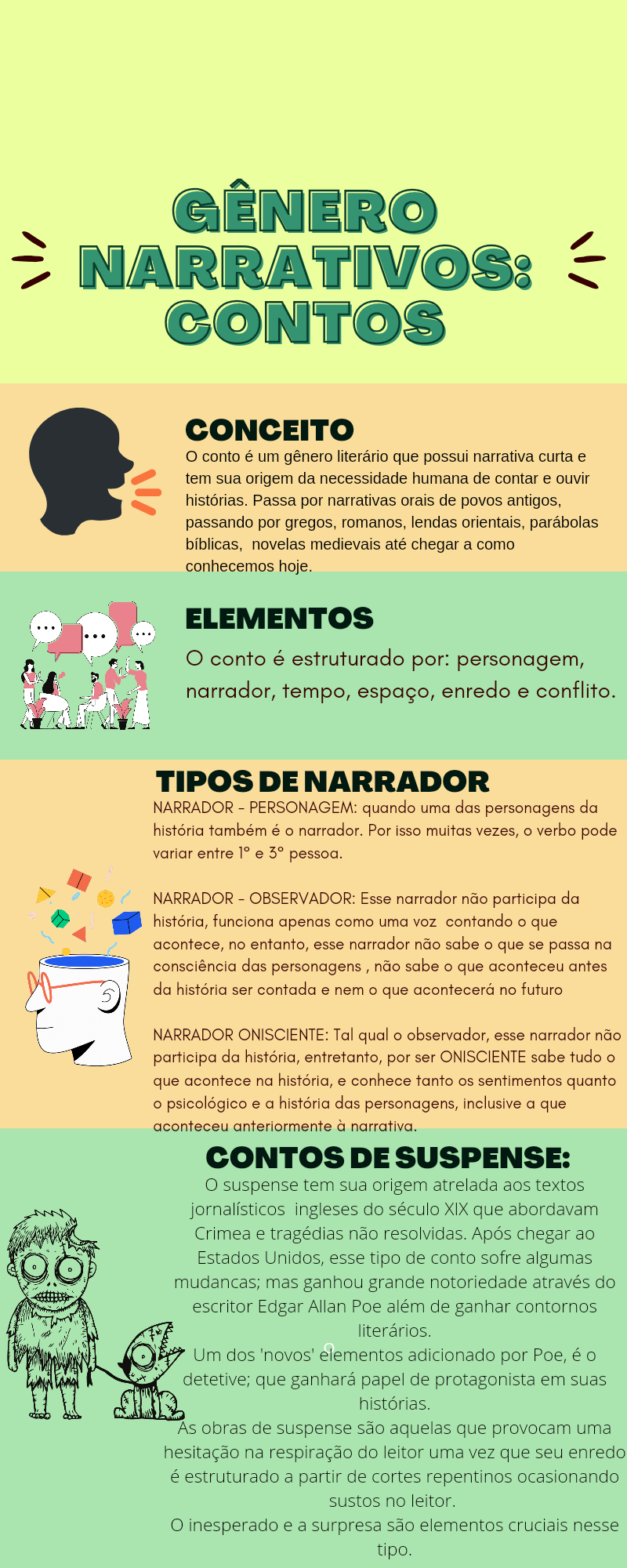 NARRATIVOS: CONTOS CONCEITO conto é um gênero literário que possui narrativa curta e tem sua origem da necessidade humana de contar e ouvir histórias. Passa por narrativas orais de povos antigos, passando por gregos, romanos, lendas orientais, parábolas bíblicas, novelas medievais até chegar a como conhecemos hoje. ELEMENTOS conto é estruturado por: personagem, narrador, tempo, espaço, enredo e conflito. TIPOS DE NARRADOR NARRADOR - PERSONAGEM: quando uma das personagens da história também é o narrador. Por isso muitas vezes, o verbo pode variar entre 1° e pessoa. NARRADOR OBSERVADOR: Esse narrador não participa da história, funciona apenas como uma voz contando que acontece, no entanto, esse narrador não sabe que se passa na consciência das personagens não sabe que aconteceu antes 5 da história ser contada e nem o que acontecerá no futuro NARRADOR ONISCIENTE: Tal qual observador, esse narrador não participa da história, entretanto, por ser ONISCIENTE sabe tudo que acontece na história, e conhece tanto os sentimentos quanto o psicológico e a história das personagens, inclusive a que aconteceu anteriormente à narrativa. CONTOS DE SUSPENSE: O suspense tem sua origem atrelada aos textos jornalísticos ingleses do século XIX que abordavam Crimea e tragédias não resolvidas. Após chegar ao Estados Unidos, esse tipo de conto sofre algumas mas ganhou grande notoriedade através do escritor Edgar Allan Poe além de ganhar contornos literários. Um dos 'novos' elementos adicionado por Poe, é detetive; que ganhará papel de protagonista em suas histórias. As obras de suspense são aquelas que provocam uma hesitação na respiração do leitor uma vez que seu enredo é estruturado a partir de cortes repentinos ocasionando sustos no leitor. O inesperado e a surpresa são elementos cruciais nesse tipo.