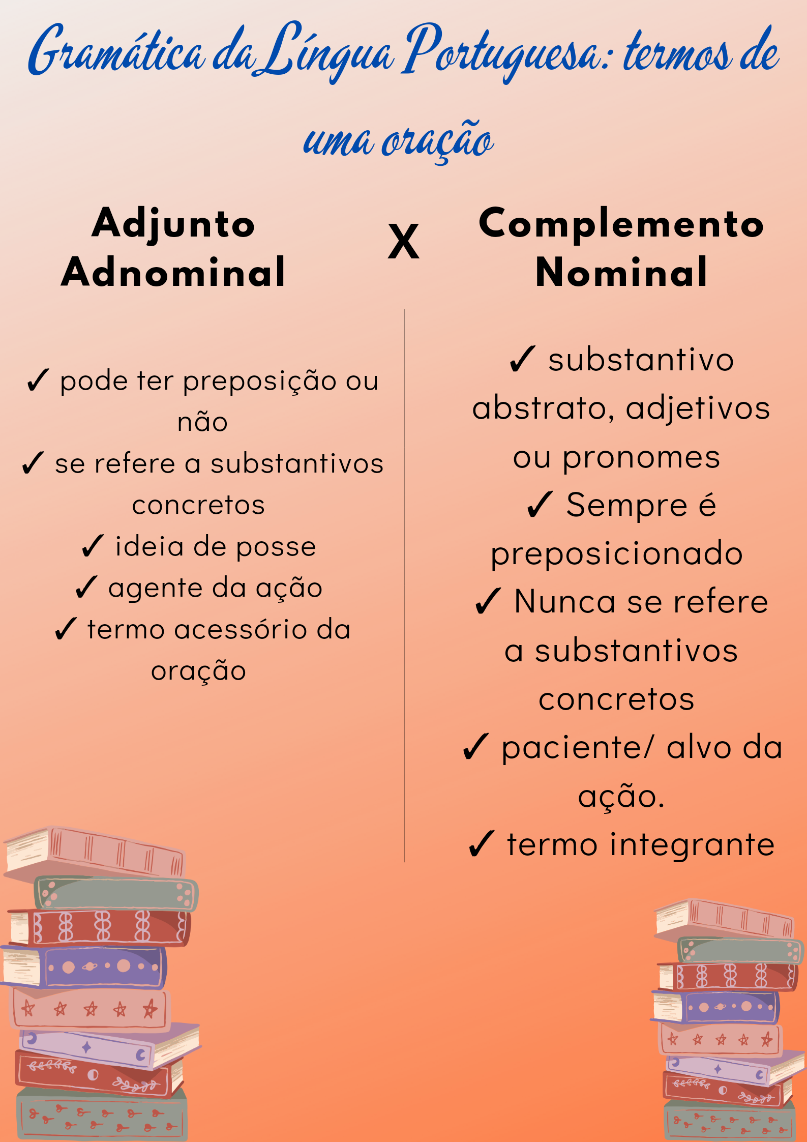 Gramática da Lingua Portuguesa: termos de uma oração Adjunto X Complemento Adnominal Nominal substantivo pode ter preposição ou não abstrato, adjetivos se refere a substantivos ou pronomes concretos Sempre é ideia de posse preposicionado agente da ação Nunca se refere termo acessório da a substantivos oração concretos paciente/ alvo da ação. termo integrante