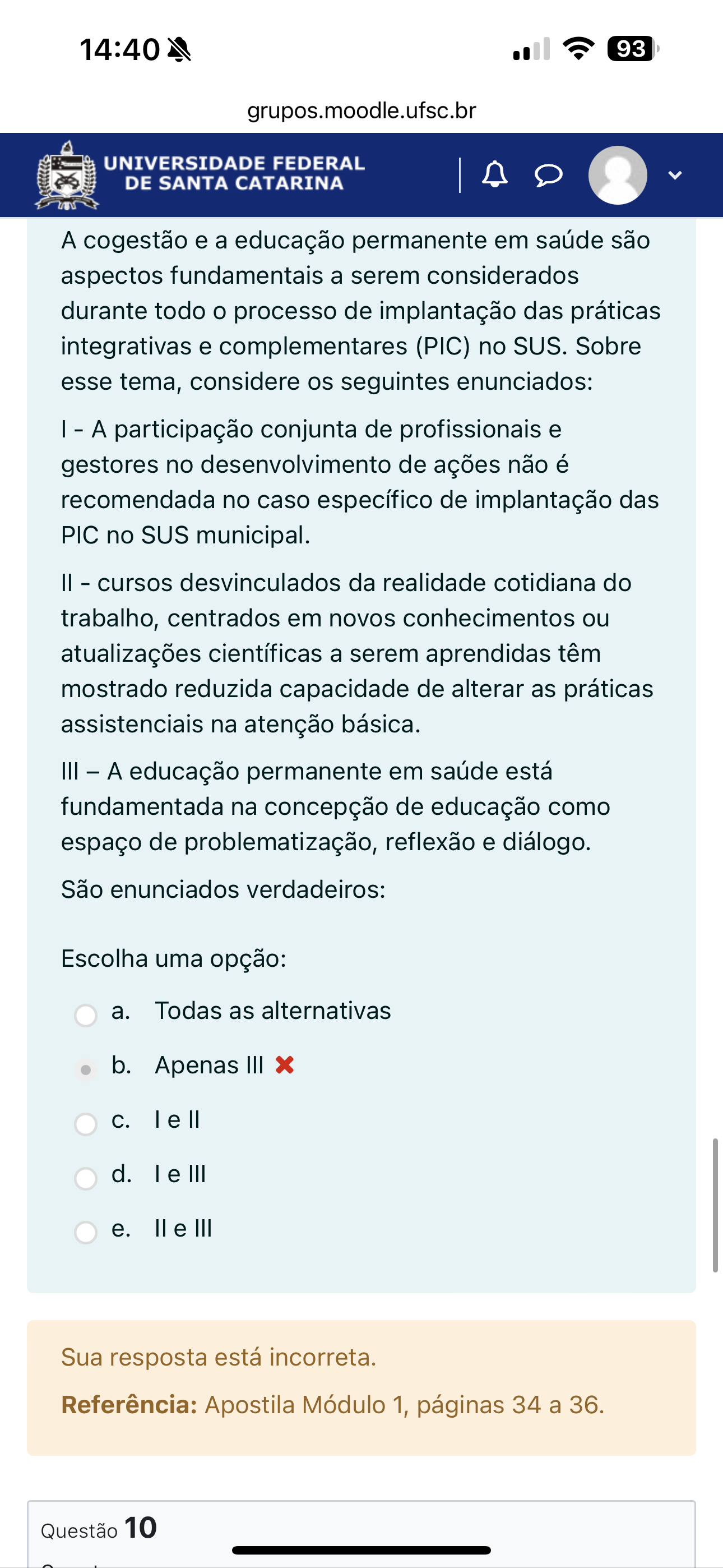 14:40 93 grupos.moodle.ufsc.br UNIVERSIDADE FEDERAL V DE SANTA CATARINA A cogestão e a educação permanente em saúde são aspectos fundamentais a serem considerados durante todo processo de implantação das práticas integrativas e complementares (PIC) no SUS. Sobre esse tema, considere os seguintes enunciados: - - A participação conjunta de profissionais e gestores no desenvolvimento de ações não é recomendada no caso específico de implantação das PIC no SUS municipal. Il - - cursos desvinculados da realidade cotidiana do trabalho, centrados em novos conhecimentos ou atualizações científicas a serem aprendidas têm mostrado reduzida capacidade de alterar as práticas assistenciais na atenção básica. III - A educação permanente em saúde está fundamentada na concepção de educação como espaço de problematização, reflexão e diálogo. São enunciados verdadeiros: Escolha uma opção: a. Todas as alternativas b. Apenas III x d. III Sua resposta está incorreta. Referência: Apostila Módulo 1, páginas 34 a 36. Questão 10