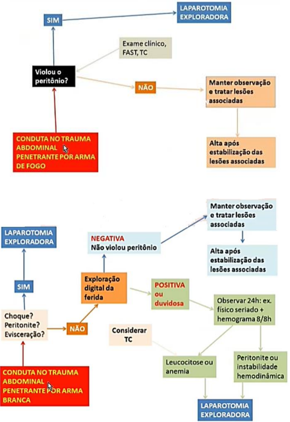 LAPAROTOMIA EXPLORADORA SIM Exame clínico, FAST, TC Violou peritônio? Manter observação NÃO e tratar lesões associadas CONDUTA NO TRAUMA Alta após ABDOMINAL estabilização das PENETRANTE POR ARMA lesões associadas DE FOGO Manter observação tratar lesões associadas LAPAROTOMIA NEGATIVA EXPLORADORA Não violou peritônio Alta após estabilização das lesões associadas Exploração SIM digital da POSITIVA ferida ou duvidosa Observar 24h: ex. físico seriado + Choque? hemograma 8/8h Peritonite? NÃO Considerar Evisceração? TC Peritonite ou Leucocitose ou instabilidade CONDUTA NO TRAUMA anemia hemodinâmica ABDOMINAL PENETRANTE FOR ARMA BRANCA LAPAROTOMIA EXPLORADORA