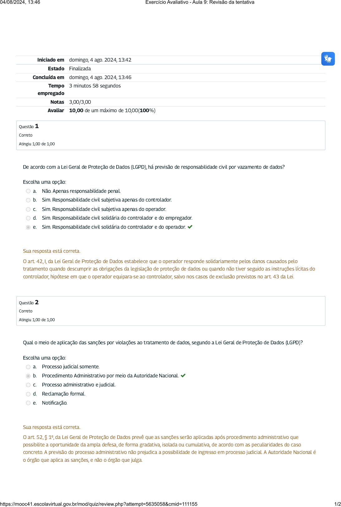 Iniciado em domingo, 4 ago. 2024, 13:42 Estado Finalizada Concluída em domingo, 4 ago. 2024, 13:46 Tempo empregado 3 minutos 58 segundos Notas 3,00/3,00 Avaliar 10,00 de um máximo de 10,00(100%) Questão 1 Correto Atingiu 1,00 de 1,00 Questão 2 Correto Atingiu 1,00 de 1,00 De acordo com a Lei Geral de Proteção de Dados (LGPD), há previsão de responsabilidade civil por vazamento de dados? Escolha uma opção: a. Não. Apenas responsabilidade penal. b. Sim. Responsabilidade civil subjetiva apenas do controlador. c. Sim. Responsabilidade civil subjetiva apenas do operador. d. Sim. Responsabilidade civil solidária do controlador e do empregador. e. Sim. Responsabilidade civil solidária do controlador e do operador. Sua resposta está correta. O art. 42, I, da Lei Geral de Proteção de Dados estabelece que o operador responde solidariamente pelos danos causados pelo tratamento quando descumprir as obrigações da legislação de proteção de dados ou quando não tiver seguido as instruções lícitas do controlador, hipótese em que o operador equipara-se ao controlador, salvo nos casos de exclusão previstos no art. 43 da Lei. Qual o meio de aplicação das sanções por violações ao tratamento de dados, segundo a Lei Geral de Proteção de Dados (LGPD)? Escolha uma opção: a. Processo judicial somente. b. Procedimento Administrativo por meio da Autoridade Nacional. c. Processo administrativo e judicial. d. Reclamação formal. e. Noti�cação. Sua resposta está correta. O art. 52, § 1º, da Lei Geral de Proteção de Dados prevê que as sanções serão aplicadas após procedimento administrativo que possibilite a oportunidade da ampla defesa, de forma gradativa, isolada ou cumulativa, de acordo com as peculiaridades do caso concreto. A previsão do processo administrativo não prejudica a possibilidade de ingresso em processo judicial. A Autoridade Nacional é o órgão que aplica as sanções, e não o órgão que julga. 04/08/2024, 13:46 Exercício Avaliativo - Aula 9: Revisão da tentativa https://mooc41.escolavirtual.gov.br/mod/quiz/review.php?attempt=5635058&cmid=111155 1/2 Questão 3 Correto Atingiu 1,00 de 1,00 Sobre as possíveis sanções por infrações à Lei Geral de Proteção de Dados (LGPD), assinale a única alternativa correta: Escolha uma opção: a. Quem aplica as sanções administrativas é a Autoridade Nacional. b. A multa simples e a multa diária não se encontram no rol de possíveis sanções aplicáveis pela Administração. c. As sanções serão aplicadas sem a existência processo administrativo prévio. d. As sanções serão aplicadas em face do titular dos dados, e não do controlador deles. e. A pronta adoção de medidas corretivas não é critério nem parâmetro para a aplicação de sanções. Sua resposta está correta. Conforme determinado pelo caput do art. 52 da Lei Geral de Proteção de Dados (LGPD), quem aplica as sanções é a Autoridade Nacional. 04/08/2024, 13:46 Exercício Avaliativo - Aula 9: Revisão da tentativa https://mooc41.escolavirtual.gov.br/mod/quiz/review.php?attempt=5635058&cmid=111155 2/2