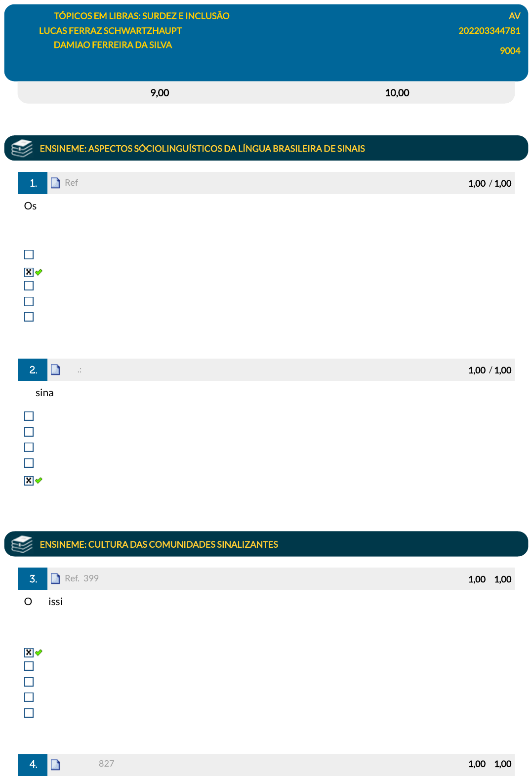Disciplina: TÓPICOS EM LIBRAS: SURDEZ E INCLUSÃO AV Aluno: LUCAS FERRAZ SCHWARTZHAUPT 202203344781 Professor: DAMIAO FERREIRA DA SILVA Turma: 9004 DGT0041_AV_202203344781 (AG) 25/05/2023 14:11:55 (F) Avaliação: 9,00 pts Nota SIA: 10,00 pts ENSINEME: ASPECTOS SÓCIOLINGUÍSTICOS DA LÍNGUA BRASILEIRA DE SINAIS 1. Ref.: 3992294 Pontos: 1,00 / 1,00 Os fenômenos de variação linguística são identi�cados no uso de qualquer língua natural, independentemente de serem línguas orais ou de sinais. Os fenômenos podem acontecer em qualquer nível da língua e são sempre relacionados: a escolhas conscientes do uso da língua. a fatores linguísticos e extralinguísticos. ao registro escrito da língua e nunca ao uso oral. ao uso uniforme da língua. a palavras e construção de frases de acordo com a gramática tradicional. 2. Ref.: 3992305 Pontos: 1,00 / 1,00 Assinale a alternativa que apresenta uma a�rmação ideologicamente orientada e preconceituosa: A variação e a mudança são fenômenos que ocorrem nas línguas. Libras é uma língua que apresenta variações no seu uso. Ouvintes têm condições de aprender línguas de sinais. Surdos têm condições de aprender uma língua qualquer. Há línguas que são superiores a outras. ENSINEME: CULTURA DAS COMUNIDADES SINALIZANTES 3. Ref.: 3992207 Pontos: 1,00 / 1,00 O polissistema literário brasileiro inclui o sistema literário surdo, que busca protagonizar a experiência vivida por pessoas que nasceram no país e compartilham com os ouvintes de muitos traços culturais. Sobre literatura surda, podemos a�rmar que: Pode ser produção original ou adaptação de contos tradicionais. Humor, piadas e anedotas são raras nas produções culturais surdas. No humor a ideia de surdez é tida como limitação. Não possui nenhuma relação com a literatura geral. Somente produção original em língua de sinais 4. Ref.: 7808274 Pontos: 1,00 / 1,00 javascript:alert('C%C3%B3digo da quest%C3%A3o: 3992294.'); javascript:alert('C%C3%B3digo da quest%C3%A3o: 3992305.'); javascript:alert('C%C3%B3digo da quest%C3%A3o: 3992207.'); javascript:alert('C%C3%B3digo da quest%C3%A3o: 7808274.'); Assumindo que a linguagem é um fenômeno social, a sociolinguística é o ramo da sociologia que dedica-se a este estudo. Entre os inúmeros estudiosos deste campo, quem podemos destacar como um dos expoentes? Karl Marx Paulo Freire Willian Labov Lev Vigotsky Jean Piaget ENSINEME: ESPECIFICIDADES LINGUÍSTICAS DA LÍNGUA BRASILEIRA DE SINAIS 5. Ref.: 7815747 Pontos: 0,00 / 1,00 Através da língua brasileira de sinais pessoas surdas são capazes de expressar qualquer conceito seja ele real ou abstrato, emocional ou racional, simples ou complexo. Esta língua surgiu através da interação entre pessoas surdas. Como de�nimos esta língua? Língua natural. Língua incompleta. Língua gestual. Língua arti�cial. Língua Brasileira de Sinais. 6. Ref.: 3992334 Pontos: 1,00 / 1,00 A Linguística considera a Língua de Sinais: Uma Linguagem natural que se distingue dos demais sistemas de comunicação por ser visoespacial. Uma língua natural que compartilha características que lhe atribuem um caráter especí�co. Uma língua natural, mas sem sistema linguístico. Um sistema ilegítimo mais natural que compartilha uma série de características, mas que ainda precisa de um sistema de notação. A Linguística ainda não pesquisou a Libras. 7. Ref.: 3992338 Pontos: 1,00 / 1,00 Abaixo está representada uma sequência de �guras (da esquerda para direita), que seguem um determinado padrão. A próxima �gura dessa sequência corresponde ao seguinte número em Libras: 6 5 9 0 javascript:alert('C%C3%B3digo da quest%C3%A3o: 7815747.'); javascript:alert('C%C3%B3digo da quest%C3%A3o: 3992334.'); javascript:alert('C%C3%B3digo da quest%C3%A3o: 3992338.'); 1 ENSINEME: POLÍTICAS DE INCLUSÃO DO SURDO 8. Ref.: 3992219 Pontos: 1,00 / 1,00 As políticas transversais ligadas à promoção e à proteção da diversidade humano e linguística são políticas sociais importantes para o desenvolvimento dos surdos como sujeitos individuais e coletivos. Assinale a única alternativa que corresponde à essa a�rmação. São atribuídas a elas as diretrizes e orientações para fundamentar os direitos básicos para alguns cidadãos, somente quando dotados de plena consciência linguística. A lei de Libras não se con�gura como uma política pública social, efetiva. O decreto de Libras de�ne no capítulo I, artigo 2, parágrafo único, descreve a classi�cação da pessoa com de�ciência auditiva e isso mostra a importância da visão clínica sobre os surdos no documento de proteção à Libras. São responsáveis pelo desenvolvimento de propostas, ações, programas de planejamento e elaboração de políticas públicas que viabilizem interferências e implementação de direitos fundamentais e suas garantias. As políticas públicas são construídas para balizar a macro constituição de direitos fundamentais, sendo, portanto, as demais demandas entendidas como políticas emergenciais, à titulo provisório de garantias. 9. Ref.: 3992216 Pontos: 1,00 / 1,00 A Declaração Universal dos Direitos Linguísticos se caracteriza por conter diretrizes importantes para o bem-estar do indivíduo e de a coletividade. Assinale a única resposta certa. A Declaração Universal dos Direitos Linguísticos é a lei de garantias dos direitos sociais e linguísticos dos surdos. A Declaração Universal dos Direitos Linguísticos é um documento jurídico no ambiento brasileiro, que favoreceu a comunidade surda. A Declaração Universal dos Direitos Linguísticos é uma portaria que delineia ações e programas de incentivo a aquisição e aprendizagem da Libras. A Declaração Universal dos Direitos Linguísticos é uma normativa elaborada pelo Ministério da Educação - MEC , cujo objetivo é a ampliação do uso da Libras. A Declaração Universal dos Direitos Linguísticos é um t