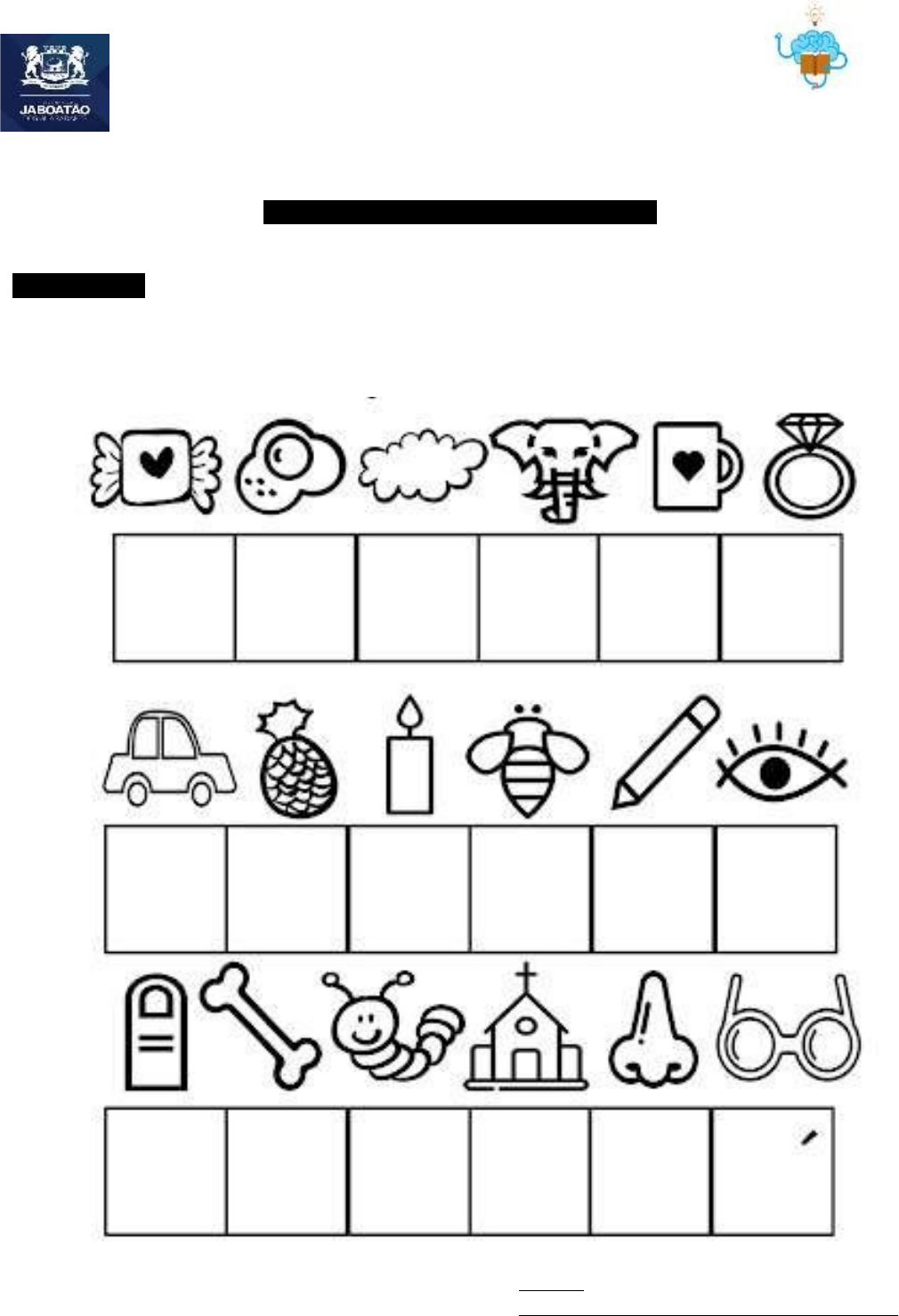 PARALISIA CEREBRAL - ANOS INICIAIS QUESTÃO 1. Complete com a letra inicial de cada figura e descubra o enigma. Com a ajuda da mamãe ou do papai, você pode escrever ou pesquisar, recortar e colar as letras nos espaços indicados. http://www.aartedeensinareaprender.com CADERNO DE ATIVIDADES 2 Turbine seu conhecimento QUESTÃO 2. Vamos cantar o parabéns para os amiguinhos da turma? Depois responda as questões abaixo. bhttps://br.pinterest.com a) Você gosta de festa de aniversário? Marque um X no ícone que representa sua resposta. b) Identifique e escreva as palavras que rimam no texto nos espaços abaixo, ou com a ajuda da mamãe e do papai pesquise, recorte e cole as letras nos espaços indicados. QUESTÃO 3. Pinte a letra inicial do nome da figura e complete a palavra. www.artedeensinareaprender.com QUESTÃO 4. Para chegar a escola, Vitor precisa passar pela TRILHA DO ALFABETO. Observe os desenhos e escreva a letra inicial do nome de cada figura. https://br.pinterest.com/ QUESTÃO 5. Vamos nos divertir com o CAÇA PALAVRA? Descubra e pinte as palavras escondidas. BOI # CIRCO # DIA # NOITE # LUA # VENTO https://br.pinterest.com/ QUESTÃO 6. Complete a metade dos desenhos VOCÊ SABIA? A SIMETRIA pode ser definida como tudo aquilo que pode ser dividido. Sendo que ambas as partes devem coincidir perfeitamente quando sobrepostas. http://www.aartedeensinareaprender.com QUESTÃO 7. Complete a metade dos desenhos VOCÊ SABIA? A SIMETRIA pode ser definida como tudo aquilo que pode ser dividido. Sendo que ambas as partes devem coincidir perfeitamente quando sobrepostas. http://mdmat.mat.ufrgs.br QUESTÃO 8. A nossa turma esta preparando uma super SALADA DE FRUTAS! No JOGO DOS 7 ERROS você precisa encontrar a diferença entre as imagens. Marque um X no erro que encontrar para não perder a conta. / https://www.ideiacriativa.org QUESTÃO 9. A figura abaixo é composta por dezesseis (16) palitos. Mude dois (2) palitos de lugar e forme quatro (4) quadrados. Desafio http//t.slideshare.net/charmillafreire/jogos-com-palitos QUESTÃO 10. . A multiplicação é a forma mais rápida de somar parcelas. Realize a multiplicação das quantidades indicadas nos conjuntos abaixo. Conte a quantidade de peixinhos e realize a soam das parcelas. 2 + 2 + 2 + 2 + 2 + 2 = 5 x 2 = Conte a quantidade de bombons e realize a soma das parcela. 3 + 3 + 3 + 3 = 4 x 4 = www.smartkids.com.br image5.jpeg image6.jpeg image7.jpeg image8.jpeg image9.png image10.png image11.jpeg image12.jpeg image13.jpeg image3.jpeg image4.jpeg image1.jpeg image2.jpeg