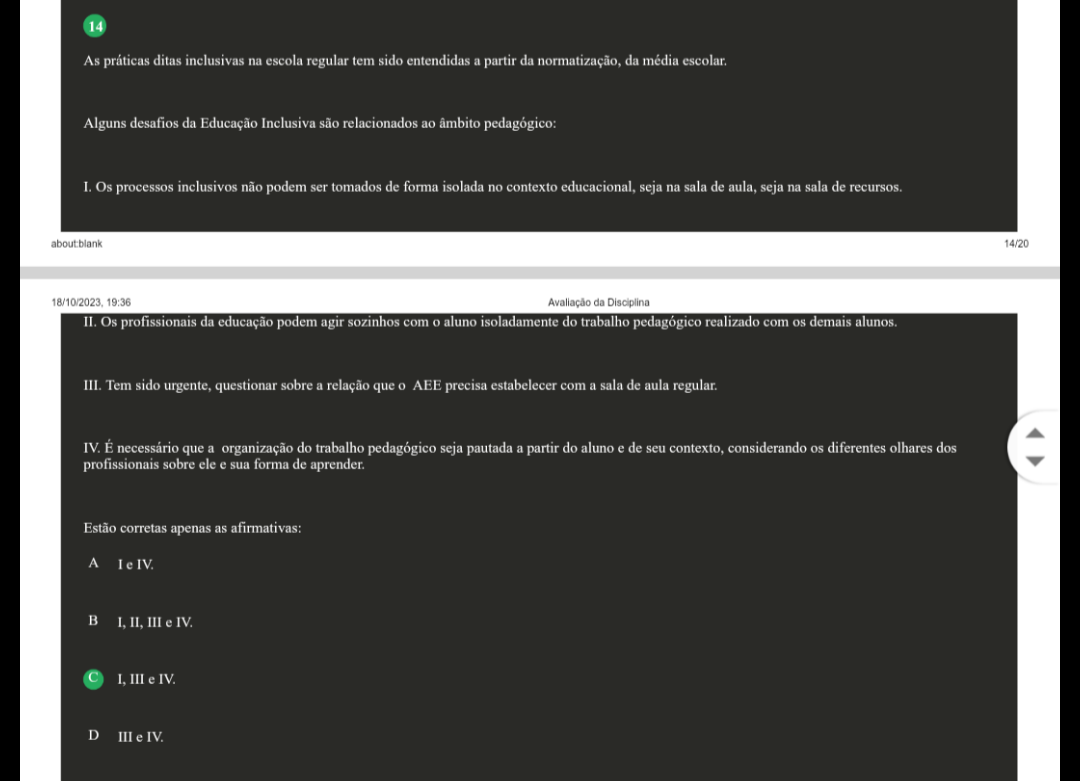 14 As práticas ditas inclusivas na escola regular tem sido entendidas a partir da normatização, da média escolar. Alguns desafios da Educação Inclusiva são relacionados ao âmbito pedagógico: I. Os processos inclusivos não podem ser tomados de forma isolada no contexto educacional, seja na sala de aula, seja na sala de recursos. about:blank 14/20 18/10/2023 19:36 Avaliação da Disciplina II. Os profissionais da educação podem agir sozinhos com O aluno isoladamente do trabalho pedagógico realizado com os demais alunos. III. Tem sido urgente, questionar sobre a relação que AEE precisa estabelecer com a sala de aula regular. IV. É necessário que a organização do trabalho pedagógico seja pautada a partir do aluno e de seu contexto, considerando os diferentes olhares dos profissionais sobre ele e sua forma de aprender. Estão corretas apenas as afirmativas: A I e IV. B III e IV. III e IV. D III e IV.