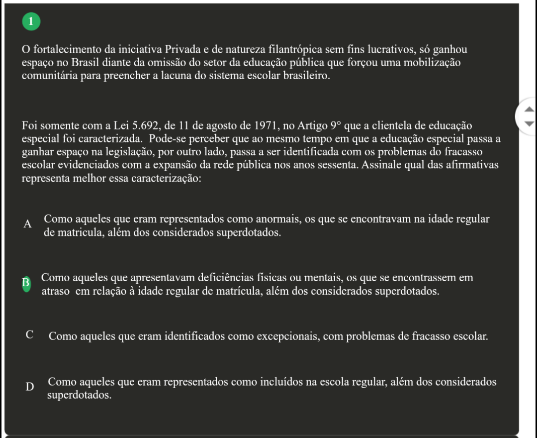 1 O fortalecimento da iniciativa Privada e de natureza filantrópica sem fins lucrativos, só ganhou espaço no Brasil diante da omissão do setor da educação pública que forçou uma mobilização comunitária para preencher a lacuna do sistema escolar brasileiro. Foi somente com a Lei 5.692, de 11 de agosto de 1971, no Artigo que a clientela de educação especial foi caracterizada. Pode-se perceber que ao mesmo tempo em que a educação especial passa a ganhar espaço na legislação, por outro passa a ser identificada com os problemas do fracasso escolar evidenciados com a expansão da rede pública nos anos sessenta. Assinale qual das afirmativas representa melhor essa caracterização: A Como aqueles que eram representados como anormais, os que se encontravam na idade regular de matricula, além dos considerados superdotados. B Como aqueles que apresentavam deficiências físicas ou mentais, os que se encontrassem em atraso em relação à idade regular de matrícula, além dos considerados superdotados. C Como aqueles que eram identificados como excepcionais, com problemas de fracasso escolar. D Como aqueles que eram representados como incluídos na escola regular, além dos considerados superdotados.