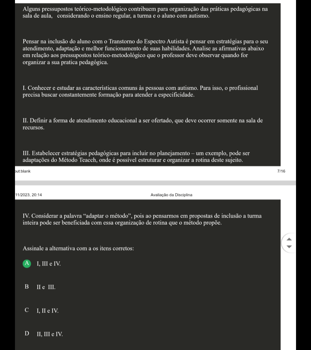 Alguns pressupostos teórico-metodológico contribuem para organização das práticas pedagógicas na sala de aula, considerando ensino regular, a turma e aluno com autismo. Pensar na inclusão do aluno com Transtorno do Espectro Autista é pensar em estratégias para seu atendimento, adaptação e melhor funcionamento de suas Analise as afirmativas abaixo em relação aos pressupostos eórico-metodológico que professor deve observar quando for organizar a sua pratica pedagógica. I. Conhecer e estudar as características comuns às pessoas com autismo. Para isso, o profissional precisa buscar constantemente formação para atender a especificidade. II. Definir a forma de atendimento educacional a ser ofertado, que deve ocorrer somente na sala de recursos. III. Estabelecer estratégias pedagógicas para incluir no planejamento - um exemplo, pode ser adaptações do Método Teacch, onde é possível estruturar e organizar a rotina deste sujeito. 7/16 11/2023, 20:14 Avaliação da Disciplina IV. Considerar a palavra "adaptar pois ao pensarmos em propostas de inclusão a turma inteira pode ser beneficiada com essa organização de rotina que método propõe. Assinale a alternativa com a os itens corretos: A I, III e IV. B II e III. C I, II e IV. D II, III e IV.