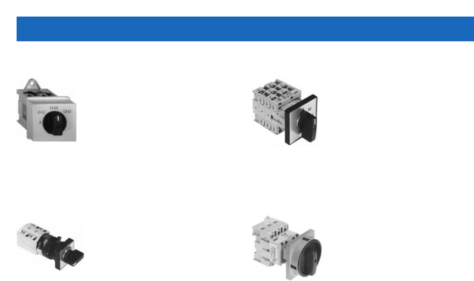 Control and Load Switches • Rated Currents up to 10 A • Wide Choice of Functions and Switch Positions • Standard Installation Sizes of 16 mm and 22 mm (for combining with 800E Control and Indicating Units) • Fingerproof Switch Body (IP20) • Water Spray and Dust-Proof Actuators (IP65) • Easily Accessible Terminals • Clearly Marked Terminals Control Switches / Bulletin 194C / L 1 Pages 12-9...12-13 • Main Switches / EMERGENCY OFF Switches • Series Q • 194E Series B Load Switch, Type Q for Installation in Distribution Cubicle • 194E Series B Load Switch / EMERGENCY OFF, Type R for Installation in Distribution Cubicle • 194E Series B Load Switch in Enclosure for Base Mounting Complete Switches Pages 12-6...12-8 • Rated Currents up to 100 A • Wide Choice of Functions and Switch Positions • Screw and Central Fixture • Front or Basic Mounting • Fingerproof Switch Body (IP20) • Water Spray and Dust-Proof Actuators (IP65) • Easily Accessible Terminals • Clearly Marked Terminals • Wide Assortment of Accessories Switch Disconnectors / Bulletin 194E Series B Pages 12-35...12-38 • Rated Currents up to 25 A • Choice of Functions and Switch Positions • Screw and Central Fixture • Front or Basic Mounting • Fingerproof Switch Body (IP20) • Water Spray and Dust-Proof Actuators (IP65) • Easily Accessible Terminals • Clearly Marked Terminals Control and Load Switches / Bulletin 194L / L 2 Pages 12-15...12-33 12 Bulletin 194C / L 1, Bulletin 194L / L 2, Bulletin 194E Series B Control and Load Switches Overview 12-2 Rockwell Automation 194L / L 2 Control and Load Switch 194E Switch Disconnector 12 Bulletin 194C / L 1, Bulletin 194L / L 2, Bulletin 194E Series B Control and Load Switches Overview Rockwell Automation 12-3 194L-A / LA 2 Control and Load Switch for Standard Distribution Panels with DIN Cut-out 194C / L 1 Load Switch 194EY Enclosure with Switch Disconnector 12 Bulletin 194C / L 1, Bulletin 194L / L 2, Bulletin 194E Series B Control and Load Switches Product Description 12-4 Rockwell Automation ON-OFF Switch 194C / L 1 ON-OFF Switch 194E ON-OFF Switch 194L / L 2 Step Switch 194L / L 2 Reversing Switch 194L / L 2 Ammeter Selector Switch 194L / L 2 Voltmeter Selector Switch 194L / L 2 ON-OFF Switch 194E Control and Load Switch The control switch 194C / L 1, the control and load switch 194L / L 2 and the load switch 194E are flexible, adaptable, time and space saving devices. These switches can be front mounted (door) or base/DIN rail installed. Control and load switches satisfy a broad range of applications, offer product flexibilty, and have an attractive family appearance. The switch design and the many possible combinations make control and load switches adaptable to most applications. ON-OFF Switch Two position switch used to connect and disconnect any electrical supply. They are used in variety of control and power switching appplications. Control applications include: energizing solenoids, actuators, valves, magnetic starters and relays. Power applications include: manual control of direct-on-line motors and isolation of motor branch circiuts. Changeover Switch Three position switch used in power applications to change bet- ween alternate electrical supplies. These devices are typically used to switch the power supply from the primary source to a stand-by generator or emergency supply in the event of a power outage. Star-Delta Switch Three-position (OFF, star-delta) switch used to manually control the reduced voltage starting of the motor. Operating the switch changes the wiring configuration to the motor from a star configu- ration to a delta configuration once the controller operator dete- mines the motor is up to speed. Reversing Switch Three position (OFF; star-delta) swtich used to manually control the direction of rotation of a motor. Operating the switch changes the wiring configuration to the motor to operate in the forward or reverse direction. Ammeter Selector Switch Multi-position switch used to connect one or more phases of the electrical supply to an ammeter, so that the current in each phase can be displayed on the ammeter. Voltmeter Selector Switch Multi-postion switch used to connect two lines of the electrical supply system to a voltmeter, so that the voltage can be dis- played on the voltmeter. Step Switch Multi-position switch used to connect a variety of loads to an electrical supply in a pre-determined logical sequence. A typical application would be temperature control of a heating oven or furnace. Switch Disconnector Conform to the isolation requirements for disconnectors. This provide on-load making and breaking functions as well as the isolation function. 12 Bulletin 194C / L 1, Bulletin 194L / L 2, Bulletin 194E Series B Control and Load Switches Preselection Rockwell Automation 12-5 AC-21A Switching of resistive loads with slight overload according to IEC / VDE / BS 440 V [A] 690 V [A] Type See page below for 440 V [A] 690 V [A] Type ON/OFF Changeover 10 – 194C-10 / L 1-10 12-12 12-12 – 12 194L-12 / L 2-12 12-18 12-20 – 16 194L-16 / L 2-16 12-18 12-20 – 20 194L-20 / L 2-20 12-18 12-20 – 25 194L-25 / L 2-25 12-18 12-20 – 25 194E-25 12-38 – 32 194E-32 12-38 – 40 194E-40 12-38 – 63 194E-63 12-38 – 80 194E-80 12-38 – 100 194E-100 12-38 AC-23A Occasional switching of motors or other highly inductive loads 3-phase / 3 pole Single phase / 2 pole See page below 220...240 V [kW] 380...440 V [kW] 500 V [kW] 690 V [kW] 110 V [kW] 220...240 V [kW] 380...440 V [kW] Type ON/OFF Changeover 1.8 3 – – 0.37 0.75 1.1 194C-10 / L 1-10 12-12 12-12 2.2 4 5.5 5.5 0.75 1.3 2.2 194L-12 / L 2-12 12-18 12-20 3 5.5 7.5 7.5 1.1 2.2 3.7 194L-16 / L 2-16 12-18 12-20 4.5 7.5 10 8 1.2 2.5 4.5 194L-20 / L 2-20 12-18 12-20 5.5 11 13 11 1.6 3.2 5.5 194L-25 / L 2-25 12-18 12-20 7.5 11 – 11 – – – 194E-25 12-38 11 15 – 15 – – – 194E-32 12-38 15 18.5 – 18.5 – – – 194E-40 12-38 18.5 22 – 22 – – 