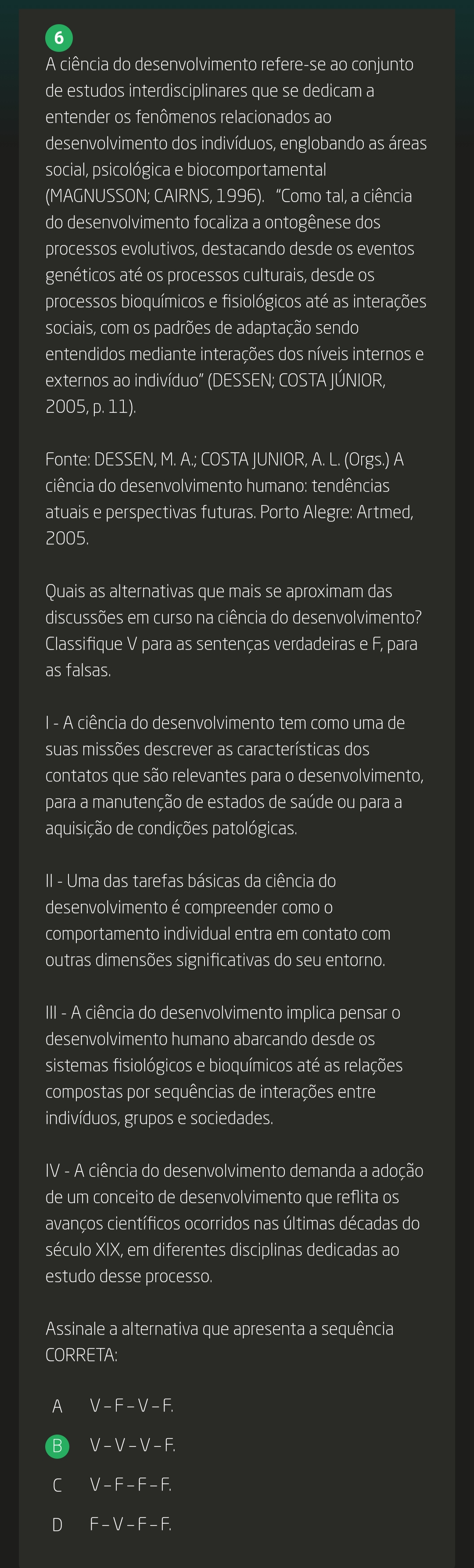 6 A ciência do desenvolvimento refere-se ao conjunto de estudos interdisciplinares que se dedicam a entender os fenômenos relacionados ao desenvolvimento dos indivíduos, englobando as áreas social, psicológica e biocomportamental (MAGNUSSON; CAIRNS, 1996). "Como tal, a ciência do desenvolvimento focaliza a ontogênese dos processos evolutivos, destacando desde os eventos genéticos até os processos culturais, desde os processos bioquímicos e fisiológicos até as interações sociais, com os padrões de adaptação sendo entendidos mediante interações dos níveis internos e externos ao indivíduo" (DESSEN; COSTA 2005, 11). Fonte: DESSEN, M. A. COSTA JUNIOR, A. L. (Orgs.) A ciência do desenvolvimento humano: tendências atuais e perspectivas futuras. Porto Alegre: Artmed, 2005. Quais as alternativas que mais se aproximam das discussões em curso na ciência do desenvolvimento? Classifique V para as sentenças verdadeiras e para as falsas. I - A ciência do desenvolvimento tem como uma de suas missões descrever as características dos contatos que são relevantes para desenvolvimento, para a manutenção de estados de saúde ou para a aquisição de condições patológicas. Uma das tarefas básicas da ciência do desenvolvimento é compreender como comportamento individual entra em contato com outras dimensões significativas do seu entorno. III - A ciência do desenvolvimento implica pensar desenvolvimento humano abarcando desde os sistemas fisiológicos e bioquímicos até as relações compostas por de interações entre indivíduos, grupos e sociedades. IV - A ciência do desenvolvimento demanda a adoção de um conceito de desenvolvimento que reflita os avanços científicos ocorridos nas últimas décadas do século XIX, em diferentes disciplinas dedicadas ao estudo desse processo. Assinale a alternativa que apresenta a seguência CORRETA: A V-F-V - V-F-F- - - - D F-V-F-F