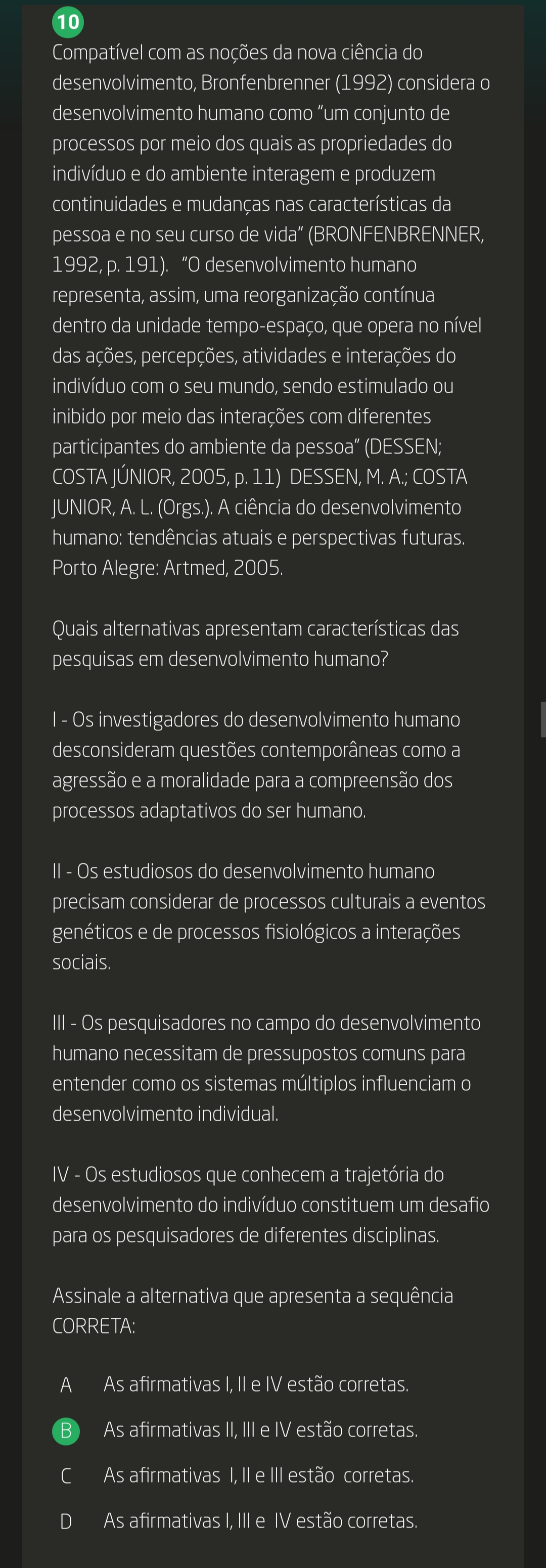 10 Compatível com as noções da nova ciência do desenvolvimento, Bronfenbrenner (1992) considera desenvolvimento humano como "um conjunto de processos por meio dos quais as propriedades do indivíduo e do ambiente interagem e produzem continuidades e mudanças nas características da pessoa e no seu curso de vida" "O desenvolvimento humano representa, assim, uma reorganização contínua dentro da unidade tempo-espaço, que opera no nível das ações, percepções, atividades e interações do indivíduo com seu mundo, sendo estimulado ou inibido por meio das interações com diferentes participantes do ambiente da pessoa" (DESSEN; 2005, 11) DESSEN, M. A.; COSTA JUNIOR, A. L. (Orgs.). A ciência do desenvolvimento humano: tendências atuais e perspectivas futuras. Porto Alegre: Artmed, Quais alternativas apresentam características das pesquisas em desenvolvimento humano? I - Os investigadores do desenvolvimento humano desconsideram questões contemporâneas como a agressão e a moralidade para a compreensão dos processos adaptativos do ser humano. - Os estudiosos do desenvolvimento humano precisam considerar de processos culturais a eventos genéticos e de processos fisiológicos a interações sociais. III Os pesquisadores no campo do desenvolvimento humano necessitam de pressupostos comuns para entender como os sistemas múltiplos influenciam desenvolvimento individual. IV - Os estudiosos que conhecem a trajetória do desenvolvimento do indivíduo constituem um desafio para os pesquisadores de diferentes disciplinas. Assinale a alternativa que apresenta a seguência CORRETA: A As afirmativas I, II e IV estão corretas. B As afirmativas II, III e IV estão corretas. C As afirmativas I, e III estão corretas. D As afirmativas I, III e IV estão corretas.