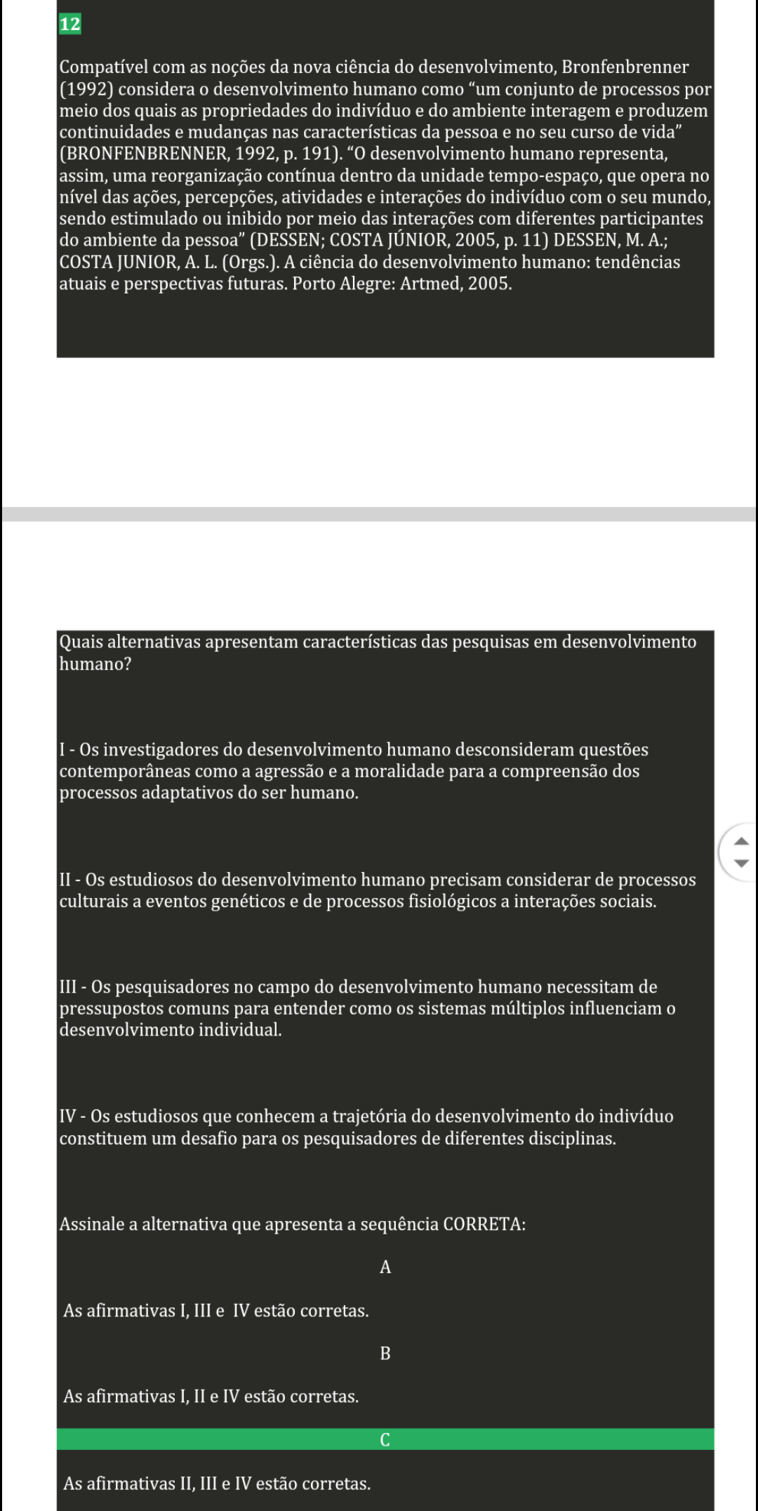 12 Compatível com as noções da nova ciência do desenvolvimento, Bronfenbrenner (1992) considera desenvolvimento humano como "um conjunto de processos por meio dos quais as propriedades do indivíduo e do ambiente interagem e produzem continuidades e mudanças nas características da pessoa e no seu curso de vida" (BRONFENBRENNER, 1992, p. 191). desenvolvimento humano representa, assim, uma reorganização contínua dentro da unidade tempo-espaço, que opera no nível das ações, percepções, atividades e interações do indivíduo com seu mundo, sendo estimulado ou inibido por meio das interações com diferentes participantes do ambiente da pessoa" (DESSEN; COSTA 2005, p. 11) DESSEN, M. A.; COSTA JUNIOR, A. L. (Orgs.). A ciência do desenvolvimento humano: tendências atuais e perspectivas futuras. Porto Alegre: Artmed, 2005. Quais alternativas apresentam características das pesquisas em desenvolvimento humano? I - - Os investigadores do desenvolvimento humano desconsideram questões contemporâneas como a agressão e a moralidade para a compreensão dos processos adaptativos do ser humano. II - Os estudiosos do desenvolvimento humano precisam considerar de processos culturais a eventos genéticos e de processos fisiológicos a interações sociais. III Os pesquisadores no campo do desenvolvimento humano necessitam de pressupostos comuns para entender como os sistemas múltiplos influenciam desenvolvimento individual. IV - Os estudiosos que conhecem a trajetória do desenvolvimento do indivíduo constituem um desafio para os pesquisadores de diferentes disciplinas. Assinale a alternativa que apresenta a sequência CORRETA: A As afirmativas I, III e IV estão corretas. B As afirmativas I, II e IV estão corretas. C As afirmativas II, III e IV estão corretas.