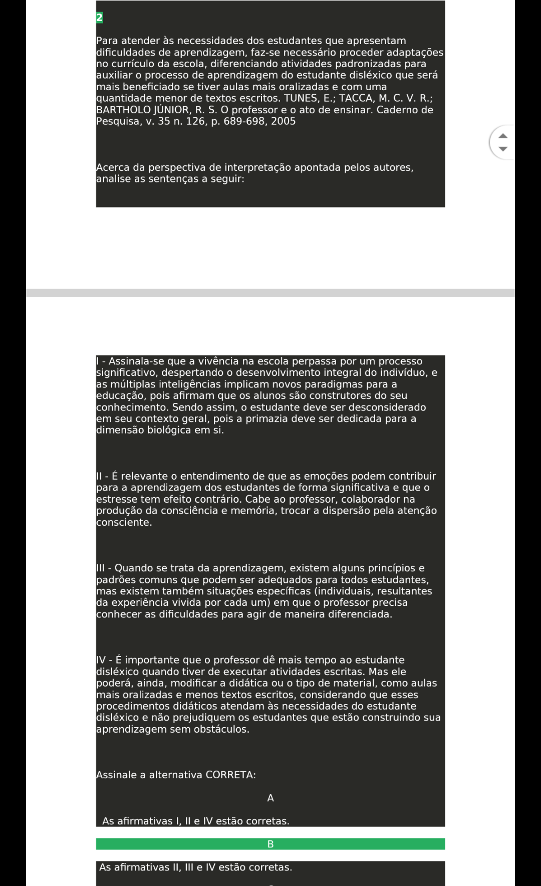 2 Para atender às necessidades dos estudantes que apresentam dificuldades de aprendizagem, faz-se necessário proceder adaptações no currículo da escola, diferenciando atividades padronizadas para auxiliar processo de aprendizagem do estudante disléxico que será mais beneficiado se tiver aulas mais oralizadas e com uma quantidade menor de textos escritos. TUNES, E.; TACCA, M. C. V. BARTHOLO R. S. professor e ato de ensinar. Caderno de Pesquisa, V. 35 n. 126, p. 689-698, 2005 Acerca da perspectiva de interpretação apontada pelos autores, analise as sentenças a seguir: I Assinala-se que a vivência na escola perpassa por um processo significativo, despertando desenvolvimento integral do indivíduo, e las múltiplas inteligências implicam novos paradigmas para a educação, pois afirmam que os alunos são construtores do seu conhecimento. Sendo assim, estudante deve ser desconsiderado em seu contexto geral, pois a primazia deve ser dedicada para a dimensão biológica em si. II - É relevante entendimento de que as emoções podem contribuir para a aprendizagem dos estudantes de forma significativa e que estresse tem efeito contrário. Cabe ao professor, colaborador na produção da consciência e memória, trocar a dispersão pela atenção consciente. III Quando se trata da aprendizagem, existem alguns princípios e padrões comuns que podem ser adequados para todos estudantes, mas existem também situações específicas (individuais, resultantes da experiência vivida por cada um) em que professor precisa conhecer as dificuldades para agir de maneira diferenciada. IV - É importante que professor dê mais tempo ao estudante disléxico quando tiver de executar atividades escritas. Mas ele poderá, ainda, modificar a didática ou tipo de material, como aulas mais oralizadas e menos textos escritos, considerando que esses procedimentos didáticos atendam às necessidades do estudante disléxico e não prejudiquem os estudantes que estão construindo sua aprendizagem sem obstáculos. Assinale a alternativa CORRETA: A As afirmativas I, II e IV estão corretas. B As afirmativas II, III e IV estão corretas.