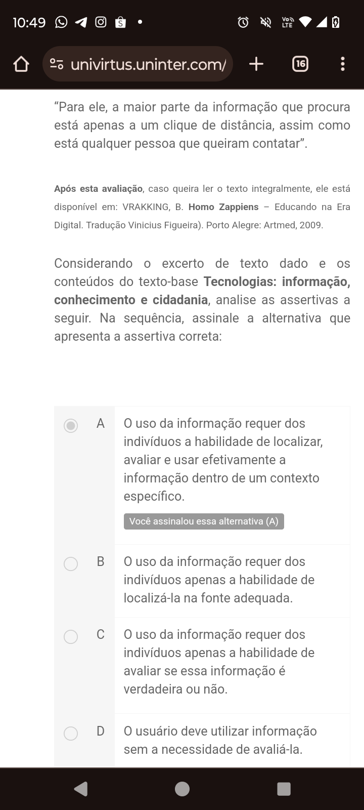 10:49 Vo LTE univirtus.uninter.com + 16 "Para ele, a maior parte da informação que procura está apenas a um clique de distância, assim como está qualquer pessoa que queiram contatar". Após esta avaliação, caso queira o texto integralmente, ele está disponível em: VRAKKING, B. Homo Zappiens - Educando na Era Digital. Tradução Vinicius Figueira). Porto Alegre: Artmed, 2009. Considerando o excerto de texto dado e os conteúdos do texto-base Tecnologias: informação, conhecimento e cidadania, analise as assertivas a seguir. Na sequência, assinale a alternativa que apresenta a assertiva correta: A uso da informação requer dos indivíduos a habilidade de localizar, avaliar e usar efetivamente a informação dentro de um contexto específico. Você assinalou essa alternativa (A) B uso da informação requer dos indivíduos apenas a habilidade de localizá-la na fonte adequada. C uso da informação requer dos indivíduos apenas a habilidade de avaliar se essa informação é verdadeira ou não. D usuário deve utilizar informação sem a necessidade de avaliá-la.