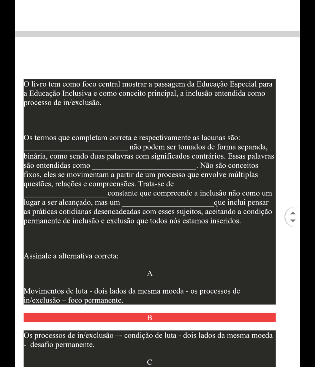 O livro tem como foco central mostrar a passagem da Educação Especial para la Educação Inclusiva e como conceito principal, a inclusão entendida como processo de in/exclusão. Os termos que completam correta e respectivamente as lacunas são: não podem ser tomados de forma separada, binária, como sendo duas palavras com significados contrários. Essas palavras são entendidas como Não são conceitos fixos, eles se movimentam a partir de um processo que envolve múltiplas questões, relações e compreensões. Trata-se de constante que compreende a inclusão não como um lugar a ser alcançado, mas um que inclui pensar práticas cotidianas desencadeadas com esses sujeitos, aceitando a condição permanente de inclusão e exclusão que todos nós estamos inseridos. Assinale a alternativa correta: A Movimentos de luta - dois lados da mesma moeda - os processos de in/exclusão - foco permanente. B Os processos de in/exclusão condição de luta - dois lados da mesma moeda desafio permanente. C