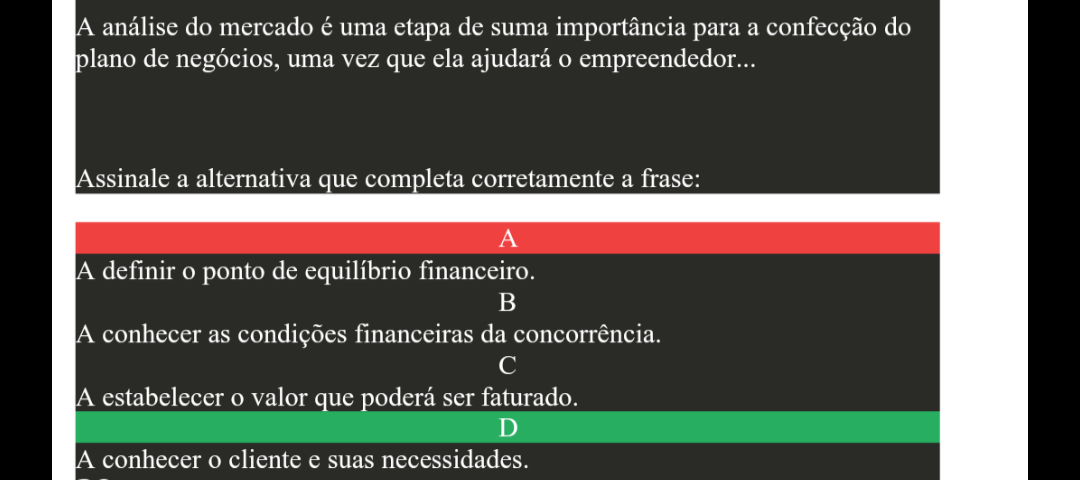A análise do mercado é uma etapa de suma importância para a confecção do plano de negócios, uma vez que ela ajudará o empreendedor... Assinale a alternativa que completa corretamente a frase: A A definir ponto de equilíbrio financeiro. B A conhecer as condições financeiras da concorrência. C A estabelecer valor que poderá ser faturado. D A conhecer cliente e suas necessidades.