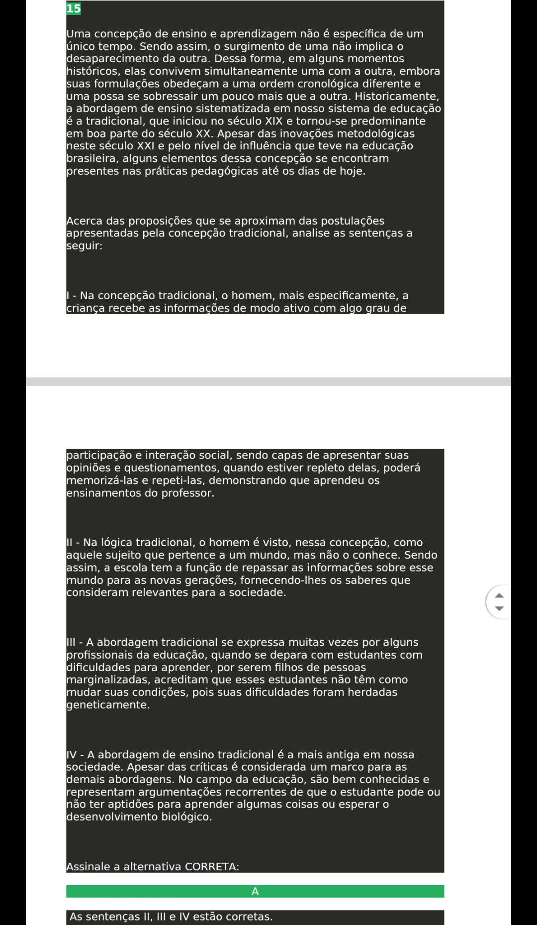 15 Uma concepção de ensino e aprendizagem não é específica de um único tempo. Sendo assim, surgimento de uma não implica desaparecimento da outra. Dessa forma, em alguns momentos históricos, elas convivem simultaneamente uma com a outra, embora suas formulações obedeçam a uma ordem cronológica diferente e uma possa se sobressair um pouco mais que a outra. Historicamente, abordagem de ensino sistematizada em nosso sistema de educação a tradicional, que iniciou no século XIX e tornou-se predominante em boa parte do século XX. Apesar das inovações metodológicas neste século XXI e pelo nível de influência que teve na educação brasileira, alguns elementos dessa concepção se encontram presentes nas práticas pedagógicas até os dias de hoje. Acerca das proposições que se aproximam das postulações apresentadas pela concepção tradicional, analise as sentenças a seguir: I - Na concepção tradicional, homem, mais especificamente, a criança recebe as informações de modo ativo com algo grau de participação e interação social, sendo capas de apresentar suas opiniões e questionamentos, quando estiver repleto delas, poderá memorizá-las e repeti-las, demonstrando que aprendeu os do professor. II - Na lógica tradicional, homem é visto, nessa concepção, como aquele sujeito que pertence a um mundo, mas não conhece. Sendo assim, a escola tem a função de repassar as informações sobre esse mundo para as novas gerações, fornecendo-lhes os saberes que consideram relevantes para a sociedade. III - A abordagem tradicional se expressa muitas vezes por alguns profissionais da educação, quando se depara com estudantes com dificuldades para aprender, por serem filhos de pessoas marginalizadas, acreditam que esses estudantes não têm como suas condições, pois suas dificuldades foram herdadas geneticamente. IV A abordagem de ensino tradicional é a mais antiga em nossa sociedade. Apesar das críticas é considerada um marco para as demais abordagens. No campo da educação, são bem conhecidas e representam argumentações recorrentes de que o estudante pode ou não ter aptidões para aprender algumas coisas ou esperar desenvolvimento biológico. Assinale a alternativa CORRETA: A As sentenças II, III e IV estão corretas.