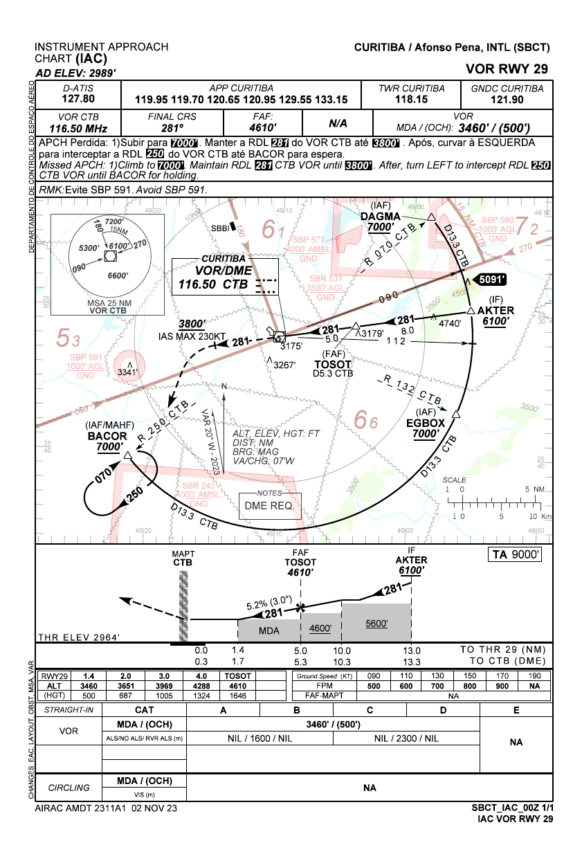 35 00 ' 3500' 3 5 0 0 ' 4500 ' B T C M N 5 1 53 66 090 270 1 8 0 61 72 0 1 0 1 5 5 NM 10 Km SCALE N ï » ¿ VA R 20  W - ALT, ELEV, HGT: FT DIST: NM BRG: MAG VA/CHG: 07'W 1000' AGL SBP 591 GND SBR 531 3500' AGL GND GND 4000' AMSL SBP 577 4000' AMSL SBR 242 GND SBP 580 1000' AGL GND SBBI ALS/NO ALS/ RVR ALS (m) VIS (m) AD ELEV: 2989' NA CHART (IAC) INSTRUMENT APPROACH D E P A R T A M E N T O D E C O N T R O L E D O E S P A Ç O A É R E O FINAL CRS FAF: STRAIGHT-IN CIRCLING D-ATIS CURITIBA / Afonso Pena, INTL (SBCT) CAT A B C D E MDA / (OCH) VOR VOR RWY 29 N/A VOR MDA / (OCH) R 132 CTB R 0 7 0 C T B R 2 5 0 C T B MDA 0.0 5 .2% (3 . MAPT THR ELEV 2964' CTB TA 9000' 127.80 APP CURITIBA 119.95 119.70 120.65 120.95 129.55 133.15 TWR CURITIBA 118.15 GNDC CURITIBA 121.90 VOR CTB 116.50 MHz 281º 4610' MDA / (OCH): 3460' / (500') 112 09 0 IF AKTER 6100' 281 281 4610' TOSOT FAF 5600' 4600' 5.0 10.0 13.0 13.310.35.30.3 3460' / (500') ALT (HGT) ALT 2.0 3.0 4.01.4 TOSOTRWY29 3460 500 3651 42883969 687 1005 1324 4610 1646 FPM FAF-MAPT NA Ground Speed (KT) 500 090 600 110 700 130 150 800 900 170 190 NIL / 2300 / NIL TO THR 29 (NM) TO CTB (DME) AIRAC AMDT 2311A1 02 NOV 23 SBCT_IAC_00Z 1/1 IAC VOR RWY 29 NIL / 1600 / NIL 1.4 1.7 Evite SBP 591. NA RMK: Avoid SBP 591. DME REQ. NOTES 10 NM NA 3341' VOR CTB 7200' 1 8 0 5300' 090 6600' 2706100' MSA 25 NM MN51 116.50 CTB CURITIBA VOR/DME B T C C H A N G E S : E A C , L A Y O U T , O B S T , M S A , V A R . 250 3179' 25 0 07 0 (IAF/MAHF) BACOR 3175' 3267' 4740' (IAF) EGBOX 7000' AKTER 6100' (IAF) DAGMA 7000' (IF) 281 D 1 3 .3 C T B 281 8.0281 5.0 5091' 7000' 3800' IAS MAX 230KT BT C 3.3 1D B T C 3.31 D TOSOT (FAF) D5.3 CTB 7000' 7000' 281 3800' 250 APCH Perdida: 1)Subir para . Manter a RDL do VOR CTB até . Após, curvar à ESQUERDA para interceptar a RDL do VOR CTB até BACOR para espera. 281 3800' CTB VOR until BACOR for holding. Missed APCH: 1)Climb to . Maintain RDL CTB VOR until . After, turn LEFT to intercept RDL 49 20 49 10 49 00 48 50 48 5049 00 49 10 49 20 30 25 40 25 40 25 30 25