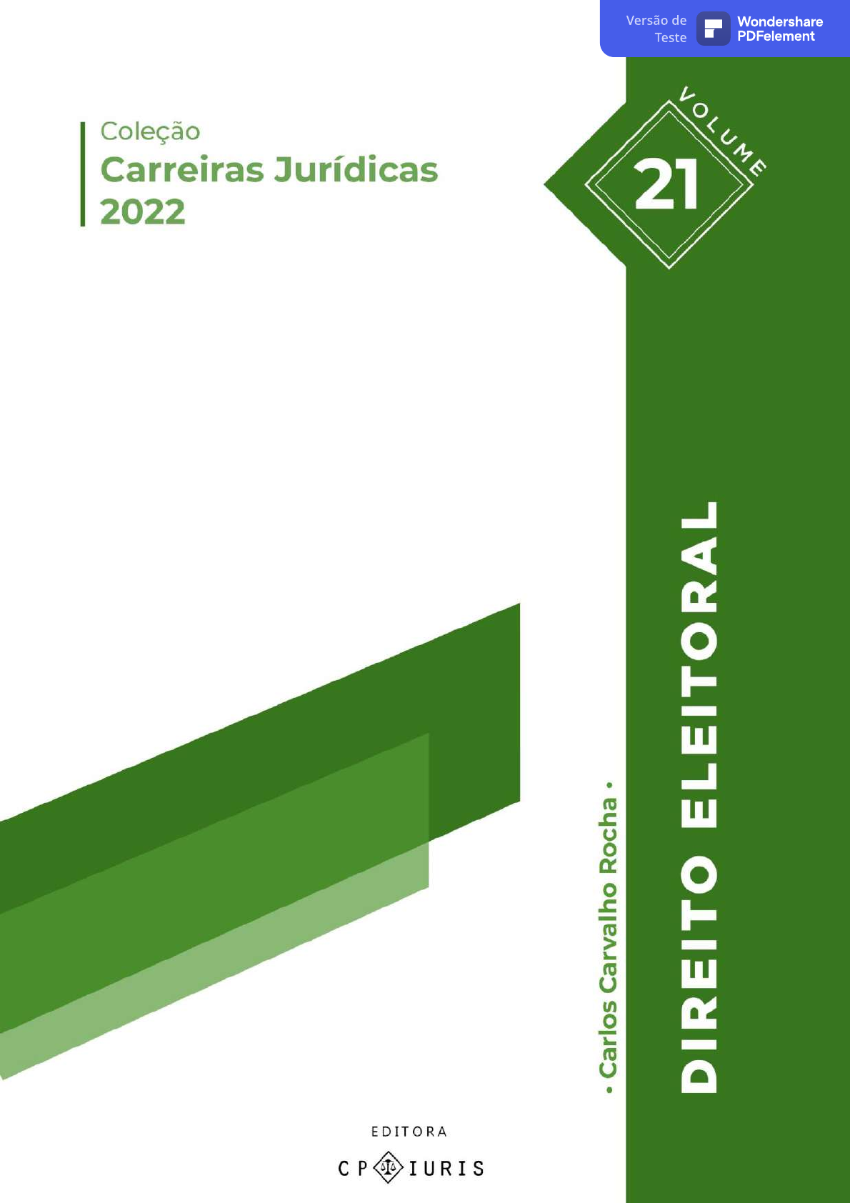 ORGANIZADO POR CP IURIS ISBN 978-65-5701-023-5 DIREITO ELEITORAL 3ª edição Brasília 2022 SOBRE O AUTOR CARLOS CARVALHO ROCHA. Advogado especialista em Direito Eleitoral e Direito Público. Mestrando em Direito e Negócios Internacionais. Ex-Assessor da Governadoria do Distrito Federal. Consultor e Assessor Jurídico Parlamentar. Ex-Presidente da Comissão Nacional de Direito Eleitoral da Associação Brasileira de Advogados - ABA - Membro da Comissão de Direito Eleitoral da OAB-DF. SUMÁRIO CAPÍTULO 1 - NOÇÕES INTRODUTÓRIAS ..................................................................................................................... 9 1. CONCEITO E OBJETO DO DIREITO ELEITORAL ................................................................................................................... 10 2. FONTES DO DIREITO ELEITORAL ................................................................................................................................... 10 3. DEMOCRACIA ..................................................................................................................................................... 10 3.1. Democracia direta ...................................................................................................................................... 10 3.2. Democracia indireta ................................................................................................................................... 11 3.3. Democracia semidireta (participativa) ........................................................................................................ 11 4. PODER DE SUFRÁGIO POPULAR .................................................................................................................................... 12 5. MANDATO POLÍTICO ................................................................................................................................................. 13 6. PRINCÍPIOS DO DIREITO ELEITORAL .............................................................................................................................. 14 6.1. Princípio da isonomia.................................................................................................................................. 14 6.2. Princípio da celeridade ................................................................................................................................ 14 6.3. Princípio da anualidade eleitoral ................................................................................................................. 14 6.4. Princípio do aproveitamento do voto .......................................................................................................... 14 6.5. Princípio da moralidade eleitoral ................................................................................................................ 14 6.6. Princípio republicano .................................................................................................................................. 15 6.7. Princípio da periodicidade da investidura das funções eleitorais .................................................................. 15 CAPÍTULO 2 - SISTEMAS ELEITORAIS ......................................................................................................................... 17 1. SISTEMA MAJORITÁRIO.............................................................................................................................................. 18 2. SISTEMA PROPORCIONAL ........................................................................................................................................... 18 3. SISTEMA ELEITORAL MISTO ......................................................................................................................................... 20 3.1. Sistema eleitoral misto de origem alemã ..................................................................................................... 20 3.2. Sistema eleitoral misto de origem mexicana ............................................................................................... 20 CAPÍTULO 3 - PARTIDOS POLÍTICOS .......................................................................................................................... 22 1. DISPOSIÇÕES CONSTITUCIONAIS .................................................................................................................................. 23 2. LEI DOS PARTIDOS POLÍTICOS (LEI N.º 9.096/95) ............................................................................................................ 23 3. CRIAÇÃO E REGISTRO DOS PARTIDOS POLÍTICOS ............................................................................................................... 24 4. FUSÃO, INCORPORAÇÃO E EXTINÇÃO DOS PARTIDOS POLÍTICOS ............................................................................................ 25 4.1. Fusão de partidos políticos (art. 29 da Lei n.º 9.096/95) .............................................................................. 25 4.2. Incorporação de partidos políticos (art. 29, § 2º, da Lei n.º 9.096/95) .......................................................... 26 4.3. Extinção dos partidos políticos (art. 28 da Lei n.º 9.096/95) ......................................................................... 26 5. FUNCIONAMENTO PARLAMENTAR E A CLÁUSULA DE BARREIRA ............................................................................................. 27 6. RESPONSABILIDADE CIVIL E TRABALHISTA DOS ÓRGÃOS PARTIDÁRIOS ..................................................................................... 27 7. DISCIPLINA PARTIDÁRIA E FIDELIDADE PARTIDÁRIA ............................................................................................................ 27 8. FILIAÇÃO PARTIDÁRIA ......................................................................