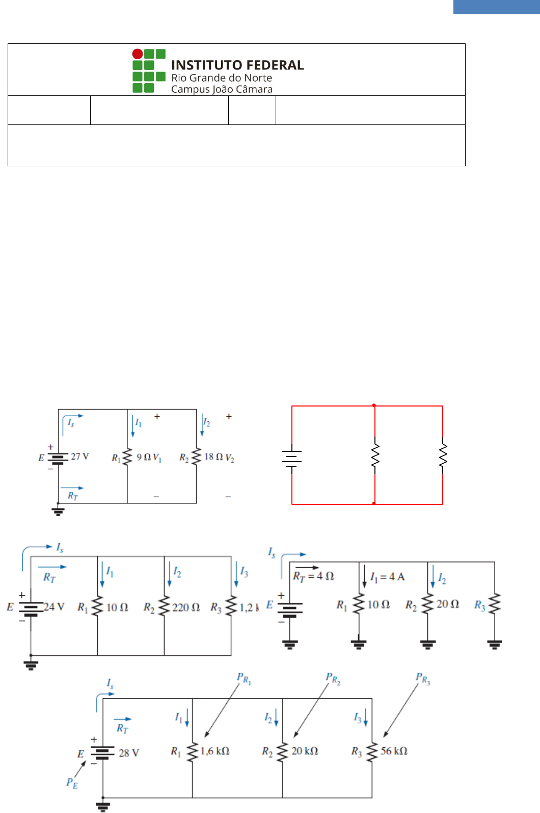 1 Eletricidade Básica – 2ª Lista de Exercícios Disciplina Eletricidade Básica Turma Técnico de Nível Médio em Eletrotécnica, na Forma Integrado 2ª Lista de Exercícios 1. Quatro lâmpadas de 60 W, cada uma com a mesma resistência, estão ligadas em paralelo, através de um terminal residencial de 120 V, produzindo uma corrente de linha de 2 A. a) Qual a resistência total (RT) do circuito? b) A resistência R de cada lâmpada? c) A corrente que cada lâmpada gasta? 2. Para o circuito cada circuito abaixo, calcule (a) a resistência total, (b) a corrente em cada ramo, (c) a corrente total (descubra a corrente fornecida pela fonte), d) calcule a potência fornecida pela fonte - PE, e) determine a potência absorvida por cada resistor em paralelo. V1 12 V R1 20Ω R2 30Ω 2 Eletricidade Básica – 2ª Lista de Exercícios 3. Um farol de automóvel de resistência desconhecida é colocado em paralelo com o acendedor de cigarros de 75 Ω de resistência. Se passar uma corrente de 0,8 A quando é aplicada uma tensão de 12 V, qual a resistência do farol? 4. Duas resistências estão associadas em paralelo conforme ilustra a figura a seguir. Calcule a corrente em cada resistência. 5. Calcule I3 no circuito paralelo. 6. No circuito a seguir, calcule V se I3 = 0,2 A. A seguir, calcule IT. 3 Eletricidade Básica – 2ª Lista de Exercícios 7. A resistência total da associação vista a seguir é fornecida. Calcule o valor desconhecido. 8. No circuito da Figura abaixo, calcule as resistências R1 e R3, a resistência equivalente RT e a tensão da fonte E.