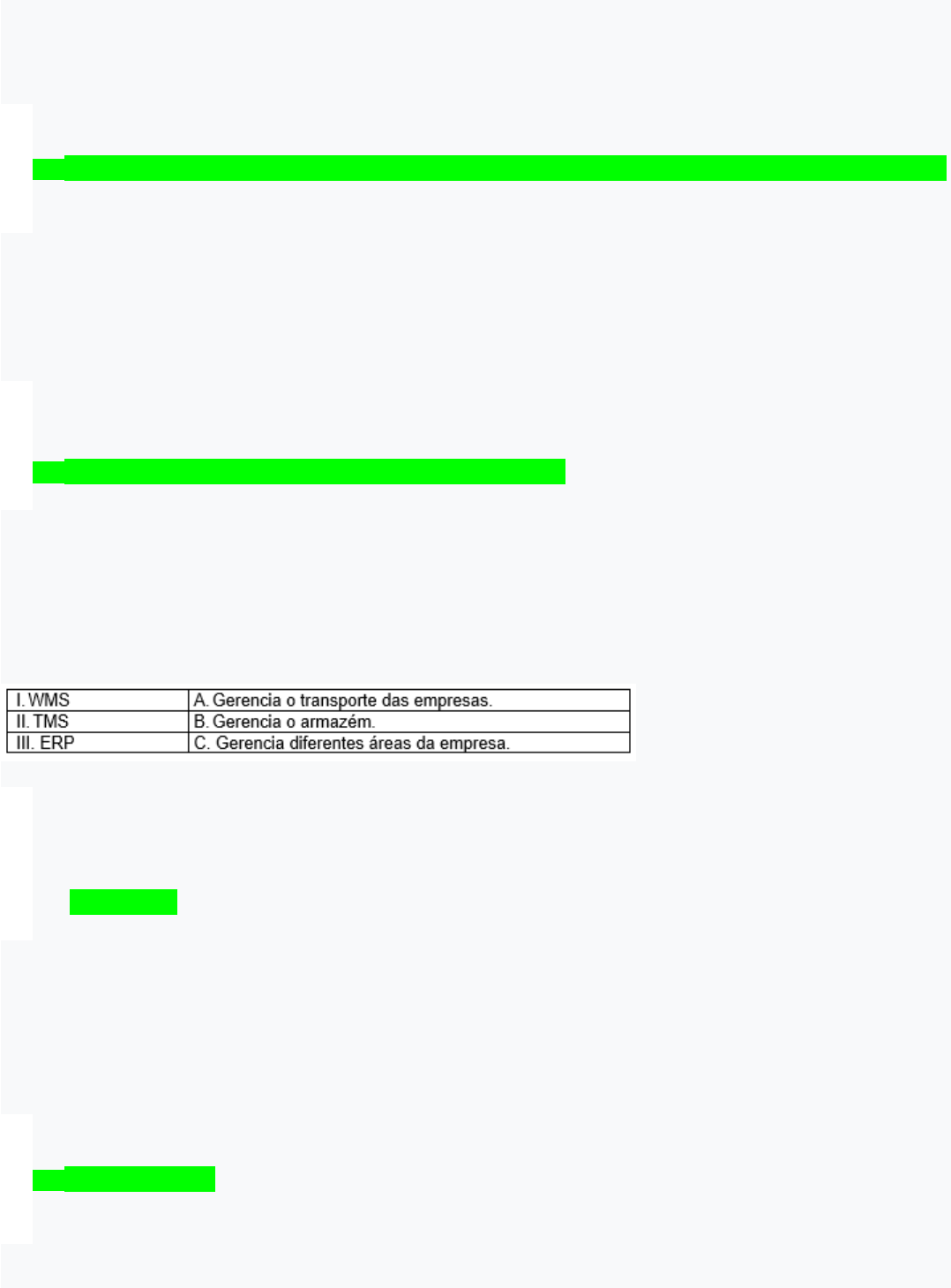 AVALIAÇÃO Armazenagem, gestão de transportes e distribuição 1)O modal menos conhecido é o dutoviário, mas que tem um grande potencial em um país continental como o Brasil. Assinale a alternativa que contém apenas dificuldades e impedimentos para o aumento do modal no país. · Facilidades ambientais e legislação restrita para seu crescimento. · Poucas empresas com expertise de operação e falta de espaço para instalação. · Alto custo de implantação e necessidade de monitoramento constante para evitar vazamentos e furtos. · Presença de mão de obra intensiva e de baixa qualificação. · Alto custo e baixa qualidade do aço. Código da questão: 70376 2)O produto entra no armazém pelo _________, depois é _________. Assim que a empresa recebe um pedido, ele é _________, e depois __________ e _________. Assinale a alternativa que completa adequadamente as lacunas: · Recebimento; conferido; armazenado; conferido; separado. · Recebimento; expedido; armazenado; separado; conferido. · Recebimento; separado; armazenado; conferido; expedido. · Recebimento; armazenado; separado; conferido; expedido. · Recebimento; conferido; armazenado; separado; armazenado. Código da questão: 70381 3)O WMS (Warehouse Management System – sistemas de gerenciamento de armazéns), o TMS (Transportation Management System – Sistema de Gerenciamento de Transporte) e o ERP (Enterprise Resource Planning – Planejamento de Recursos Empresariais) são fundamentais nas cadeias de suprimentos. Leia e associe as duas colunas conforme as funções de cada software. Assinale a alternativa que traz a associação correta entre as duas colunas: · I-B; II-C; III-A. · I-C; II-A; III-B. · I-A; II-B; III-C. · I-B; II-A; III-C. · I-C; II-B; III-A. Código da questão: 70373 4)O grau de integração e coordenação entre todos os processos logísticos da cadeia de suprimentos a diferencia de outras. Cadeias _________ bem estruturadas agregam valor ao _________, garantindo os produtos e serviços no momento adequados aos usuários. Assinale a alternativa que completa adequadamente as lacunas: · De abastecimento; processo. · De suprimentos; processo. · SCM; cliente final. · Logísticas; fornecedor. · De produção ao cliente; intermediário. Código da questão: 70366 5)As cadeias de suprimentos podem ser classificadas de acordo com suas características. Assinale a alternativa que traz a associação correta entre as duas colunas: · I-B; II-A; III-C. · I-A; II-B; III-C. · I-A; II-C; III-B. · I-C; II-A; III-B. · I-C; II-B; III-A. Código da questão: 70368 6)A respeito dos equipamentos de movimentação de materiais e estruturas para estocagem, analise as assertivas a seguir e identifique as corretas: I. Os carrinhos hidráulicos são acessíveis a praticamente todos os níveis de empresa, pelo seu valor baixo e pouco esforço humano para operá-lo. II. Na estrutura flow rack, utiliza-se a gravidade para deslocamento dos produtos até os separadores. É a mais comum dos armazéns. III. As empilhadeiras podem ser movidas somente a hidrogênio e por eletricidade. IV. Uma estrutura porta-palete com corredores estreitos deve ser utilizada para melhorar a ocupação cúbica do CD. V. A estrutura porta-palete convencional é mais flexível e amplamente utilizada no Brasil. São verdadeiras: · II, III e V, somente. · I, II e IV, somente. · II, III e IV, somente. · III, IV e V, somente. · I, IV e V, somente. Código da questão: 70384 7)O transporte de grãos e minério de ferro é realizado por longas distâncias no do Brasil, percorrendo o caminho que começa no produtor, até ser exportado. Analise as afirmativas a seguir e assinale-as com V (verdadeiro) ou F (falso): ( ) Esse transporte só é possível via modal rodoviário. Apesar de ser mais eficiente, tem alto custo. ( ) É possível transportar grãos e minério de ferro via modal dutoviário, que está amplamente distribuído pelo Brasil. ( ) O modal ferroviário para esse transporte é o mais adequado, apesar de não cobrir todo o país. ( ) O modal rodoviário é uma alternativa factível, apesar da grande quantidade de veículos a serem utilizados. ( ) O modal aéreo é o mais adequado para grãos e minério de ferro. Assinale a alternativa que contenha a sequência correta de V e F: · F – F – F – V – F. · F – F – V – V – F. · V – V – F – V – V. · V – V – F – F – V. · F – V – F – V – F. Código da questão: 70378 8)O controle de custos é fundamental em todas os modais de transporte. Especificamente no modal rodoviário, essa divisão ocorre de acordo com custos fixos e variáveis. Alguns custos fixos são _________, e outros são custos variáveis, como _________. Assinale a alternativa que completa adequadamente as lacunas: · Salários dos motoristas e depreciação dos veículos; remuneração do capital e manutenção preventiva. · Combustível e manutenção preventiva; salários dos motoristas e depreciação dos veículos. · Salários dos motoristas e combustível; IPVA e manutenção preventiva. · Lavagens dos veículos e depreciação dos veículos; combustível e manutenção corretiva. · Salários dos motoristas e depreciação dos veículos; combustível e manutenção preventiva. Código da questão: 70377 9)A respeito dos custos logísticos, analise as afirmativas a seguir e assinale-as com V (verdadeiro) ou F (falso): ( ) A empresa-mãe da cadeia de suprimento busca minimizar todos os seus custos, mas não tem ação sobre as demais empresas da cadeia de suprimentos. ( ) O custo logístico é impactado diretamente pela qualidade das estradas brasileiras. ( ) Os custos devem ser vistos em cada área, e assim será a diminuição de custos da empresa inteira. ( ) O custo brasileiro em logística representa 12,3% do PIB, semelhante ao dos EUA. ( ) O custo deve ser visto de maneira global, visando ao melhor atendimento ao cliente, com o menor custo e mais qualidade. As