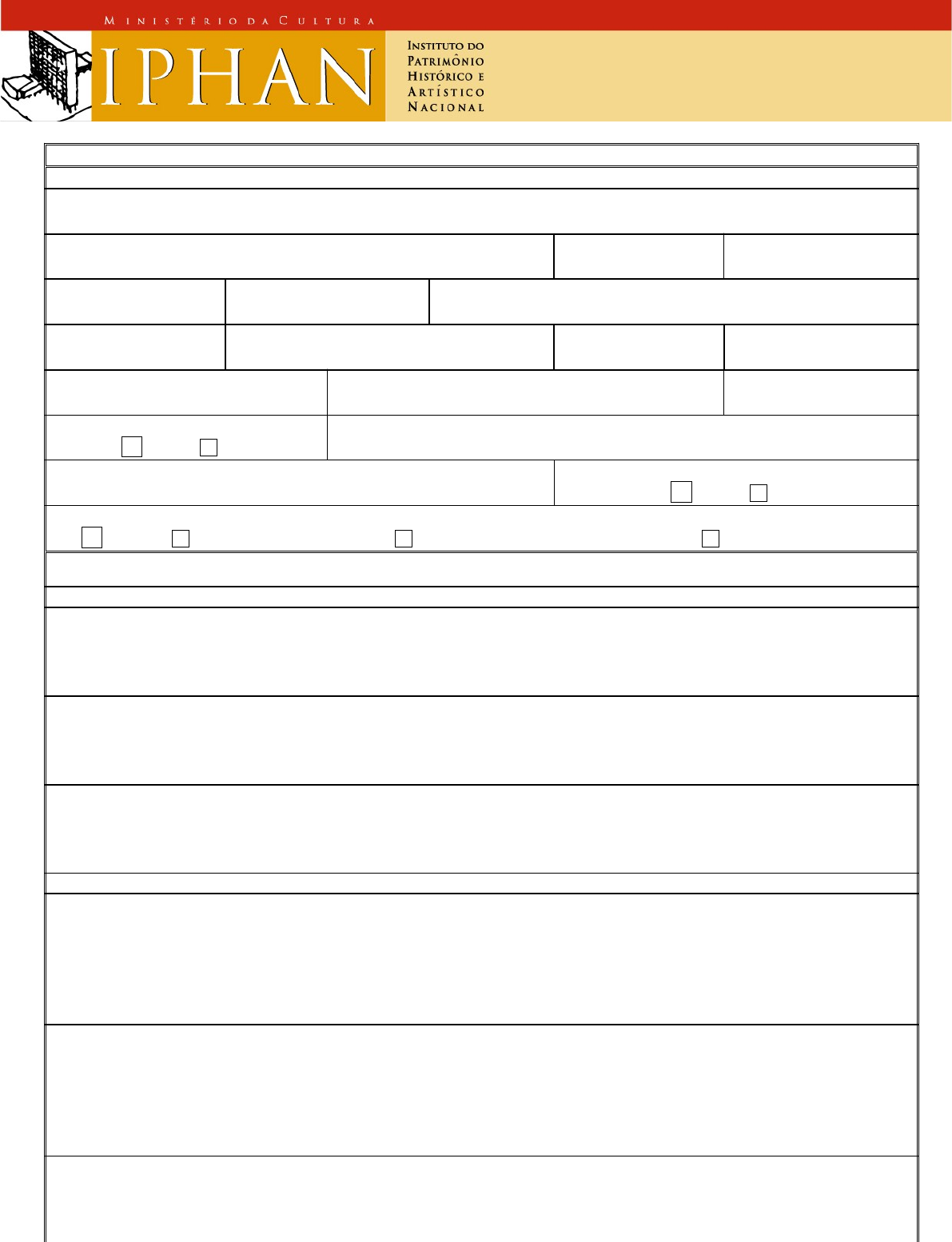 ANEXO I I – DADOS PESSOAIS 1. NOME (sem abreviaturas) 2. ENDEREÇO DE RESIDÊNCIA 3. CIDADE / UF 4. CEP 5. TELEFONE 6. CELULAR 7. E-MAIL 8. DATA NASCIMENTO: / / 9. NATURALIDADE/UF 10. NACIONALIDADE 12. RG / ÓRGÃO EXP. 13. CPF 14. FORMAÇÃO ACADÊMICA 15. REGISTRO DA CATEGORIA 16. CANDIDATO QUILOMBOLA? |_|SIM |_|NÃO 17. SE CANDIDATO QUILOMBOLA (ITEM 17), INDICAR A COMUNIDADE OU TERRITÓRIO/MUNICÍPIO/UF 18. LINK CURRÍCULO LATTES 19. RESIDE EM ESTADO DA CANDIDATURA? |_|SIM |_|NÃO 20. INDICAÇÃO DA ÁREA DE ATUAÇÃO A SE CANDIDATAR |_|Norte |_|Nordeste 01 (BA, SE e AL) |_|Nordeste 02 (PE, PB, RN, CE, PI e MA) |_|Centro-oeste, sudeste, sul II – FORMAÇÃO ESCOLAR OU ACADÊMICA (TODOS OS CURSOS DESCRITOS DEVERÃO SER COMPROVADOS QUANDO DO PROCESSO DE ENTREVISTA, SE HOUVER) 1. CURSOS DE FORMAÇÃO ACADÊMICA 1º CURSO SUPERIOR: INSTITUIÇÃO: PERÍODO (ANO DE INÍCIO E TÉRMINO): 2º CURSO: INSTITUIÇÃO: PERÍODO (ANO DE INÍCIO E TÉRMINO): 3º CURSO: INSTITUIÇÃO: PERÍODO (ANO DE INÍCIO E TÉRMINO): 2. CURSOS DE MESTRADO / DOUTORADO / PÓS-DOUTORADO CURSO MESTRADO: INSTITUIÇÃO: ORIENTADOR: PERÍODO: CURSO DOUTORADO: INSTITUIÇÃO: ORIENTADOR: PERÍODO: CURSO PÓS-DOUTORADO: INSTITUIÇÃO: ORIENTADOR: PERÍODO: 3. ESPECIALIZAÇÃO E/OU APERFEIÇOAMENTO (CONCLUÍDO, A NÍVEL DE PÓS-GRADUAÇÃO) CURSO: INSTITUIÇÃO: PERÍODO: CARGA HORÁRIA: CURSO: INSTITUIÇÃO: PERÍODO: CARGA HORÁRIA: CURSO: INSTITUIÇÃO: PERÍODO: CARGA HORÁRIA: 4. CONHECIMENTO DE INFORMÁTICA: |_| WORD |_| EXCEL |_| WINDOWS |_| ACCES |_| POWERPOINT |_| OUTLOOK |_| OUTROS (ESPECIFICAR): |_| CORELDRAW |_| QGIS |_| AUTOCAD |_| PHOTOSHOP |_| INTERNET 5: APRESENTAÇÃO PESSOAL E OUTRAS INFORMAÇÕES RELEVANTES: III – REGISTRO – EXPERIÊNCIA PROFISSIONAL E CAPACIDADE TÉCNICA (TODOS AS EXPERIÊNCIAS DESCRITAS DEVERÃO SER COMPROVADAS QUANDO DO PROCESSO DE ENTREVISTA) REGISTRO DE EMPREGO: A começar pelo seu cargo atual ou mais recente liste em ordem inversa todos os empregos que você já teve. Especificar as atividades desenvolvidas, de forma objetiva e pormenorizada, deixando evidente a experiência adquirida. Use quadros separados para cada cargo. Caso necessite de mais espaço, anexe páginas adicionais do mesmo tamanho. 1. CARGO ATUAL (CASO ESTEJA DESEMPREGADO ATUALMENTE OU MAIS RECENTE) EXPERIÊNCIA PROFISSIONAL |_| ATIVIDADE COMPROVADA EM AÇÕES E PROJETOS DE PARTICIPAÇÃO SOCIAL |_| ATIVIDADE COMPROVADA EM AÇÕES E PROJETOS DE GESTÃO PARTICIPATIVA NAS ESFERAS GOVERNAMENTAIS |_| ATIVIDADE COMPROVADA EM AÇÕES E PROJETOS JUNTO ÀS COMUNIDADES QUILOMBOLAS |_| OUTRAS EXPERIÊNCIAS PROFISSIONAIS DATA DE ADMISSÃO (dd/mm/aaaa) DATA DE SAÍDA (dd/mm/aaaa) TEMPO DE SERVIÇO: (O cálculo deverá ser feito em anos e meses) EMPREGADOR: CARGO(S) E FUNÇÃO(ÕES) EXERCIDA(S): DESCRIÇÃO DE SUAS ATRIBUIÇÕES / EXPERIÊNCIA ADQUIRIDA Para uso do avaliador Experiência Desejável 2. CARGOS ANTERIORES (EM ORDEM DECRESCENTE) EXPERIÊNCIA PROFISSIONAL |_| ATIVIDADE COMPROVADA EM AÇÕES E PROJETOS DE PARTICIPAÇÃO SOCIAL |_| ATIVIDADE COMPROVADA EM AÇÕES E PROJETOS DE GESTÃO PARTICIPATIVA NAS ESFERAS GOVERNAMENTAIS |_| ATIVIDADE COMPROVADA EM AÇÕES E PROJETOS JUNTO ÀS COMUNIDADES QUILOMBOLAS |_| OUTRAS EXPERIÊNCIAS PROFISSIONAIS DATA DE ADMISSÃO (dd/mm/aaaa) DATA DE SAÍDA (dd/mm/aaaa) TEMPO DE SERVIÇO: (O cálculo deverá ser feito em anos e meses) EMPREGADOR: CARGO(S) E FUNÇÃO(ÕES) EXERCIDA(S): DESCRIÇÃO DE SUAS ATRIBUIÇÕES / EXPERIÊNCIA ADQUIRIDA Para uso do avaliador Experiência Desejável 3. CARGOS ANTERIORES (EM ORDEM DECRESCENTE) EXPERIÊNCIA PROFISSIONAL |_| ATIVIDADE COMPROVADA EM AÇÕES E PROJETOS DE PARTICIPAÇÃO SOCIAL |_| ATIVIDADE COMPROVADA EM AÇÕES E PROJETOS DE GESTÃO PARTICIPATIVA NAS ESFERAS GOVERNAMENTAIS |_| ATIVIDADE COMPROVADA EM AÇÕES E PROJETOS JUNTO ÀS COMUNIDADES QUILOMBOLAS |_| OUTRAS EXPERIÊNCIAS PROFISSIONAIS DATA DE ADMISSÃO (dd/mm/aaaa) DATA DE SAÍDA (dd/mm/aaaa) TEMPO DE SERVIÇO: (O cálculo deverá ser feito em anos e meses) EMPREGADOR: CARGO(S) E FUNÇÃO(ÕES) EXERCIDA(S): DESCRIÇÃO DE SUAS ATRIBUIÇÕES / EXPERIÊNCIA ADQUIRIDA Para uso do avaliador Experiência Desejável 4. CARGOS ANTERIORES (EM ORDEM DECRESCENTE) EXPERIÊNCIA PROFISSIONAL |_| ATIVIDADE COMPROVADA EM AÇÕES E PROJETOS DE PARTICIPAÇÃO SOCIAL |_| ATIVIDADE COMPROVADA EM AÇÕES E PROJETOS DE GESTÃO PARTICIPATIVA NAS ESFERAS GOVERNAMENTAIS |_| ATIVIDADE COMPROVADA EM AÇÕES E PROJETOS JUNTO ÀS COMUNIDADES QUILOMBOLAS |_| OUTRAS EXPERIÊNCIAS PROFISSIONAIS DATA DE ADMISSÃO (dd/mm/aaaa) DATA DE SAÍDA (dd/mm/aaaa) TEMPO DE SERVIÇO: (O cálculo deverá ser feito em anos e meses) EMPREGADOR: CARGO(S) E FUNÇÃO(ÕES) EXERCIDA(S): DESCRIÇÃO DE SUAS ATRIBUIÇÕES / EXPERIÊNCIA ADQUIRIDA Para uso do avaliador Experiência Desejável 5. CARGOS ANTERIORES (EM ORDEM DECRESCENTE) EXPERIÊNCIA PROFISSIONAL |_| ATIVIDADE COMPROVADA EM AÇÕES E PROJETOS DE PARTICIPAÇÃO SOCIAL |_| ATIVIDADE COMPROVADA EM AÇÕES E PROJETOS DE GESTÃO PARTICIPATIVA NAS ESFERAS GOVERNAMENTAIS |_| ATIVIDADE COMPROVADA EM AÇÕES E PROJETOS JUNTO ÀS COMUNIDADES QUILOMBOLAS |_| OUTRAS EXPERIÊNCIAS PROFISSIONAIS DATA DE ADMISSÃO (dd/mm/aaaa) DATA DE SAÍDA (dd/mm/aaaa) TEMPO DE SERVIÇO: (O cálculo deverá ser feito em anos e meses) EMPREGADOR: CARGO(S) E FUNÇÃO(ÕES) EXERCIDA(S): DESCRIÇÃO DE SUAS ATRIBUIÇÕES / EXPERIÊNCIA ADQUIRIDA Para uso do avaliador Experiência Desejável 6. CARGOS ANTERIORES (EM ORDEM DECRESCENTE) EXPERIÊNCIA PROFISSIONAL |_| ATIVIDADE COMPROVADA EM AÇÕES E PROJETOS DE PARTICIPAÇÃO SOCIAL |_| ATIVIDADE COMPROVADA EM AÇÕES E PROJETOS DE GESTÃO PARTICIPATIVA NAS ESFERAS GOVERNAMENTAIS |_| ATIVIDADE COMPROVADA EM AÇÕES E PROJETOS JUNTO ÀS COMUNIDADES QUILOMBOLAS |_| OUTRAS EXPERIÊNCIAS PROFISSIONAIS DATA DE ADMISSÃO (dd/mm/aaaa) DATA DE SAÍDA (dd/mm/aaaa) TEMPO DE SERVIÇO: (O cálculo deverá ser feito em anos e meses) EMPREGADOR: CARGO(S) E FUNÇ