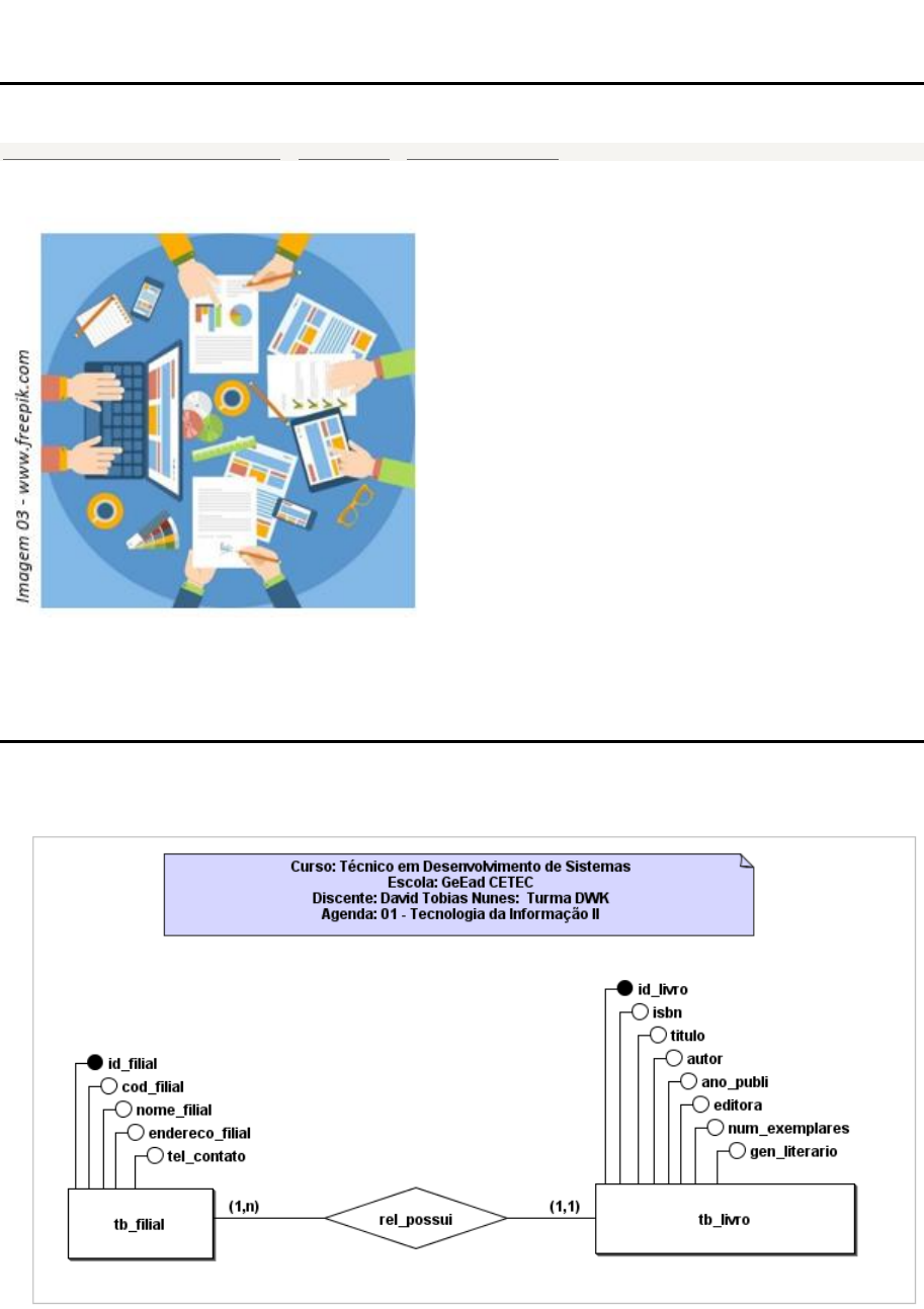 Pág. 1 de 4. AGENDA 01 – TECNOLOGIA DA INFORMAÇÃO II • Curso: Técnico em Desenvolvimento de Sistemas | Turma: DWK | Módulo: 2º | Vigência: 2/2024 • Disciplina: Gerenciamento de Banco de Dados | Data: 02/08/2024 • Discente: David Tobias Nunes Enunciado: Agenda 01 - Tecnologia da Informação II » Apresentação » Introdução ao Fichário » Fichário Este exercício deve ser entregue de forma on-line como atividade da agenda. A rede de bibliotecas Virtual deseja implementar um sistema para gerenciar o acervo de livros disponíveis em suas várias filiais. Cada filial possui uma coleção específica de livros, e um livro pode estar registrado em apenas uma filial. Os registros devem incluir os seguintes atributos: Filial: código, nome, endereço, telefone de contato Livro: ISBN, título, autor, ano de publicação, editora, número de exemplares, gênero literário Com base nessas informações desenvolva os Modelos Conceitual (DE-R, Diagrama Entidade Relacionamento) e Lógico utilizando a ferramenta brModelo, e crie o Banco de Dados no SGBD MySQL e evidencie sua criação enviando também a instrução SQL (o comandos) utilizada para criá-lo. OBS.: Não é necessário criar as tabelas apenas o Banco de Dados. Competências estudadas nesta atividade: Competência: Construir banco de dados relacional utilizando o Sistema Gerenciador de banco de dados. Habilidades: Utilizar sistema de gerenciamento para banco de dados. O prazo para envio desta atividade é: 12/08/2024 08:00 Figura 1 – DER (Diagrama Entidade Relacionamento). https://eadtec.cps.sp.gov.br/cenario.php?id_aula=939 https://eadtec.cps.sp.gov.br/cenario.php/apresentacao.php?id_atividade=6753&id_aula=939 javascript:history.go(-1) Pág. 2 de 4. Figura 2 – MER (Modelo Entidade Relacionamento). Linguagem MySql -- CREATE DATABASE -- Criar banco de dados "bbvALEXANDRIA" se ele não existir CREATE DATABASE IF NOT EXISTS bbvALEXANDRIA; Figura 3 – Servidor WEB (Apache) + MySql (SGBD phpMyAdmin) integrados no XAMPP Pág. 3 de 4. Figura 4 – Acesso facilitado ao SGBG (phpMyAdmin) com um clique. Figura 5 – Tela inicial do SGBD phpMyadmin. Pág. 4 de 4. Figura 6 – Criação do banco de dados "bbvALEXANDRIA". Inserção do comando SQL: -- A sintaxe abaixo criara um banco de dados com o nome de bbvALEXANDRIA somente se ele já não existir. CREATE DATABASE IF NOT EXISTS bbvALEXANDRIA; Figura 7 – Ao executar o comando, o SGBD cria o banco de dados. Considerações: Conforme enunciado foi criado unicamente o banco de dados, não foi criado usuário e atribuições de permissão a esse usuário, e nem mesmo as tabelas, chaves primárias, estrangeiras, e nem inserção de dados nos atributos (colunas/campos) das entidades (tabelas). AGENDA 01 – TECNOLOGIA DA INFORMAÇÃO II