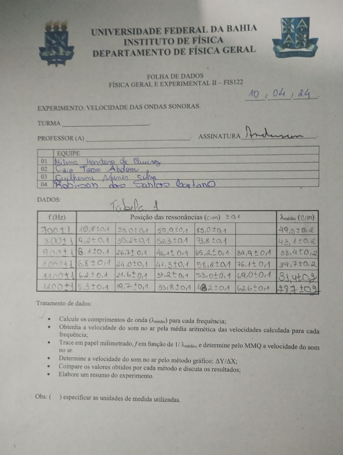 Física Experimental 2 - FISD41 Experimento: VELOCIDADE DAS ONDAS SONORAS Turma: 04 Data: Aluno 1: Milena Monteiro de Queiroz Aluno 2: Caio Tarso Abdom Aluno 3: Guilherme Nunes Silva Aluno 4: Robison dos Santos Caetano 1. Introdução: Nesse experimento estudamos a velocidade de propagação do som no ar, isso, dentro de um tubo contendo em sua parte água; na extremidade superior do tubo está um gerador de áudio frequência (autofalante) onde a altura da água é controlada por uma outra mangueira que está na extremidade inferior do tubo com água ligada na sua outra extremidade há uma vasilha com água. É como uma mangueira de nível: quando a altura de uma extremidade sobe a outra sobe; assim controlamos o nível de água no tubo. Definimos uma frequência e determinamos a posição de ressonância ouvindo o som mais alto. Foram 4 posições de ressonância para as duas primeiras frequências e 5 posições de ressonância para as 4 ultimas. Para cada uma dessas listas horizontais encontrada na tabela principal (1) uma equipe foi responsável por tirar as medidas. No total foram 4 equipes, depois as duas primeiras equipes retiraram mais duas listas de medidas. Nossa primeira intenção foi obter os valores experimentais de 𝜆𝑚é𝑑𝑖𝑜 calculando os 𝜆 com a formula 𝐿𝑛+1 − 𝐿𝑛 = 2 ∙ A frequência foi dada em Hertz. A posição de ressonância em centímetros. E o comprimento da onda em centímetros. 2. Procedimento experimental: Como dito na introdução, variamos a altura da coluna de água para obter as posições de ressonância das ondas. Fixamos a frequência em 700 Hz, encontramos as posições de ressonância, enquanto um colega prendia a coluna de água numa posição de ressonância o outro observava a distância 𝐿, nos dando o resultado, vide primeira linha da tabela 1; encontramos os ’s com a formula 𝐿𝑛+1 − 𝐿𝑛 = 2 ∙ e depois calculamos o 𝜆𝑚é𝑑𝑖𝑜 usando a média aritmética. Repetimos esse procedimento com os outros 5 resultados listados na tabela seguinte. 𝑓(𝐻𝑧) 𝜆′𝑠 𝜆𝑚é𝑑𝑖𝑜 700±1 48,4±0,1 49,8±0,1 50,2±0,1 49,5±0,2 800±1 42,0±0,1 44,2±0,1 43,0±0,1 43,1±0,2 900±1 37,2±0,1 38,8±0,1 38,2±0,1 39,4±0,1 38,4±0,2 1000±1 34,4±0,1 34,6±0,1 33,8±0,1 35,8±0,1 34,7±0,2 1100±1 30,8±0,1 31,2±0,1 31,6±0,1 32,0±0,1 31,4±0,2 1200±1 28,8±0,1 28,2±0,1 28,8±0,1 28,8±0,1 28,7±0,2 Traçamos em papel milimetrado 𝑓 em função de 1/ 𝜆𝑚é𝑑𝑖𝑜 ver a tabela dos valores a seguir: 𝑓 (Hz) 1/ 𝜆𝑚é𝑑𝑖𝑜(cm) 700±1 0,0202±0,0002 800±1 0,0232±0,0002 900±1 0,0260±0,0002 1000±1 0,0288±0000,2 1100±1 0,0318±0,0002 1200±1 0,0348±0,0002 Conferir gráfico na tabela 2. Agora vamos determinar a velocidade do som pelo MMQ. ∑ 𝑥 ∙ 𝑦 (∑ 𝑥) 2 ∑ 𝑥2 ∑ 𝑥 ∑ 𝑦 ∑ 𝑥 ∑ 𝑦 161∙ 102 0,0272 4,67∙ 10−2 0,165 570∙ 10 941 Nossa função é 𝑓 = 𝑎 ∙ 1 𝜆𝑚é𝑑𝑖𝑜 + 𝑏 . Então, pelo MMQ 𝑎 = 𝑛 ∑ 𝑥𝑦−∑ 𝑥 ∑ 𝑦 𝑛 ∑ 𝑥2−(∑ 𝑥)2 = 378 ∙ 103𝑐𝑚/𝑠 que é a velocidade do som no ar. Determinando a velocidade do som no ar por ∆𝑌 ∆𝑋 = 1200−700 0,0348−0,0202 = 342 ∙ 102𝑐𝑚/𝑠 Aqui você apresenta o procedimento experimental. Você pode se basear no roteiro e nas montagens usadas em aula para escrever essa seção. Descreva como as medidas foram feitas de forma que outra pessoa que leia seu texto seja capaz de reproduzi-las. A inclusão de uma figura pode ser útil para explicar melhor os procedimentos experimentais. 3. Resultados: Foi encontrado indiretamente a velocidade do som no ar e tivemos, pelo método dos mínimos quadrados um resultado 10 vezes maior, enquanto que pela variação do coeficiente linear deu um resultado mais próximo da velocidade do som no ar. 4. Conclusão: O método dos mínimos quadrados nos deu um resultado muito diferente do esperado. Por outro lado o método da extração da velocidade pelo coeficiente 𝑎 = ∆𝑌/∆𝑋, nos deu um valor mais próximo da realidade da velocidade do som no ar. Foi feito o gráfico da função do primeiro grau de 𝑓 𝑋 1/ 𝜆𝑚é𝑑𝑖𝑜 e de fato o valor da velocidade confere medindo dois pontos no gráfico.