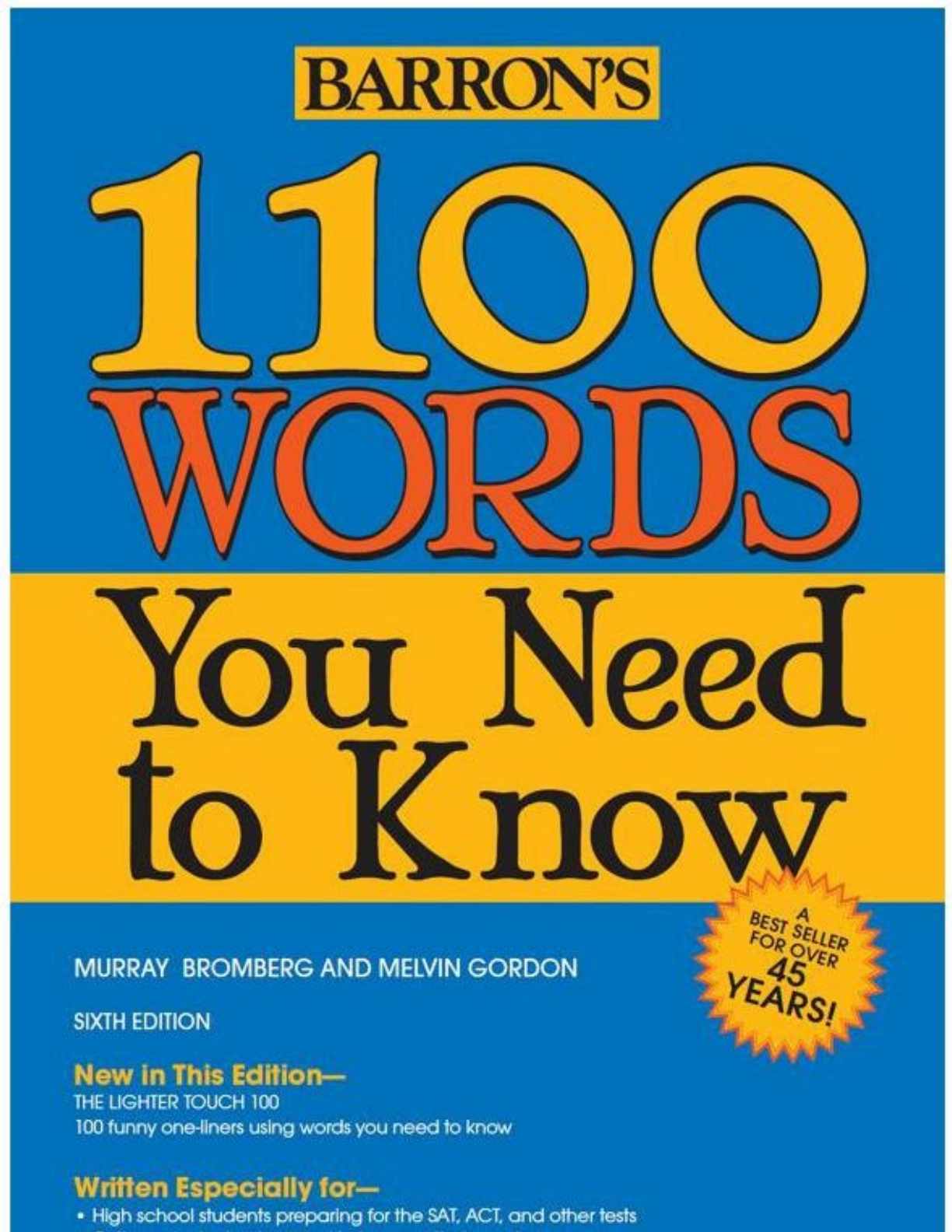 © Copyright 2013, 2008, 2000, 1993, 1987, 1971 by Barron’s Educational Series, Inc. All rights reserved. No part of this work may be reproduced or distributed in any form or by any means without the written permission of the copyright owner. All inquiries should be addressed to: Barron’s Educational Series, Inc. 250 Wireless Boulevard Hauppauge, NY 11788 www.barronseduc.com Library of Congress Catalog Card No. 2012938495 eISBN: 978-1-4380-9205-8 CONTENTS Full Pronunciation Key WEEKS 1 WEEKS 2 WEEKS 3 WEEKS 4 WEEKS 5 WEEKS 6 WEEKS 7 WEEKS 8 WEEKS 9 WEEKS 10 WEEKS 11 WEEKS 12 WEEKS 13 WEEKS 14 WEEKS 15 WEEKS 16 WEEKS 17 WEEKS 18 WEEKS 19 WEEKS 20 WEEKS 21 WEEKS 22 WEEKS 23 WEEKS 24 WEEKS 25 WEEKS 26 WEEKS 27 WEEKS 28 WEEKS 29 WEEKS 30 WEEKS 31 WEEKS 32 WEEKS 33 WEEKS 34 WEEKS 35 WEEKS 36 WEEKS 37 WEEKS 38 WEEKS 39 WEEKS 40 WEEKS 41 WEEKS 42 WEEKS 43 WEEKS 44 WEEKS 45 WEEKS 46 Buried Words Words in Context Answers Final Review Test Panorama of Words Bonus Weeks VOC/QUOTE The Lighter Touch 100 PANORAMA OF WORDS INTRODUCTION The study of the English language has spread all over the world, and high school and college students everywhere have come to realize that language mastery depends on the possession of a comprehensive vocabulary. This is just what 1100 Words You Need to Know has been offering through the five earlier editions and continuing on this sixth one. We are proud that Amazon.com has rated this book as the number one best seller in its category. In addition to the various exercises that help readers learn challenging vocabulary, we have now added a section called “The Lighter Touch 100,” which shows that vocabulary can be taught with a sense of humor. By investing a mere 15 minutes with this new book, you will soon see a dramatic improvement in your vocabulary. Murray Bromberg Melvin Gordon FULL PRONUNCIATION KEY a bat, trap j just, enjoy bull, pull ā rage, lace k kin, talk ü dual, sue ä jar, farther l lose, hurl m mice, cram v vast, have b bag, sob n not, into w wish, wood ch chill, such ng song, ring y youth, yes d done, said z zoo, zest o rot, cot zh pleasure, treasure e met, rest ō tow, blow ē ease, see ô cord, lord ə stands for: er fern, learn oi toil, boil a in around ou mouse, bout e in waken f feel, stiff i in cupid g gone, big p pest, cap o in demon h him, hold r red, art u in brush s see, best i inch, pin sh crush, crash ī ivy, hive t time, act th this, math they, booth Since this is an eBook, please record all your Answers separately. * All questions contain a link to their Answers/Explanations. NEW WORDS voracious və rā´ shəs indiscriminate in´ dis krim´ ə nit eminent em´ ə nənt steeped stēpt replete ri´ plēt´ WEEK 1 DAY 1 READING WISELY The youngster who reads voraciously, though indiscriminately, does not necessarily gain in wisdom over the teenager who is more selective in his reading choices. A young man who has read the life story of every eminent athlete of the twentieth century, or a coed who has steeped herself in every social-protest novel she can get her hands on, may very well be learning all there is to know in a very limited area. But books are replete with so many wonders that it is often discouraging to see bright young people limit their own experiences. Sample Sentences On the basis of the above paragraph, try to use your new words in the following sentences. Occasionally it may be necessary to change the ending of a word; e.g., indiscriminate to indiscriminately. 1.The football game was ________________ with excitement and great plays. 2.The ________________ author received the Nobel Prize for literature. 3.My cousin is so ________________ in schoolwork that his friends call him a bookworm. 4.After skiing, I find that I have a ________________ appetite. 5.Modern warfare often results in the ________________ killing of combatants and innocent civilians alike. Definitions Now that you have seen and used the new words in sentences, and have the definitions “on the tip of your tongue,” try to pair the words with their meanings. 6.voracious a. of high reputation, outstanding 7.indiscriminate b. completely filled or supplied with 8.eminent c. choosing at random without careful selection 9.steeped d. desiring or consuming great quantities 10.replete e. soaked, drenched, saturated TODAY’S IDIOM to eat humble pie—to admit your error and apologize After his candidate had lost the election, the boastful campaign manager had to eat humble pie. NEW WORDS abound ə bound´ technology tek nol´ ə jē prognosticate prog nos´ tə kāt automaton ô tom´ ə ton matron mā´ trən WEEK 1 DAY 2 SOLVING THE SERVANT PROBLEM The worlds of science-fiction abound with wonders. Yet modern technology progresses so rapidly that what may be today’s wild dream may be next year ’s kitchen appliance. A British scientist has prognosticated that within ten years every suburban matron will have her own robot servant. One task this domesticated automaton will not have to contend with will be scouring the oven because even today the newest ranges can be “programmed” to reduce their own baked-on grime to easily disposed of ashes. Sample Sentences Now that you’ve seen the words used in context, and—hopefully—have an idea of their meanings, try to use them in the following sentences. Remember that a word- ending may have to be changed. 1.The mayor refused to ________________ as to his margin of victory in the election. 2.The time is approaching when human workers may be replaced by ________________. 3.A clever salesman will always ask a ________________ if her mother is at home. 4.The western plains used to ________________ with bison before those animals were slaughtered by settlers. 5.Man may be freed from backbreaking labor by the products of scientific ________________. Definitions Test yourself now by matching the new words with the definitions. If you are not sure of yourself, cover the top half of this page before you begin. 6.ab