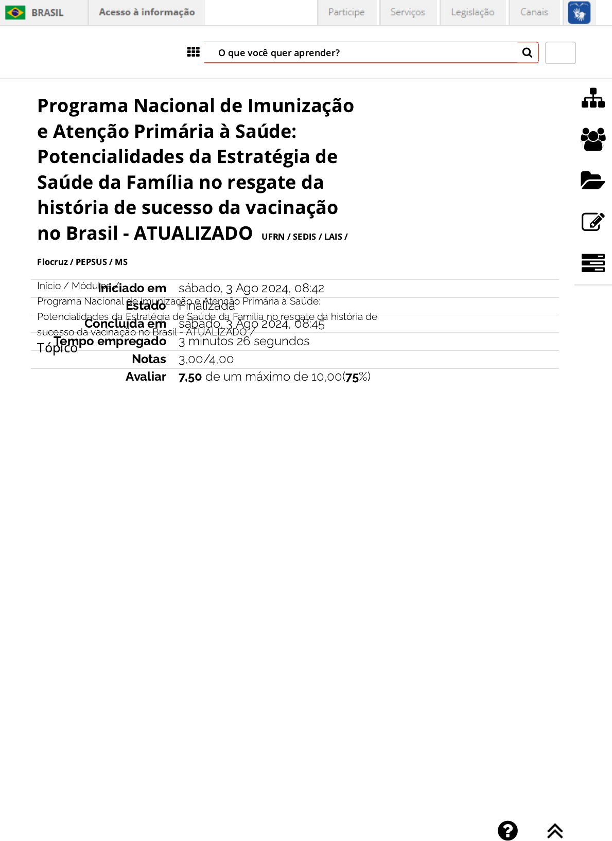 Iniciado em sábado, 3 Ago 2024, 08:42 Estado Finalizada Concluída em sábado, 3 Ago 2024, 08:45 Tempo empregado 3 minutos 26 segundos Notas 3,00/4,00 Avaliar 7,50 de um máximo de 10,00(75%) Programa Nacional de Imunização e Atenção Primária à Saúde: Potencialidades da Estratégia de Saúde da Família no resgate da história de sucesso da vacinação no Brasil - ATUALIZADO UFRN / SEDIS / LAIS / Fiocruz / PEPSUS / MS Início / Módulos / Programa Nacional de Imunização e Atenção Primária à Saúde: Potencialidades da Estratégia de Saúde da Família no resgate da história de sucesso da vacinação no Brasil - ATUALIZADO / Tópico 100% O que você quer aprender? https://avasus.ufrn.br/?redirect=1 https://avasus.ufrn.br/?redirect=1 https://avasus.ufrn.br/?redirect=1 https://avasus.ufrn.br/?redirect=1 https://avasus.ufrn.br/?redirect=1 https://avasus.ufrn.br/local/avasplugin/cursos/cursos.php https://avasus.ufrn.br/local/avasplugin/cursos/cursos.php https://avasus.ufrn.br/local/avasplugin/cursos/cursos.php https://avasus.ufrn.br/local/avasplugin/cursos/cursos.php https://avasus.ufrn.br/local/avasplugin/cursos/cursos.php https://avasus.ufrn.br/course/view.php?id=688 https://avasus.ufrn.br/course/view.php?id=688 https://avasus.ufrn.br/course/view.php?id=688 https://avasus.ufrn.br/course/view.php?id=688 https://avasus.ufrn.br/course/view.php?id=688 https://avasus.ufrn.br/course/view.php?id=688 https://avasus.ufrn.br/course/view.php?id=688 https://avasus.ufrn.br/course/view.php?id=688 https://avasus.ufrn.br/course/view.php?id=688 https://avasus.ufrn.br/course/view.php?id=688 https://avasus.ufrn.br/course/view.php?id=688 https://avasus.ufrn.br/course/view.php?id=688 https://avasus.ufrn.br/course/view.php?id=688 https://avasus.ufrn.br/course/view.php?id=688 https://avasus.ufrn.br/course/view.php?id=688 https://avasus.ufrn.br/course/view.php?id=688 https://avasus.ufrn.br/course/view.php?id=688 https://avasus.ufrn.br/course/view.php?id=688 https://avasus.ufrn.br/course/view.php?id=688 https://avasus.ufrn.br/course/view.php?id=688 https://avasus.ufrn.br/?redirect=1 Questão 1 Correto Atingiu 1,00 de 1,00 Algumas situações precisam de uma atenção especial, pois muitas vezes são confundidas com contraindicações verdadeiras e, na verdade, são falsas contraindicações. Nesses casos, o profissional precisa ficar bastante atento, pois a falsa orientação pode interferir de forma importante para o alcance das metas e dos percentuais de cobertura dos grupos-alvo. Dos exemplos a seguir, assinale a alternativa que apresenta uma situação que caracteriza a ocorrência de falsas contraindicações (BRASIL, 2014): Escolha uma opção: a. Quando o usuário é contato domiciliar não-vacinado de gestantes, não transmite os vírus vacinais do sarampo, da caxumba ou da rubéola. b. Antecedente familiar de convulsão ou morte súbita. Antecedente familiar de convulsão ou morte súbita não contraindica a administração de uma vacina. c. Alergias graves a algum componente de determinada vacina (anafilaxia comprovada) d. Doença aguda benigna com febre – quando a criança apresenta histórico de doença grave ou infecção simples das vias respiratória superiores. Sua resposta está correta. Programa Nacional de Imunização e Atenção Primária à Saúde: Potencialidades da Estratégia de Saúde da Família no resgate da história de sucesso da vacinação no Brasil - ATUALIZADO UFRN / SEDIS / LAIS / Fiocruz / PEPSUS / MS Início / Módulos / Programa Nacional de Imunização e Atenção Primária à Saúde: Potencialidades da Estratégia de Saúde da Família no resgate da história de sucesso da vacinação no Brasil - ATUALIZADO / Tópico 100% https://avasus.ufrn.br/?redirect=1 https://avasus.ufrn.br/?redirect=1 https://avasus.ufrn.br/?redirect=1 https://avasus.ufrn.br/?redirect=1 https://avasus.ufrn.br/?redirect=1 https://avasus.ufrn.br/local/avasplugin/cursos/cursos.php https://avasus.ufrn.br/local/avasplugin/cursos/cursos.php https://avasus.ufrn.br/local/avasplugin/cursos/cursos.php https://avasus.ufrn.br/local/avasplugin/cursos/cursos.php https://avasus.ufrn.br/local/avasplugin/cursos/cursos.php https://avasus.ufrn.br/course/view.php?id=688 https://avasus.ufrn.br/course/view.php?id=688 https://avasus.ufrn.br/course/view.php?id=688 https://avasus.ufrn.br/course/view.php?id=688 https://avasus.ufrn.br/course/view.php?id=688 https://avasus.ufrn.br/course/view.php?id=688 https://avasus.ufrn.br/course/view.php?id=688 https://avasus.ufrn.br/course/view.php?id=688 https://avasus.ufrn.br/course/view.php?id=688 https://avasus.ufrn.br/course/view.php?id=688 https://avasus.ufrn.br/course/view.php?id=688 https://avasus.ufrn.br/course/view.php?id=688 https://avasus.ufrn.br/course/view.php?id=688 https://avasus.ufrn.br/course/view.php?id=688 https://avasus.ufrn.br/course/view.php?id=688 https://avasus.ufrn.br/course/view.php?id=688 https://avasus.ufrn.br/course/view.php?id=688 https://avasus.ufrn.br/course/view.php?id=688 https://avasus.ufrn.br/course/view.php?id=688 https://avasus.ufrn.br/course/view.php?id=688 https://avasus.ufrn.br/?redirect=1 Questão 2 Correto Atingiu 1,00 de 1,00 Acerca dos calendários básicos de vacinação: Escolha uma opção: a. Os calendários vacinais são padronizações da prevenção das doenças, para qualquer faixa etária, do número mínimo de doses, de seus intervalos e sem necessidade de doses de reforços, tendo como objetivo a proteção individual. b. Os calendários vacinais são utilizados como guias quando pretendemos vacinar qualquer indivíduo. Existem calendários específicos para cada faixa etária, para situações especiais e de acordo com riscos ocupacionais. Paralelamente, deve haver uma análise do custo de implantação e manutenção no programa de vacinação. A partir daí, define-se a melhor estratégia e esquema vacinal. São utilizados como guias quando pretendemos vacinar qualquer indivíduo. Existem calendários específicos par