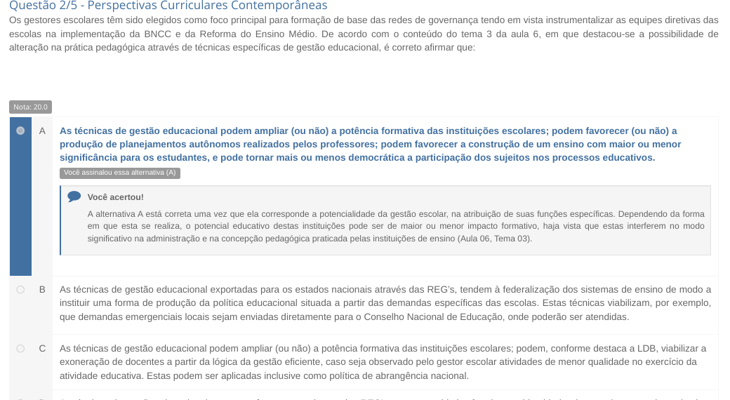 Questão 2/5 - Perspectivas Curriculares Os gestores escolares têm sido elegidos como foco principal para formação de base das redes de governança tendo em vista instrumentalizar as equipes diretivas das escolas na implementação da BNCC e da Reforma do Ensino Médio. De acordo com conteúdo do tema 3 da aula 6, em que destacou-se a possibilidade de alteração na prática pedagógica através de técnicas específicas de gestão educacional, é correto afirmar que: Nota: 20.0 A As técnicas de gestão educacional podem ampliar (ou não) a potência formativa das instituições escolares; podem favorecer (ou não) a produção de planejamentos autônomos realizados pelos professores; podem favorecer a construção de um ensino com maior ou menor significância para os estudantes, e pode tornar mais ou menos democratica a participação dos sujeitos nos processos educativos. Você assinalou essa alternativa (A) Você acertou! A alternativa A está correta uma vez que ela corresponde a potencialidade da gestão escolar, na atribuição de suas funções específicas. Dependendo da forma em que esta se realiza, potencial educativo destas instituições pode ser de maior ou menor impacto formativo, haja vista que estas interferem no modo significativo na administração e na concepção pedagógica praticada pelas instituições de ensino (Aula 06, Tema 03). B As técnicas de gestão educacional exportadas para os estados nacionais através das REG's, tendem à federalização dos sistemas de ensino de modo a instituir uma forma de produção da política educacional situada a partir das demandas específicas das Estas técnicas viabilizam, por exemplo, que demandas emergenciais locais sejam enviadas diretamente para Conselho Nacional de onde poderão ser As técnicas de gestão educacional podem ampliar (ou não) a potência formativa das instituições podem, conforme destaca a LDB, viabilizar a exoneração de docentes a partir da lógica da gestão eficiente, caso seja observado pelo gestor escolar atividades de menor qualidade no exercício da atividade educativa. Estas podem ser aplicadas inclusive como política de abrangência