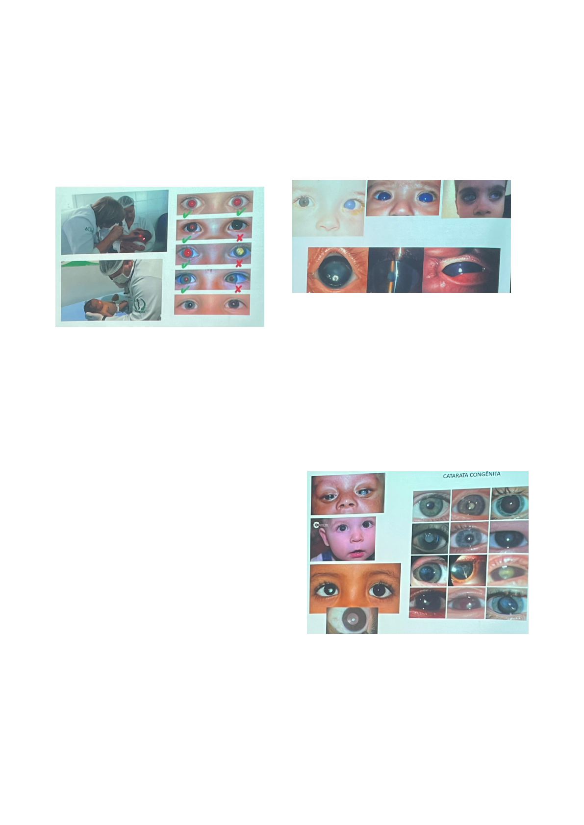 MEDICINA CEUMA Maria Alessandra M11 Oftalmologia na infancia Teste do olhinho - Teste do reflexo vermelho (TRV) - 60 cm a 1 m - Com oftalmoscópio tentar ver o reflexo vermelho - (Ideal é q esteja dilatado porem nem sempre tem disponibilidade. *da pra fazer sem*) Oq eu quero: reflexo do sangue no fundo “nada obstruindo” Alteração: qualquer dificuldade da luz entrar no olho: pode ser córnea, retina, A partir do reflexo alterado se busca a causa. Sempre melhor pecar pelo excesso, n conseguiu ver? Investigar melhor/encaminhar pro oftalmo QUANDO? Recém nascido: nas primeiras 72h ou antes da alta TRV deve ser repetido pelo pediatra durante a puericultura pelo menos 3x ao ano nos primeiros 3 anos de vida. OQ ELE ME AJUDA IDENTIFICAR? -Glaucoma congênito Edemaciado a córnea, esbranquiçado Tratamento é cirúrgico, pode evoluir PRINCIPAL ACHADO: -Catarata congênita N sabe a causa, se n tratar o olho n desenvolve a visão *o olho nasce pronto pra evoluir a visão* Operar o mais rápido possível pra liberar a passagem de luz no olho e a visão evoluir *Precisa estimular o olho MEDICINA CEUMA Maria Alessandra M11 -Retinoblastoma Quando mais cedo o estagio maiores as chances do tratamento e as vezes manter o olho. Retirar o olho se necessário -Retinopatia da prematuridade Prematuros Deficiência nos vascularização da retina; O ideal é fazer mapeamento de retina; doença onde os vasos da retina começam a crescer do nervos ótico pra retina Dificl tratar pela dificuldade da mãe entender -FERV- família exudative vitreoretinopathy Crianças a termo e investigar histórico familiar Vitreorretinopatia Exsudativa familiar Problema na vascularização também *TESTE DO OLHINHO NÃO DÁ DIAGNOSTICO MEDICINA CEUMA Maria Alessandra M11 - TESTE DE HIRSCHBERG Estrabismo Identificar Estrabismo Bom pra fazer na criança pois n precisa colaborar Coloca fonte de luz Oq quer encontrar? Reflexo de luz no centro Tem desvio? Possível estrabismo Se sim, investigar oq causa do desvio.