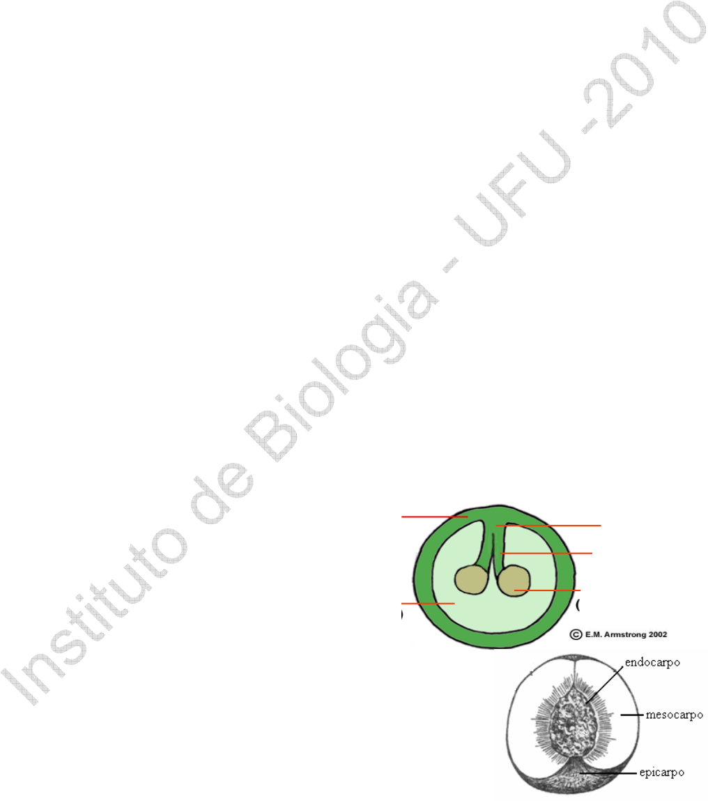 Pericarpo (parede do ovário) Cavidade interna Placenta Funículo Semente (óvulo fecundado) FRUTO 1. INTRODUÇÃO A grande diversidade na organização das flores das Angiospermas, especialmente a variação no número, arranjo, grau de fusão e estrutura dos pistilos que formam o gineceu, propicia uma ampla gama de variação no tamanho, forma, textura e anatomia dos frutos. Segundo a definição clássica, fruto é o ovário desenvolvido, contendo as sementes maduras. No entanto, pode ser formado por um ou mais ovários desenvolvidos, aos quais ainda podem se associar outras estruturas acessórias. O fruto é uma estrutura exclusiva das Angiospermas e biologicamente é um envoltório protetor da semente (ou sementes), assegurando a propagação e perpetuação das espécies. Após a polinização e posterior fecundação da oosfera, ocorre um brusco aumento no conteúdo da auxina no ovário (hormônio do crescimento) que estimula o crescimento de suas paredes, dando origem ao pericarpo. Em alguns casos, ocorre também o crescimento de tecidos associados ao receptáculo. Além disso, iniciam-se uma série de transformações no saco embrionário e outros tecidos do óvulo que levam à formação da semente. Quando o fruto amadurece, as demais estruturas florais (cálice, corola e androceu) podem continuar presentes (geralmente, secos) secos ou cair; o pedicelo da flor torna-se mais resistente para suportar o peso do fruto. Durante esse processo de amadurecimento, os frutos de muitas espécies adquirem cores chamativas e aromas agradáveis, ou se tornam suculentos, sendo seu sabor apreciado por animais que, ao se alimentarem deles, espalham suas sementes a certa distância da planta produtora. Outros, ao contrário, tornam-se secos e sua abertura, às vezes explosiva, permite a liberação das sementes que podem ser lançadas a distâncias relativamente grandes. Certos frutos apresentam características morfológicas que os torna elementos ativos na disseminação de sementes. Geralmente, o desenvolvimento do fruto depende da polinização e da fecundação, bem como, da ação de certos fitormônios; entretanto alguns frutos como a banana (Musa paradisiaca - Musaceae) e o abacaxi (Ananas comosus – Bromeliaceae), formam-se sem a fecundação prévia, tratando-se de frutos partenocárpicos. 2. PARTES DO FRUTO O fruto é constituído por duas partes fundamentais: o fruto propriamente dito, ou pericarpo (originado da parede do ovário) e a semente (originada do óvulo fecundado). Geralmente podemos distinguir três camadas no pericarpo: . Epicarpo, derivado da epiderme externa da parede do ovário, é a camada que reveste o fruto externamente; . Mesocarpo, derivado do mesofilo do ovário, geralmente, é a parte mais desenvolvida nos frutos carnosos (geralmente é a porção comestível) e . Endocarpo, derivado da epiderme interna da parede do ovário, é a camada que reveste a cavidade do fruto, sendo geralmente pouco Figura 1. Partes do fruto. desenvolvida e, muitas vezes, de difícil separação (Fig. 1). Apesar de sua grande diversidade, os frutos são altamente constantes na sua estrutura e, portanto, são importantes na classificação de gêneros e famílias das Angiospermas. 3. CLASSIFICAÇÃO DOS FRUTOS: A classificação dos frutos, geralmente é feita levando-se em consideração três parâmetros: a) o número de ovários envolvidos na sua formação; b) a natureza do pericarpo maduro e c) a deiscência ou indeiscência do pericarpo (modo de deiscência, número de lóculos e sementes formadas). A diferenciação morfológica fundamental é feita de acordo com a origem do fruto, que assim são classificados em: FRUTOS SIMPLES - são aqueles derivados de um único ovário (súpero ou ínfero) de uma única flor. Podem ser secos ou carnosos, uni a multicarpelares, mas neste caso sincárpicos, deiscentes ou indeiscentes na maturidade. Exemplos: cereja (Prunus avium - Rosaceae) e tomate (Lycopersicum sp. - Solanaceae). Figura 2. Desenvolvimento de um Fruto Simples. FRUTOS AGREGADOS - São derivados dos vários ovários de um gineceu dialicarpelar (apocárpico) de uma só flor. Nos frutos agregados os frutículos podem estar unidos diretamente por suas paredes, ou indiretamente pelo tecido do receptáculo. Cada pistilo forma um fruto separado, geralmente do tipo folículo. Em geral, são também denominados frutos apocárpicos. No morango (Fragaria vesca), os vários ovários maduros da flor estão reunidos em um receptáculo carnoso comestível. A fruta-do-conde (Annona squamosa) e a magnólia (Magnolia sp. - Magnoliaceae), são outros exemplos de frutos agregados. A B C Figura 3. Magnólia sp – A – Flor (observe os carpelos acima dos estames); B – Fruto verde; C – Frutos maduros, já deiscentes com as sementinhas expostas. FRUTOS MÚLTIPLOS - Consistem em vários ovários amadurecidos, de muitas flores de uma inflorescência, que concrescem (fundem), mais ou menos, juntos formando uma unidade, denominada infrutescência ou fruto múltiplo (Fig. 4). Um exemplo bem conhecido é o abacaxi (Ananas comosus - Bromeliaceae), que é formado por uma quantidade de bagas partenocárpicas, acrescidas das brácteas suculentas e do eixo da inflorescência. Outro exemplo comum é o figo, que na verdade é um receptáculo desenvolvido e suculento. As flores são muito pequenas e presas à parede interna do receptáculo. Os figos comestíveis também são partenocárpicos, isto é, desenvolvem-se sem que haja fecundação. A B Figura 4. Amora - Morus nigra: A – Numerosas flores femininas (cada uma com um pistilo monocarpelar); B – Fruto múltiplo, cada frutículo uma drupa resultante da fecundação de uma das flores pistiladas da inflorescência. OBSERVAÇÃO: Os frutos agregados e múltiplos são na realidade, conjuntos de frutos simples, e cada frutículo do conjunto pode ainda ser classificado de acordo com as suas características específicas. 3.1 FRUTOS SIMPLES Os principais ti