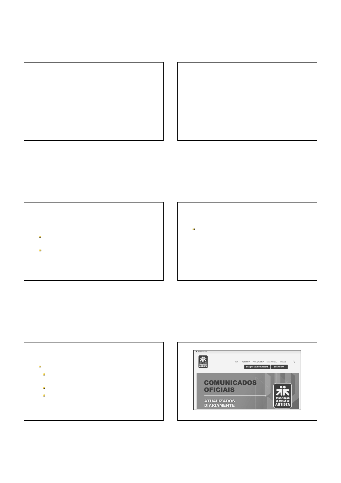 Profª Rossana Ghilardi Transtorno do Espectro Autista Aula 6 Relações familiares e TEA Família identifica de forma progressiva, dolorosa – não desenvolve como esperado Dificuldade de interação social, agressividade – impacto na família – isolamento Família: diagnóstico e prognóstico "Nessa perspectiva, o surgimento de uma condição crônica e o seu manejo no seio das interações familiares são um desafio, o que pode determinar o enfraquecimento dos laços familiares e de sua estrutura" (Mapelli et al., 2018, p. 2) Diagnóstico Medicamento / Insegurança / Redefinição da dinâmica familiar Forma de comunicar – diferentes reações Assistência aos familiares negligenciada AMA - https://www.ama.org.br/site/ Diagnóstico Familiares ativos nas intervenções – aspectos desenvolvimentais, autocuidado etc. Normalmente mãe sobrecarregada Separação Renda familiar reduzida Irmãos com atenção reduzida Tensão na família Relação familiares – escola Auxiliar os familiares a perceber atitudes não produtivas Via de mão dupla – receber informações dos familiares / repassar informações do que acontece na escola Continuidade nos procedimentos Importante para os filhos – outro espaço de convívio Alguns identificam avanços no desenvolvimento Valoriza até mesmo a possibilidade da matrícula escolar Como familiares percebem a escola Atividades remotas e TEA Lynshinoda/Shutterstock Pandemia – evidenciou atividade remota – escolar e terapêutica Aulas on-line emergenciais – dificuldade para alunos típicos, ainda mais para Educação Especial Familiares de alunos com TEA – ainda mais sobrecarregados Familiares – organizando as rotinas visuais em casa para as tarefas "As modificações na rotina devem ser antecipadas e demonstradas visualmente através do quadro de rotina, com a retirada ou colocação da figura representativa da tarefa e sua substituição por outra, podendo o processo ser realizado pela própria criança com ajuda dos pais" (Araripe et al., 2019, p. 3) Recomendações (Araripe et al., 2019) Arranjos ambientais para otimizar procedimentos "A organização do ambiente pode atuar favorecendo ou desfavorecendo sua realização e a própria aprendizagem“ (Araripe et al., 2019, p. 4) Recomendações (Araripe et al., 2019) Acompanhamento remoto dos pais para implementar os novos arranjos "avaliar habilidades, conduzir treino de pais, dispensar reforçadores e organizá-los, usar rotinas visuais e modelar respostas na criança" (Araripe et al., 2019, p. 6) Recomendações (Araripe et al., 2019) Tecnologias digitais O recurso deve ser central na intervenção e servir a pessoa com autismo “Nos repositórios da Googe Play e Apple Store encontrou-se cerca de 200 apps relacionados com os descritores `autismo’, ‘TEA’, ‘Educação de Autistas’” (Capuzzo et al., [S.d.], p. 154) Tecnologias educacionais Jogo desenvolvido para crianças com autismo e com outros atrasos no desenvolvimento, com capacidade cognitiva de 2 a 8 anos de idade. Cada detalhe do jogo teve o acompanhamento de uma equipe multidisciplinar formada por psicopedagogo, fonoaudiólogo, terapeuta ocupacional, psicólogo e pais de uma criança com autismo, o Biel. O jogo facilitará o aprendizado e interação da criança em seu dia a dia. ABC AUTISMO - Um mundo de atividades coloridas e pedagógicas para realizar e curtir! A diversão para os pequenos começa agora com o jogo ABC Autismo! Utilizando fundamentos da metodologia TEACCH tem como objetivo auxiliar no processo de aprendizagem de crianças autistas por meio de divertidas atividades! ABC Autismo – Demonstração https://www.youtube.com/watch?v=w_-3JLz7Y-s Habilidades socioemocionais Programas para alfabetização Habilidades acadêmicas Autocuidado Redução de comportamentos desafiadores Ganhos para saúde mental Organograma do plano investigativo Fonte: elaborado por Santarosa; Conforto, 2015, com base no Relatório Geral Unesco, 2014. Políticas públicas de inclusão escolar e digital Empoderamento de estudantes com deficiência Práticas de inclusão escolar e social Dispositivos moveis (laptops e computadores) O ciberespaço abarca diferentes ambientes de socialização, com variadas formas de interação entre pessoas, pessoas e máquinas e até entre máquinas, embora sempre criado e frequentado por pessoas, portanto, também é um espaço cultural Programas de robótica – trabalhar e desenvolver habilidades motoras e cognitivas Robôs para interação terapêutica Robótica e TEA Participação dos especialistas em TEA no desenvolvimento dos programas e robôs Preparar ambiente de utilização Diminuir manipulação remota (terapeuta) Atender aos princípios propostos (ABA) Efetividade de resultados – critérios de verificação da habilidade proposta Ajustes no desenvolvimento (Alves et al., 2020) Depois da vida escolar Segundo Lacerda (2020), há equivoco em entender a quantidade de matrículas como parâmetro para comprovar efetividade do atendimento e bons resultados da inclusão escolar Trajetória escolar – aluno autista Atibaia-SP Tipos de trajetórias Número Porcentagem (%) Trajetória completa 6 6,38% Trajetória completa com retenção 1 1,06% Trajetória parcial 24 25,53% Trajetória parcial com retenção 17 18,08% Trajetória incompleta 46 48,93% Total de trajetórias 94 100% Fonte: elaborado com base em Lima; Laplane, 2016, p. 278 Apesar das garantias expressadas em leis, documentos e diretrizes, a participação de alunos com autismo no ambiente escolar ainda é problemática e se encontra distante das metas inclusivas. Os alunos têm acesso a serviços de educação, mas a sua permanência no sistema de ensino é incerta, como atestam as trajetórias traçadas no município, o atendimento educacional especializado é pouco abrangente e a sua progressão para níveis e etapas superiores ainda é muito diferente daquela apresentada pelos demais alunos (Lima; Laplane, 2016, p. 28
