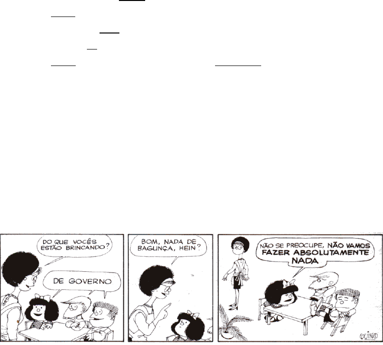 AVALIAÇÃO II – SEMÂNTICA PROF. VANESSA FABÍOLA SILVA DE FARIA Esta avaliação incide sobre os conteúdos dos módulos III e IV QUESTÃO 01 Qual dos termos grifados abaixo NÃO pode ser considerado um quantificador: a) ( ) Nem tudo são flores. b) ( ) Toda a água do rio secou. c) ( ) Encontrei uma chave perdida na rua. d) ( ) O João só convidou a Maria para ir ao cinema. e) ( ) Tudo o que eu mais queria agora é um pouco de café. QUESTÃO 02 Como é entendida a negação para a Semântica da Enunciação: a) ( ) Como um operador que frequentemente causa ambiguidade. b) ( ) Como um advérbio modificador de um substantivo. c) ( ) Como um fenômeno de polissemia. d) ( ) Como um item de escopo amplo. e) ( ) Como um operador argumentativo. QUESTÃO 03 – Leia a tira abaixo e responda: Estão corretas as afirmativas, EXCETO: a) O humor se instaura no jogo entre informação posta e pressuposta. b) Há uma pressuposição de que governos não fazem absolutamente nada. c) As mães se preocupam com a bagunça que as crianças e os governos fazem. d) O conteúdo posto é de que elas, as crianças, estavam brincando de governo. e) O conteúdo pressuposto é o seguinte: se as crianças estavam brincando de governo e governos não fazem nada, então não haveria bagunça; pois também, assim como o governo, nada farão. QUESTÃO 04 No famoso provérbio “O sol nasce para todos”, temos um exemplo de: a) Metaftonímia b) Acarretamento c) Polissemia d) Metáfora e) Metonímia QUESTÃO 05 (FUVEST 2002 -1ª fase). Considere o anúncio abaixo: Reflorestar as margens dos rios Pinheiros e Tietê, arborizar praças, ruas e escolas, criar novos parques, melhorar a qualidade do ar e da vida das pessoas, aumentar a consciência ecológica dos adultos e das futuras gerações. (...) Logo, logo você vai ver o Pomar em cada canto da cidade. Projeto Pomar. Concreto aqui, só os resultados (adaptado de IstoÉ, 19/9/2001). Considerando-se o contexto deste anúncio, o tipo de efeito de sentido que ocorre na expressão “deixa no ar” também se verifica em: a) Reflorestar as margens dos rios Pinheiros e Tietê. b) Melhorar a qualidade do ar. c) Consciência ecológica dos adultos e das futuras gerações. d) Em cada canto da cidade. e) Concreto aqui, só os resultados QUESTÃO 06 - Leia os textos e responda: Em 1978 descobriu-se que, a 150 km da cidade de São Paulo, num lugarejo chamado Cafundó, vivia um grupo de 80 negros que usavam uma estranha língua. Linguistas e antropólogos pesquisaram a comunidade e descobriram que eles eram descendentes de escravos falantes de uma língua banto, uma das muitas famílias linguísticas da África. Tanto os adultos quanto as crianças do Cafundó eram falantes do português, mas, em algumas situações, todos preferiam usar a cupópia, uma língua formada por apenas 150 palavras: tudo o que restou da língua original na memória dos mais velhos integrantes da comunidade. Para poder se expressar nessa língua de tão poucas palavras, os negros do Cafundó tiveram que inventar um modo de dizer, em cupópia, as coisas para as quais não havia palavras. Criaram assim várias figuras de linguagem, utilizando, principalmente, dois processos básicos para construí-las: relacionando palavras por semelhança e por proximidade. (Cassiano Machado. In Folha de S. Paulo, 18/10/96.) Em cupópia, não havia uma palavra para designar sabonete; os moradores do Cafundó criaram então a expressão obiquanga do vavá que significa, literalmente, "tijolo de água". (Ana Luisa Marcondes. In: Olhe a Língua, 2004) Apesar do léxico extremamente limitado, o sistema do Cafundó é vivo e produtivo. Do ponto de vista estritamente lexical, observa-se de fato uma constante expansão do vocabulário (...). Essa expansão se dá em geral através do uso de palavras do léxico africano, que concorrem para a formação de novas expressões cuja estrutura gramatical é, grosso modo, a de nome + preposição + nome. Para expressar um novo significado, parte-se de um nome e particulariza- se, através do genitivo português, gramaticalmente falando, um novo significado. (Carlos Vogt e Peter Fry. In: As formas de expressão na “língua” africana do Cafundó.) Os mecanismos apontados nos textos acima permitem a construção dos seguintes vocábulos em cupópia: 1. tenhora da mucanda = enxada da escrita (caneta) 2. mutombo do injequê = mandioca do saco (amendoim) 3. injó da marrupa = casa do sono (quarto) 4. ngombe do andaru = boi de fogo (carro) 5. injequê do vava = saco de água (nuvem) 6. obiquanga do avero = tijolo de leite (queijo) 7. obiquanga do vava = tijolo de água (sabonete) Pode-se dizer que as palavras em cupópia se formam por meio de: I) Acarretamento e pressuposição II) Inferência e Polissemia III) Metáfora e Metonímia Estão corretas: a) Apenas I está correta. b) Apenas II está correta. c) Apenas III está correta. d) Nenhuma alternativa está correta. e) Todas as alternativas estão corretas. QUESTÃO 07 Lakoff fala em metáforas orientacionais, que organizam todo um sistema de conceitos a partir de orientações espaciais do tipo "para cima/para baixo", "frente/trás", "dentro/fora", entre outros casos. Essas orientações são também consequentes da estrutura do nosso corpo e sua atuação no mundo físico. São exemplos desse fenômeno as frases que contêm metáforas do tipo: FELIZ É PARA CIMA; TRISTE É PARA BAIXO São exemplos desta ideia as frases abaixo, EXCETO: a) Ele é um cara para cima. b) Ele tem estado pra baixo esses últimos dias. c) Pensar em dinheiro levanta o meu astral. d) Empurre a alavanca para baixo a fim de abrir o compartimento de cargas. e) Velórios são tão tristes que até a pessoa mais feliz sai de lá meio para baixo. QUESTÃO 08 Baseando-se na mesma orientação, encontramos as informações abaixo, associadas aos termos "frente" e "trás", que também exemplificam a noção anterior, EXCETO: a) “São 120 milhões em ação, pr