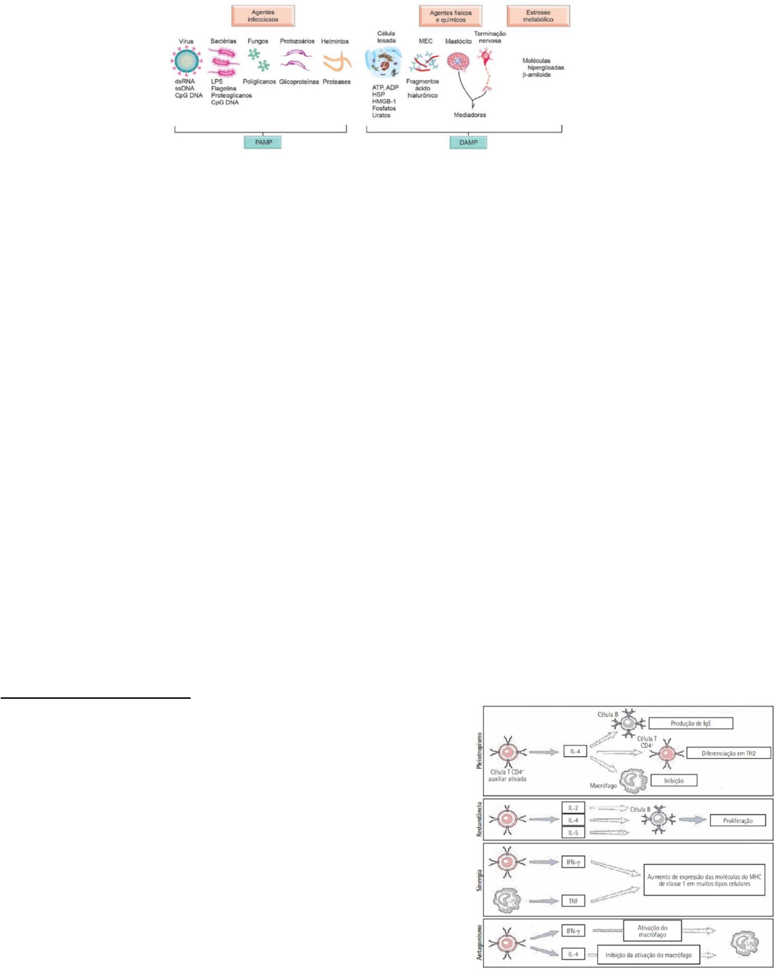 Mediadores inflamatórios - aula 2 Substâncias associadas a agentes patológicos (vírus bactérias) que produzem os PAMPs Se não tiver infecção pode haver inflação também mas precisa de um agente químico causando dano a célula e a própria libera os DAMPs Mediadores inflamatórios · São produzidos por diversas células nos locais de inflamação · Ou são gerados a partir de precursores circulantes inativos (eles precisam funcionar no local e na hora certa, então vão ser gerados na forma inativa e vão se ativar no momento certo) · Comandam o processo e estão envolvidas no início, na evolução e no término de uma inflamação · Mediadores pró-inflamatórios atuam na indução da resposta (estimulam a inflamação) · Mediadores anti-inflamatórios ou pró-resolução participam na sua inibição e resolução (buscam resolver a inflamação) obs: enquanto está ocorrendo estímulo para o processo inflamatório, está ocorrendo também estímulo para equilibrar essa inflamação (estímulos pró inflamatórios e anti inflamatórios ocorrem juntos) só o fato de ativarmos o processo de coagulação, por exemplo, já temos a geração de mediadores inflamatórios O conhecimento dos mediadores inflamatórios é importante sobretudo pelo fato de que muitos são alvos de medicamentos anti-inflamatórios usados para controlar inflamações diversas Sistema completo · proteínas que se ativam, causando uma cascata de reações quando temos um trauma, ativamos os mastócitos, que liberam histamina e serotonina (esses são mediadores inflamatórios) Citocinas · São sintetizadas por diferentes células (linfócitos, macrófagos, endotélio...) · citocinas são proteínas (produzidas pelas células) que regulam a resposta imunitária, tanto inata como adaptativa Característica gerais das citocinas · elas podem ser produzidas por qualquer célula em resposta a uma agressão, fazendo parte da resposta inata e imediata a agressões · elas são produzidas rapidamente, secretadas em um período curto e depois degradadas (elas duram pouco) · são secretadas por um período curto e em quantidade limitada · há grande redundância em suas fontes e em seus efeitos: uma mesma citocina pode ser produzida por células distintas, tendo citocinas diferentes o mesmo efeito · muitas têm efeito pleiotrópico, ou seja, efeitos diversos em células diferentes (pleiotropia = mesma citocina, que apresenta efeitos diferentes dependendo das células que ela está interagindo) · muitas vezes uma citocina influencia a síntese de outra, inibindo-a ou estimulando-a · podem ter ação sinérgica (trabalhando em conjunto, elas não são redundantes, seus efeitos se completam / são somados) ou antagônica (a célula produz citocinas diferentes, onde uma tem efeito contrário a outra) · todas as citocinas agem atuando em receptores celulares, podendo um mesmo receptor ligar-se a citocinas diferentes · seus efeitos manifestam-se geralmente após indução gênica, com síntese de mRNA (efeitos não imediatos) após ligação com o receptor citocinas pró-inflamatórias: · mais universais na resposta inata = IL-1, TNF / fator de necrose tumoral, IL-6 e IL-18 · mais envolvidas na resposta adaptativa = IL-17 e IFN-γ citocinas anti-inflamatórias: · ex: IL-10, TGF-β e IL-4 obs: as respostas inflamatórias são feitas principalmente pelas citocinas Quimiocinas Quimiocinas (chemokines, contração de chemotactic cytokines) são peptídeos de baixo peso molecular (8-10kD) que orientam a movimentação de células que possuem receptores para elas · são menores que as citocinas (também são proteínas, mas menores) exudato celular = extravasamento de leucócito do vaso sanguíneo para o sítio inflamatório (são as quimiocinas que mostram para onde a célula tem que ir depois de sair do vaso sanguíneo) De modo geral, as quimiocinas servem para orientar as células (seja em processo patológico ou não) As quimiocinas possuem resíduos de cisteína na extremidade N, cujo espaçamento as divide em quatro grupos: · grupo 1: quimiocinas CXC alfa (α), que são duas cisteínas separadas por um aminoácido qualquer · grupo 2: quimiocinas CC beta (β), com duas cisteínas contíguas / sem nada entre elas · grupo 3: quimiocinas C gama (γ) com uma cisteína · grupo 4: quimiocinas C3XC delta (δ), com duas cisteínas separadas por três outros aminoácidos Tem quimiocinas que podem ser induzíveis (inflamatórias) ou constitutivas (homeostáticas) Quimiocinas induzíveis: · regulam o tráfego, a ativação e a diferenciação de leucócitos em inflamações (ocorre em processo inflamatório / patológico) Quimiocinas homeostáticas: · são responsáveis pela migração e topografia de células linfoides nos órgãos imunitários (são produzidas independentemente de processo inflamatório) As quimiocinas atuam não só em leucócitos, mas atuam também na embriogênese (migração e diferenciação de células), na carcinogênese (quimiotaxia e diferenciação de células cancerosas) e na angiogênese (regulação) · ou seja, estamos produzindo quimiocinas o tempo todo, tendo inflamação ou não (elas ajudam tanto na inflamação como em processos fisiológicos) as quimiocinas podem encaixar em vários receptores diferentes (e várias quimiocinas / grupos de quimiocinas podem se ligar a um mesmo receptor) Mediadores lipídicos Principais fontes de mediadores lipídicos: · fosfolipídeos e esfingomielina da membrana citoplasmática · As enzimas-chave para a síntese desses mediadores: - são fosfolipases e esfingomielinases, situadas na membrana citoplasmática ou seja, a principal fonte de mediadores lipídicos é a membrana plasmática (os fosfolipídeos e esfingomielina que estão na membrana vão formar os mediadores lipídicos para formar o ácido araquidonico) Por ação de fosfolipases (A e B), os fosfolipídios da membrana liberam ácido araquidônico na membrana plástica, que vai o