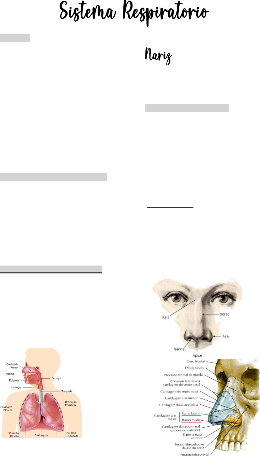 VITÓRIA KAORI OGASSAWARA TXXVII FUNÇÕES -Constribuir para a homeostasia do corpo (processos catabólicos e anabólicos devem estar equilibrados) -Favorecer as trocas gasosas (Co2 deve ser eliminado e O2 absorvido- relacionado com o sist.circulatório) -Ajuste do pH dos líquidos corporais -Liberação de pequenas quantidades de água e calor -Contém receptores para a sensação do olfato -Filtra o ar inspirado > aquecer -Produz sons vocais – fonação (laringe- caixa de voz) HEMATOSE: troca gasosa- acontece no alvéolo ANATOMIA- DIVISÃO ESTRUTURAL -Trato Respiratório Superior: nariz ou cavidade nasal, seios paranasais e faringe + laringe acima das cordas vocais e glote -Trato Respiratório Inferior: laringe abaixo das cordas vocais, traqueia, brônquios, bronquíolos e pulmão MACETE: F de faringe vem antes do L de laringe ANATOMIA- DIVISÃO FUNCIONAL -Vias Aéreas Superiores (condutoras): nariz ou cavidade nasal, faringe, laringe, traqueia, brônquios e bronquíolos gerais > função de filtrar, umedecer e aquecer o ar e conduzi-los aos pulmões -Vias Aéreas Inferiores (respiratória): bronquíolo terminal, alvéolos e pulmão > onde ocorre a hematose -Protuberância situada no centro da face. Dividido em externa e interna PARTE EXTERNA DO NARIZ -Forma de pirâmide triangular de base inferior e cuha a face posterior se ajusta verticalmente no 1/3 médio da face -As faces laterais do nariz – saliência semilunar = asa do nariz Constitui-se de: -Narina > orifício -Sustentação ósseo: frontal, nasais e maxila -Cartilagem hialina flexível (5): cart. do septo nasal, processos laterais da cart. Nasal e cart. alares (maior e menor) -Recoberto por músculo e pele -Vestíbulo: cavidade dentro da narina -Vibrissas: pelos -Columela (não cartilagínea): entre os orifícios VITÓRIA KAORI OGASSAWARA TXXVII PARTE INTERNA DO NARIZ -Aquecimento, umedecimento e filtração do ar -Detecção dos estímulos olfatórios – odor -Modificação das vibrações da fala, à medida que passam pelas grandes câmaras ocas de ressonância (ex: faringe) > porém quem produz som é a laringe -Cavidade nasal: espaço dentro da parte interna do nariz > nome dado a parte interna do nariz CAVIDADE NASAL–SEPTO NASAL -Divide a cavidade nasal em lado direito e esquerdo -Cartilagem septal > hialina (parte anterior) -Parte óssea: vômer, lâmina cribiforme do etmoide, maxila e palatino -Posteriormente a cav. Nasal se comunica com a faringe por meio dos coanos CAVIDADE NASAL–SEIOS PARANASAIS -Cavidades nos ossos pneumáticos, servem para drenar o muco produzido, lágrima, temos 4 na região o nariz -Seio frontal, etmoidal, esfenoidal e maxilar -Sinusite: inflamação nesses seios paranasais CAVIDADE NASAL–PAREDE LATERAL -São formadas pelos ossos etmóide, maxila, lacrimal, palatino e concha nasal inferior -Teto: formado pelo osso etmóide -Assoalho: os palatinos e os processos palatinos da maxila (que juntos formam o palato duro) -Composta por conchas nasais: superior, média e inferior -Sulcos abaixo das conchas: meato nasais sup, médio e inf -Áres de kiesselback: região altamente vascularizada, propensa a sangramento, traumas, rinite > área comum de epistaxe= sangramento nasal -Concha nasal inferior: único osso próprio, os outros são projeções do etmóide EPITÉLIO OLFATÓRIO -Na membrana que reveste as conchas nasais superiores e septo adjacente > onde estão presentes os receptores olfatórios -Epitélio pseudoestratificado colunar ciliado -Células ciliadas e caliciformes > transporte e produção de muco -Tubo muscular fino -Faz parte do sist. digestório também -Começa nos coanas e se estede até a cartilagem cricóidea -É posterior as cavidades nasal e oral -Dividida em 3 regiões anatômicas: nasofaringe, orofaringe e laringofaringe VITÓRIA KAORI OGASSAWARA TXXVII Funções: -Passagem de ar e alimento – deglutição -Fornece uma câmara de ressonância p/ sons da fala -Aloja as tonsilas (amídalas) > fazem parte sist. Linfático > primeira linha de defesa do nosso corpo > frequentemente removidas NASOFARINGE -Porção superior da faringe -Comunicações: • Coanos > transição entre o término da cavidade nasal e farige • Óstio faríngeo da tuba auditiva • Orofaringe -Posterior a cavidade nasal até o palato mole > dos coanos até o palato mole -Passa somente ar, além de ter trocas pequenas de ar com a tuba auditiva -Movimenta o muco para baixo OROFARINGE -Porção intermediária da faringe -Comunicações: • Boca – fauces (abertura onde termina a cavidade bucal) • Nasofaringe • Laringofaringe -Posterior a cavidade oral e estende-se do palato mole até o nível do osso hioide -Serve para passagem de ar e bolo alimentar LARINGOFARINGE -Porção inferior da faringe -Comunicações: • Orofaringe • Esôfago -Serve para passagem de ar e alimento também -Começa na altura do osso hioide e se estende até o esôfago, terminando na cartilagem cricóidea Coanos VITÓRIA KAORI OGASSAWARA TXXVII MÚSCULOS DA FARINGE -2 grupos de músculos: 6 músculos CONSTRITORES -Camada muscular circular externa -Faz contração para empurrar o bolo alimentar, auxilia no peristaltismo -M. constritor superior, médio e inferior da faringe LONGITUDINAIS -Camada muscular circular interna -Elevação durante a deglutiçã e fala -Palatofaríngeo, estilofaríngeo e salpinofaríngeo -Órgão curto > 5cm > da epiglote até a cartilagem cricóidea -Conecta a faringe com a traqueia -Linha mediana do pescoço -Anterior ao esôfago e c4 a c6 -Estrutura triangular (gogó), esqueleto cartilaginoso envolvido por músculos e ligamentos -Ádito da laringe: entrada -Funções: atua como passagem para o ar durante a respiração, produz som e impede que o alimento e objetos estranhos entrem nas estruturas respiratórias -Possui 9 peças de cartilagem Pares: corniculada, aritenóidea e cuneiforme Ímpares: epiglote, tireóidea e cricóidea CARTILAGEM TIREÓIDEA -Maior das cartilagens, formada por 2 l