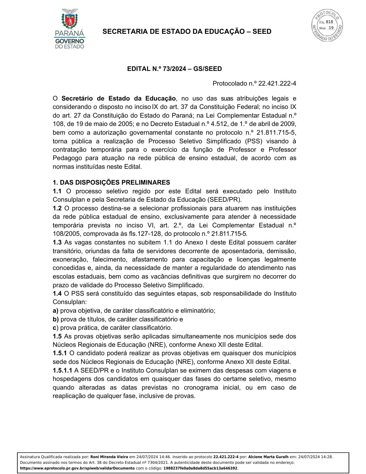 SECRETARIA DE ESTADO DA EDUCAÇÃO – SEED EDITAL N.º 73/2024 – GS/SEED Protocolado n.º 22.421.222-4 O Secretário de Estado da Educação, no uso das suas atribuições legais e considerando o disposto no inciso IX do art. 37 da Constituição Federal; no inciso IX do art. 27 da Constituição do Estado do Paraná; na Lei Complementar Estadual n.º 108, de 19 de maio de 2005; e no Decreto Estadual n.º 4.512, de 1.º de abril de 2009, bem como a autorização governamental constante no protocolo n.º 21.811.715-5, torna pública a realização de Processo Seletivo Simplificado (PSS) visando à contratação temporária para o exercício da função de Professor e Professor Pedagogo para atuação na rede pública de ensino estadual, de acordo com as normas instituídas neste Edital. 1. DAS DISPOSIÇÕES PRELIMINARES 1.1 O processo seletivo regido por este Edital será executado pelo Instituto Consulplan e pela Secretaria de Estado da Educação (SEED/PR). 1.2 O processo destina-se a selecionar profissionais para atuarem nas instituições da rede pública estadual de ensino, exclusivamente para atender à necessidade temporária prevista no inciso VI, art. 2.º, da Lei Complementar Estadual n.º 108/2005, comprovada às fls.127-128, do protocolo n.º 21.811.715-5. 1.3 As vagas constantes no subitem 1.1 do Anexo I deste Edital possuem caráter transitório, oriundas da falta de servidores decorrente de aposentadoria, demissão, exoneração, falecimento, afastamento para capacitação e licenças legalmente concedidas e, ainda, da necessidade de manter a regularidade do atendimento nas escolas estaduais, bem como as vacâncias definitivas que surgirem no decorrer do prazo de validade do Processo Seletivo Simplificado. 1.4 O PSS será constituído das seguintes etapas, sob responsabilidade do Instituto Consulplan: a) prova objetiva, de caráter classificatório e eliminatório; b) prova de títulos, de caráter classificatório e c) prova prática, de caráter classificatório. 1.5 As provas objetivas serão aplicadas simultaneamente nos municípios sede dos Núcleos Regionais de Educação (NRE), conforme Anexo XII deste Edital. 1.5.1 O candidato poderá realizar as provas objetivas em quaisquer dos municípios sede dos Núcleos Regionais de Educação (NRE), conforme Anexo XII deste Edital. 1.5.1.1 A SEED/PR e o Instituto Consulplan se eximem das despesas com viagens e hospedagens dos candidatos em quaisquer das fases do certame seletivo, mesmo quando alteradas as datas previstas no cronograma inicial, ou em caso de reaplicação de qualquer fase, inclusive de provas. 818 19 Assinatura Qualificada realizada por: Roni Miranda Vieira em 24/07/2024 14:46. Inserido ao protocolo 22.421.222-4 por: Alcione Marta Guralh em: 24/07/2024 14:28. Documento assinado nos termos do Art. 38 do Decreto Estadual nº 7304/2021. A autenticidade deste documento pode ser validada no endereço: https://www.eprotocolo.pr.gov.br/spiweb/validarDocumento com o código: 1988237fe0a0a8da8d55acb13a646392. SECRETARIA DE ESTADO DA EDUCAÇÃO – SEED 1.5.1.1.1 A SEED/PR e o Instituto Consulplan se eximem das despesas com viagens e hospedagens dos candidatos em quaisquer das fases Convocação e Contratação. 1.6 As contratações temporárias decorrentes do presente processo seletivo observarão o Regime Especial (CRES), regulamentado pela Lei Complementar Estadual n.º 108/2005, e suas alterações, pelo Decreto Estadual n.º 4.512/2009, e legislação correlata. 1.7 Os contratados estarão vinculados ao Regime Geral de Previdência Social, cujas contribuições serão recolhidas somente durante o período trabalhado. 1.8 A seleção dos candidatos no PSS não implica obrigatoriedade de contratação. 1.9 O cronograma do presente Processo Seletivo Simplificado consta no Anexo II. 1.10 As datas e os períodos estabelecidos no cronograma são passíveis de alteração, conforme necessidade e conveniência da Secretaria de Estado da Educação (SEED/PR) e/ou do Instituto Consulplan, previamente comunicada por meio de edital. 1.11 Será admitida a impugnação deste Edital, no período estabelecido no cronograma constante do Anexo II, por meio do menu “Fale Conosco” disponível no site do Instituto Consulplan, www.institutoconsulplan.org.br. 1.12 Os pedidos de impugnação serão julgados pela Secretaria de Estado da Educação (SEED/PR) e/ou Instituto Consulplan. 1.13 O impugnante deverá, necessariamente, indicar o item/subitem que será objeto de impugnação, devidamente fundamentado. 1.14 O Processo Seletivo Simplificado a que se refere este Edital, bem como as contratações dele decorrentes, poderá ser adiado, revogado por razões de interesse público decorrentes de fato superveniente devidamente comprovado, ou anulado, no todo ou em parte, por ilegalidade, de ofício ou por provocação de terceiro, observados os princípios do contraditório e da ampla defesa. 1.15 Em casos de adiamento, revogação ou anulação, nos termos do subitem 1.14, não haverá obrigação de indenizar o candidato, salvo devolução do valor de inscrição, se esta existir, em caso de cancelamento do certame por conveniência da Administração. 2. DAS VAGAS, CARACTERÍSTICAS E ATRIBUIÇÕES DA FUNÇÃO DE PROFESSOR E PROFESSOR PEDAGOGO 2.1 As vagas, as características de cada função, a escolaridade mínima exigida, bem como os vencimentos correspondentes constam no Anexo I do presente Edital e possuem os seguintes requisitos básicos: a) para participar do processo seletivo o candidato deve ser brasileiro nato, naturalizado ou, no caso de nacionalidade portuguesa, estar amparado pelo Estatuto de Igualdade entre Brasileiros e Portugueses, com reconhecimento do gozo dos direitos políticos, nos termos do § 1.º do art. 12 da Constituição Federal; b) o candidato deverá ter no mínimo 18 anos completos no momento da convocação para a comprovação de títulos; 819 19 Assinatura Qualificada realizada por: Roni Miranda V