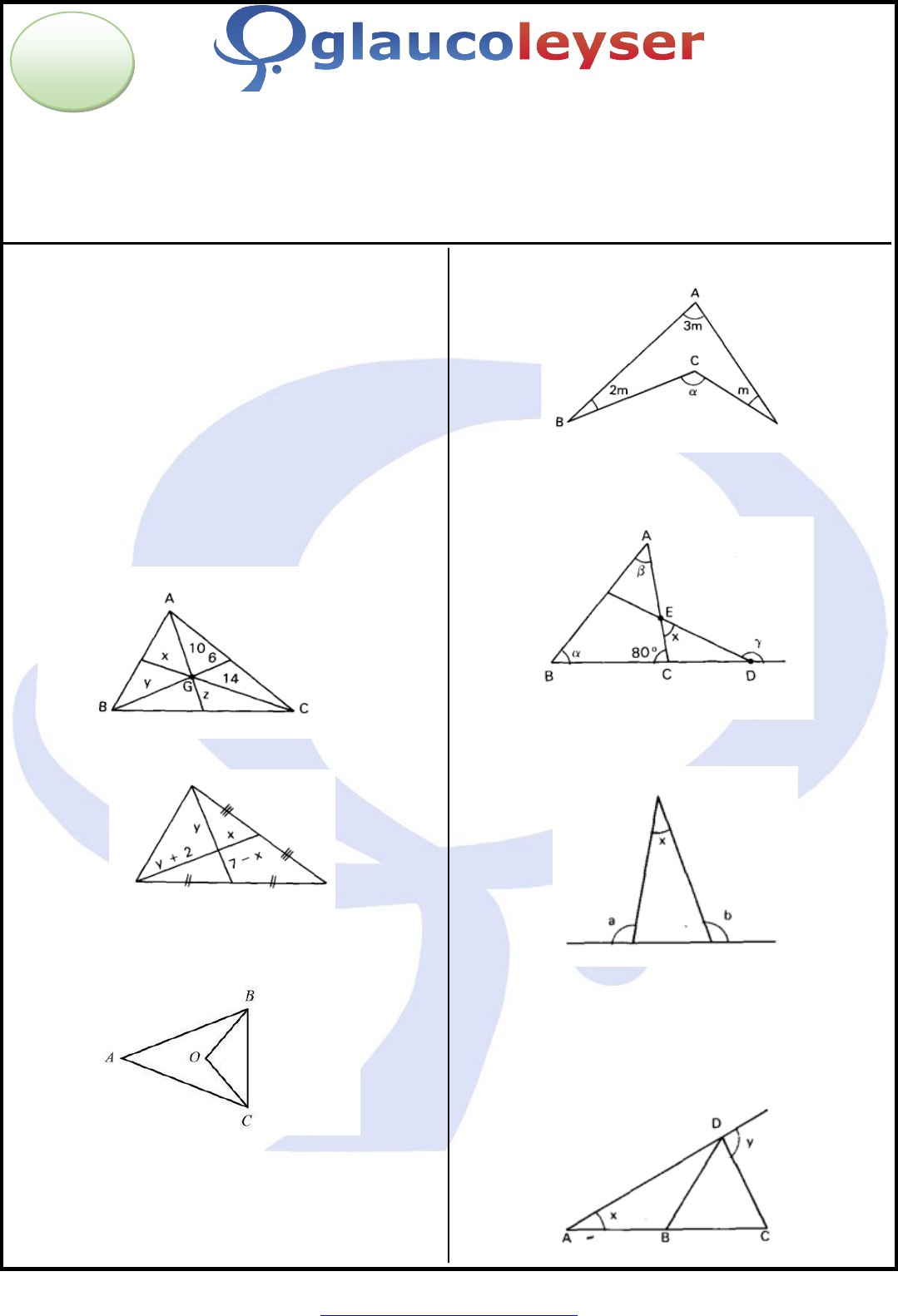 Goiânia, ____ de Janeiro de 2.024 Geometria Plana Aluno(a):_______________________________________________________________________________ Disciplina:• Matemática Professor: • Eliberto Conteúdo• Triângulos “DISCIPLINA, ISSO SEPARA OS BONS DOS MELHORES !!!” http://www.cursosglaucoleyser.com.br - 1 - 12 Lista de Triângulos 01. Classifique em verdadeiro (V) ou falso (F). • Todo triângulo isósceles é equilátero. • Todo triângulo equilátero é isósceles. • Um triângulo obtusângulo pode ser equilátero. • Um triângulo obtusângulo pode ser isósceles. • Existe triângulo retângulo isósceles. 02. (UNITAU) O segmento da perpendicular traçada de um vértice de um triângulo à reta suporte do lado oposto é denominado: a) Mediana. b) Mediatriz. c) Bissetriz. d) Altura. e) Base. 03. Sendo G o baricentro do triângulo ABC, determine x, y e z (considere: AG = 10, BG =y e CG = 14). 04. Considerando congruentes os segmentos com “marcas iguais”, determine os valores das incógnitas nos casos: 05. (Fuvest) Na figura a seguir, AB = AC , O é ponto de encontro das bissetrizes do triângulo ABC, e o ângulo BÔC é o triplo do ângulo Â. Calcule Â. 06. Na figura, determine a medida do ângulo α em função de m. 07. Na figura, calcule o ângulo x, sendo α o triplo de β e ϒ o sêxtuplo de β. 08. (PUC) Na figura a seguir, a = 100o e b = 110o. Quanto mede o ângulo x? a) 30o b) 50o c) 80o d) 100o e) 220o 09. (Fuvest) Na figura, AB = BD = CD. Então: “DISCIPLINA, ISSO SEPARA OS BONS DOS MELHORES !!!” http://www.cursosglaucoleyser.com.br - 2 - a) y = 3x b) y = 2x c) x + y = 180o d) x = y e) 3x = 2y 10. (UCMG) Na figura a seguir, o ângulo ADC é reto. O valor, em graus, do ângulo CBD é de: a) 95 b) 100 c) 105 d) 110 e) 120 11. (PUC) Na figura, BC = CA= AD = DE. O ângulo CAD mede: a) 10o b) 20o c) 30o d) 40o e) 60o Gabarito Gabarito 01: F; V; F; V; V Gabarito 02: letra D Gabarito 03: x = 7, y = 12, z = 5 Gabarito 04: x = 4 e y = 6 Gabarito 05: 36o Gabarito 06: 6m Gabarito 07: x = 50o Gabarito 08: letra A Gabarito 09: letra A Gabarito 10: letra B Gabarito 11: letra B