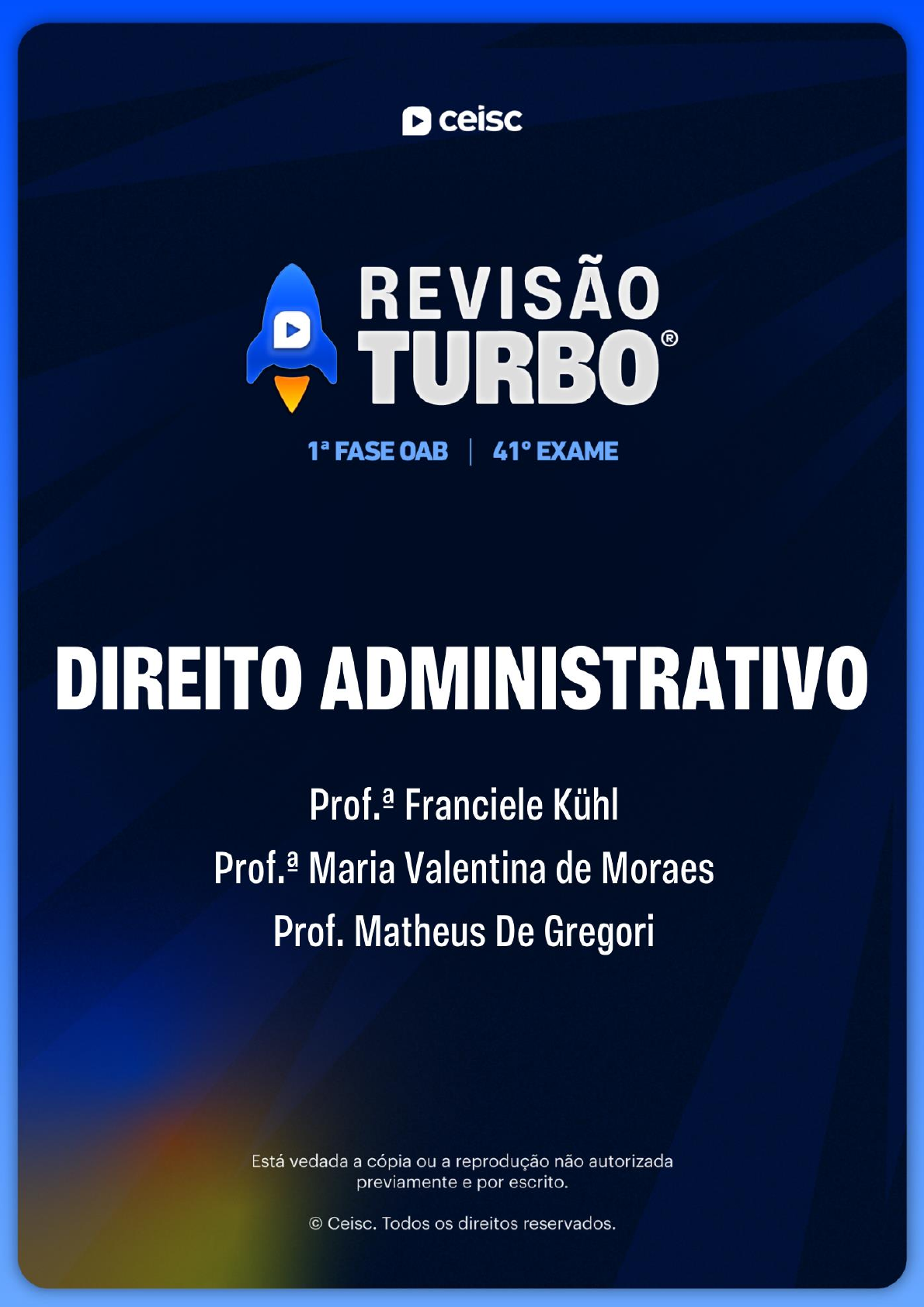Revisão Turbo | 41º Exame de Ordem Direito Administrativo 1 Revisão Turbo | 41º Exame de Ordem Direito Administrativo 2 Revisão Turbo | 41º Exame de Ordem Direito Administrativo 3 Direito Administrativo Revisão Turbo | 41° Exame da OAB Sumário Aula 19/07/2024 – turno noite ...................................................................................................... 4 Aula 22/07/2024 – turno manhã ................................................................................................. 36 Revisão Turbo | 41º Exame de Ordem Direito Administrativo 4 Aula 19/07/2024 – turno noite 1. Organização da administração pública A Administração Pública é o conjunto de órgãos, agentes e entidades, de qualquer dos três poderes, que cumpre a função administrativa. Para isso ela usará de duas técnicas: a desconcentração e a descentralização: O artigo 37, inciso XIX, da Constituição Federal explica como será a criação de cada uma dessas entidades administrativas da administração indireta, ele refere: Revisão Turbo | 41º Exame de Ordem Direito Administrativo 5 somente por lei específica poderá ser criada autarquia e autorizada a instituição de empresa pública, de sociedade de economia mista e de fundação, cabendo à lei complementar, neste último caso, definir as áreas de sua atuação. As subsidiárias das estatais também dependem de autorização legislativa, segundo o inciso sequente. Atenção: como já foi cobrado diversas vezes pela banca, é muito importante o estudo da lei das Estatais, dos consórcios públicos e das principais características das Agências Reguladoras, então vou indicar alguns artigos para leitura de tema de casa: • Lei nº 13.303/2016: artigos 3º, 4º e 5º; • Lei nº 9.986/2000: artigos 4º, 6º, 8º, 8º-A, 8º-B, e 9º; • Lei nº 13.848/2019: artigos 3º, 7º, 8º, 9º e 34 da Lei nº 13.848/19; • Lei nº 11.107/2005: artigos 1º, 2º, 4º, 6º, 8º e 11. Resolva a questão a seguir: 1) FGV – 2022 – OAB – 36º Exame de Ordem Unificado – Primeira Fase A Agência Reguladora federal Alfa, criada no ano corrente, tem a intenção de formalizar um acordo de cooperação com a Agência Reguladora estadual Beta. O acordo visa à descentralização das atividades normativas, fiscalizatórias, sancionatórias e arbitrais, com o intuito de conferir maior eficiência à atuação das duas entidades. Nesse contexto, à luz do disposto na CRFB/88 e na Lei nº 13.848/18, assinale a afirmativa correta. Revisão Turbo | 41º Exame de Ordem Direito Administrativo 6 A) O acordo de cooperação poderia ter por objeto a delegação de competência normativa da Agência Alfa. B) A execução da fiscalização do objeto da delegação pela Agência Beta, por ser estadual, não precisa observar as normas federais pertinentes. C) A execução de competência delegada pelo acordo de cooperação à Agência Beta independe do acompanhamento e da avaliação pela Agência Alfa. D) A Agência Alfa, havendo delegação de competência, permanecerá como instância superior e recursal das decisões tomadas no exercício da competência delegada à Agência Beta. 1.1. Parestatais ou terceiro setor Apesar de não ter um conceito legislativo e delas não estarem na Constituição Federal, podemos encontrar essa expressão “entidade paraestatal” na doutrina, na jurisprudência e nas leis ordinárias e complementares. Para Di Pietro as “paraestatais são definidas como pessoas jurídicas de direito privado, instituídas por particulares, com ou sem autorização legislativa, para o desempenho de atividades privadas de interesse público, mediante fomento e controle do Estado”1. As principais entidades paraestatais e seus instrumentos jurídicos de parceria com o Poder Público, que devemos estudar para prova da OAB, são: 1 DI PIETRO, Maria Sylvia Zanella. Direito administrativo. 33. ed. Rio de Janeiro: Forense: 2020. Revisão Turbo | 41º Exame de Ordem Direito Administrativo 7 2. Responsabilidade civil do Estado 2.1. Teoria do risco administrativo: responsabilidade objetiva 2.2. Teses de repercussão geral que podem inspirar a banca Algumas teses de repercussão geral do STF e jurisprudência importante do STJ que podem ser objeto da prova: Teses de repercussão geral do STF: RE 1209429 É objetiva a Responsabilidade Civil do Estado em relação a profissional da imprensa ferido por agentes policiais durante cobertura jornalística, em manifestações em que haja tumulto ou conflitos entre policiais e manifestantes. Cabe a excludente da responsabilidade da culpa exclusiva da vítima, nas hipóteses em que o profissional de imprensa descumprir ostensiva e clara advertência sobre acesso a áreas delimitadas, em que haja grave risco à sua integridade física. RE 608880 Nos termos do artigo 37, § 6º, da Constituição Federal, não se caracteriza a responsabilidade civil objetiva do Estado por danos decorrentes de crime praticado por pessoa foragida do sistema prisional, quando não demonstrado o nexo causal direto entre o momento da fuga e a conduta praticada. RE 136861 Para que fique caracterizada a responsabilidade civil do Estado por danos decorrentes do comércio de fogos de artifício, é necessário que exista a violação de um dever jurídico específico de agir, que ocorrerá quando for concedida a licença para funcionamento sem as cautelas legais ou quando for de conhecimento do poder público eventuais irregularidades praticadas pelo particular. Revisão Turbo | 41º Exame de Ordem Direito Administrativo 8 Resolva a questão a seguir: 2) FGV – 2023 – OAB – 37º Exame de Ordem Unificado – Primeira Fase Mateus e Geraldo foram presos em decorrência de sentença penal com trânsito em julgado, pelo crime de latrocínio. Ambos ficaram, inicialmente, na mesma cela prisional, em condições absolutamente precárias e insalubres, sendo certo que Geraldo evadiu-se da cadeia. Seis meses após a fug
