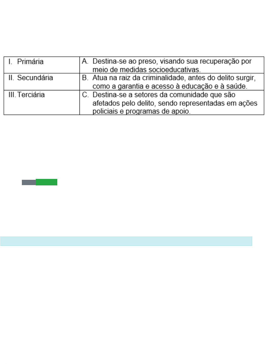 Prova de Política criminal e criminologia Leia e associe as duas colunas. Assinale a alternativa que traz a associação correta entre as duas colunas: Alternativas: · I-B; II-C; III-A. checkCORRETO · I-C; II-A; III-B. · I-A; II-C; III-B. · I-A; II-B; III-C. · I-C; II-B; III-A. Resolução comentada: Entre os modelos de prevenção que podem ser adotados pelo Estado temos três espécies, sendo a primária, que atua antes do aparecimento do delito, servindo como garantia e acesso à educação e saúde; na secundária já existe o delito, porém a atuação é localizada nas regiões e sociedade que ocorrem, contando com a atuação da polícia e implementação de programas; e a terciária, que é a ultima medida de prevenção e ocorre diretamente no delinquente preso, buscando a sua recuperação por meio da adoção de medidas socioeducativas. Código da questão: 51474 2) Qual das alternativas elenca todos os órgãos responsáveis pela Segurança Pública estabelecidos na Constituição da República Federativa do Brasil? Alternativas: · Polícia Federal; Polícia Ferroviária Federal; Polícias Civis; Polícias Militares e Corpos de Bombeiros Militares. · Polícia Federal; Polícia Rodoviária Federal; Polícia Ferroviária Federal; Polícias Civis; Polícias Militares e Corpos de Bombeiros Militares. checkCORRETO · Polícia Federal; Polícias Civis; Polícias Militares e Corpos de Bombeiros Militares. · Polícia Federal; Polícia; Polícias Civis e Polícias Militares. · Polícia Federal; Polícia Rodoviária Federal; Polícias Civis; Polícias Militares e Corpos de Bombeiros Militares. Resolução comentada: Os órgãos responsáveis pela segurança pública e expressos na Constituição Federal são: Polícia Federal; Polícia Rodoviária Federal; Polícia Ferroviária Federal; Polícias Civis; Polícias Militares e Corpos de Bombeiros Militares. Código da questão: 51468 3) Qual das alternativas apresenta as ideias defendidas e presentes na teoria relativa sobre as penas? Alternativas: · O delito ou crime não é o momento da aplicação da pena, mas sua causa, possuindo caráter de retribuição. · O delito ou crime é o momento da aplicação da pena, mas não sua causa, possuindo caráter de retribuição. · O delito ou crime não é o momento da aplicação da pena, mas sua causa, possuindo caráter de prevenção. · O delito ou crime é o momento da aplicação da pena, mas não sua causa, possuindo caráter de prevenção. checkCORRETO · O delito ou crime é o momento da aplicação da pena, como também sua causa, possuindo caráter de prevenção. Resolução comentada: A corrente das teorias relativas considera que a pena não é a causa do delito, mas que o delito é o marco para iniciar a aplicação da pena, sendo que ela terá o caráter de prevenção, seja como intimidação ou pela reeducação. Código da questão: 51460 4) Qual das alternativas representa o conjunto de mecanismos e sanções sociais que visam a submissão do homem aos modelos e normas de convívio comunitário? Alternativas: · Política Criminal. · Controle Social. checkCORRETO · Segurança. · Delinquência · Prevenção Delitiva. Resolução comentada: A definição apresentada corresponde ao controle social, que representa os mecanismos que buscam a submissão das pessoas às normas de convívio estabelecidas, sendo divididas em informal e formal. Código da questão: 51469 5) “Não apenas é do interesse da humanidade que não se cometam crimes, mas que delitos de todos os tipos sejam menos frequentes, em função do mal que causam à sociedade. Portanto, tanto mais fortes devem ser os meios de prevenção utilizados, quanto maior for o estímulo para que o crime seja cometido, na medida em que ele é contrário ao bem público. Assim, deve existir uma proporção entre crimes e penas.” Fonte: BECCARIA, Cessare. Dos delitos e das penas. São Paulo: Hunter Books, 2012, p. 22. O trecho acima representa a ideia de qual Escola criminológica? Alternativas: · Escola da Política Criminal. · Escola Clássica. checkCORRETO · Criminologia Crítica. · Escola Positiva. · Terza Scuola Italiana. Resolução comentada: O trecho apresentado traduz a ideia da Escola Clássica de que a pena tem seu caráter de retribuição de acordo com o grau de severidade de modo a evitar novos delitos e restabelecer a ordem, demonstrando ainda o caráter de elemento jurídico que o crime adota. Ademais, o trecho foi extraído da obra Dos delitos e das penas, escrito por Cessare Beccaria, o maior dos expoentes da Escola Clássica. Código da questão: 51434 6) Sobre a Defesa Social, considere as seguintes afirmações: ( ) Seu represente é Filippo Gramática. ( ) Defende a ideia de adoção de medidas de tratamento. ( ) Defende a concepção do condicionamento de comportamentos. ( ) Defende a existência do livre arbítrio. ( ) É uma corrente baseada na ideia de que sociedade tem direito a defender-se do sujeito delinquente, apenas. Assinale a alternativa que contenha a sequência correta: Alternativas: · F – V – F – V – F. · V – F – F – F – V. · F – F – V – F – V. · V – V – V – F – F. checkCORRETO · V – V – F – V – F. Resolução comentada: As três primeiras afirmações são verdadeiras. A quarta afirmação é falsa, porque a corrente repudia a ideia da existência do livre arbítrio. A última afirmação é falsa, pois a corrente está baseada na ideia do direito de defesa da sociedade, contudo o delinquente também tem o direito de se recuperar. Código da questão: 51473 7) Qual das alternativas elenca a classificação das espécies de conflitos relacionados aos delitos? Alternativas: · Conflitos intraindividuais e conflitos interindividuais. checkCORRETO · Conflitos intraindividuais e conflitos transindividuais. · Conflitos intraindividuais e conflitos metaindividuais. · Conflitos metaindividuais e conflitos interindividuais. ·