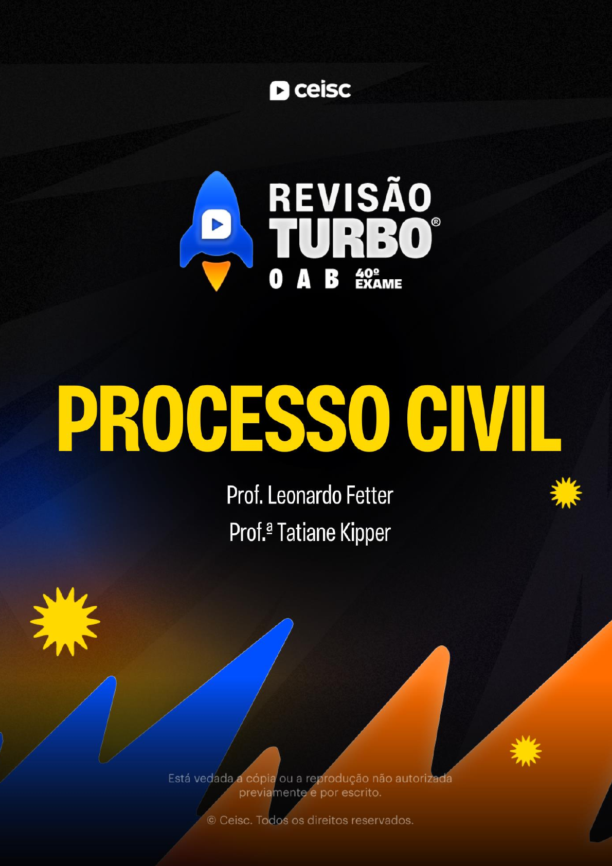 Revisão Turbo | 40º Exame de Ordem Processo Civil 1 Revisão Turbo | 40º Exame de Ordem Processo Civil 2 Revisão Turbo | 40º Exame de Ordem Processo Civil 3 Processo Civil Revisão Turbo | 40° Exame da OAB Sumário Aula 15/03/2024 – part. 01 ........................................................................................................... 4 Aula 18/03/2024 – part. 02 ......................................................................................................... 17 Revisão Turbo | 40º Exame de Ordem Processo Civil 4 Aula 15/03/2024 – part. 01 1. Jurisdição, ação, rito/procedimento 1.1. Jurisdição A jurisdição é o poder-dever do Estado de compor/solucionar litígios. Assim, considerando as regras inerentes ao Estado Democrático de Direito, faz-se necessário identificar quem possui esse poder-dever, quem possui a responsabilidade de não deixar que os cidadãos, por suas próprias mãos, busquem solucionar um conflito de interesses. O Poder Judiciário é responsável pela jurisdição, o Poder Judiciário está investido em jurisdição. Compreende-se que esta função jurisdicional é delegada ao Poder Judiciário pelo Estado. Ainda, fala-se em poder-dever, uma vez que, o Poder Judiciário não pode abrir mão dessa responsabilidade. Quando um conflito de interesses é levado até o Poder Judiciário, ele tem a obrigação de resolver, ele não pode negar a solução do litígio. Cabeção, importante: o exercício da jurisdição (este poder/dever de compor litígios) é inerte, ou seja, para ser exercido existe a necessidade de provocação (o juiz não tem autonomia para agir por conta própria, ou seja, de ofício, deve necessariamente ser provocado pela parte interessada, conforme o artigo 2º do CPC). É o chamado de princípio da ação ou da demanda, ou princípio da iniciativa da parte. 1.2. Ação A forma adequada do cidadão provocar o Poder Judiciário, retirando-o da sua inércia, é a ação, ou seja, é através da ação, que o Poder Judiciário sai da sua inércia e passa a exercer a jurisdição, o poder-dever de solucionar conflitos de interesses. O chamado direito de ação é abstrato (e não concreto), ou seja, para entrar com uma ação o autor não precisa ter o direito material garantido (perfeitamente possível, dessa forma, que Revisão Turbo | 40º Exame de Ordem Processo Civil 5 uma ação seja julgada improcedente – pensar diferente se chegaria no absurdo de dizer que o autor somente poderia entrar com a ação se fosse ganhar – ou seja, o direito de ação para ser exercido deveria ser concreto). Importante: o sistema processual brasileiro definiu dois tipos de ação: ação de conhecimento e ação de execução. Apenas essas, então, são ações possíveis de serem apresentadas com o objetivo de busca a prestação jurisdicional. 1.3. Rito ou procedimento Frise-se, já de início, que rito ou procedimento são sinônimos. E, de forma bem objetiva e simples, o rito/procedimento nada mais é do que a forma (regras) estabelecida pela lei processual para o tramitar da ação perante o Poder Judiciário. Ou seja, a lei define a soma de atos processuais que deverão acontecer entre o início (petição inicial) e o fim da ação (sentença). Importante: identificado o pedido (a pretensão que a parte vai levar ao Poder Judiciário), será possível identificar o rito pelo qual este pedido vai tramitar perante o Poder Judiciário. Mas qual a forma desta identificação? Resolva a questão a seguir: 1) FGV – 2022 – OAB – 35º Exame de Ordem Unificado – Primeira Fase No âmbito de um contrato de prestação de serviços celebrado entre as sociedades empresárias Infraestrutura S.A. e Campo Lindo S.A., foi prevista cláusula compromissória arbitral, na qual as partes acordaram que qualquer litígio de natureza patrimonial decorrente do contrato seria submetido a um tribunal arbitral. Surgido o conflito, e havendo resistência de Infraestrutura S.A. quanto à instituição da arbitragem, assinale a opção que representa a conduta que pode ser adotada por Campo Lindo S.A. Revisão Turbo | 40º Exame de Ordem Processo Civil 6 A) Campo Lindo S.A. pode adotar medida coercitiva, mediante autorização do tribunal arbitral, para que Infraestrutura S.A. se submeta forçosamente ao procedimento arbitral, em respeito à cláusula compromissória firmada no contrato de prestação de serviço. B) Campo Lindo S.A. pode submeter o conflito à jurisdição arbitral, ainda que sem participação de Infraestrutura S.A., o qual será considerado revel e contra si presumir-se-ão verdadeiras todas as alegações de fato formuladas pelo requerente Campo Lindo S.A. C) Campo Lindo S.A. pode requerer a citação de Infraestrutura S.A. para comparecer em juízo no intuito de lavrar compromisso arbitral, designando o juiz audiência especial com esse fim. D) Campo Lindo S.A. pode ajuizar ação judicial contra Infraestrutura S.A., para que o Poder Judiciário resolva o mérito do conflito decorrente do contrato de prestação de serviço celebrado entre as partes. 2. Petição inicial Quando existe um conflito de interesses e a pessoa não consegue solucionar de forma consensual com a outra parte, é necessário buscar no Poder Judiciário essa solução. O juiz não age por ofício nos processos, isto é, faz-se necessária a iniciativa da parte através da petição inicial. A petição inicial deve obedecer aos requisitos dos arts. 319 e 320 do CPC. Observação: toda petição inicial deverá ter, obrigatoriamente, valor da causa. O valor da causa, como regra, corresponde ao valor do pedido ou dos pedidos, caso ocorra a cumulação, ou seja, mais de um pedido, conforme o art. 292 do CPC. Contudo, importante observar o inciso III do art. 292 do CPC: “na ação de alimentos, a soma de 12 (doze) prestações mensais pedidas pelo autor”. Resolva a questão a seguir: 2) FGV – 2021 – OAB – 33º Exame de Ordem Unificado –
